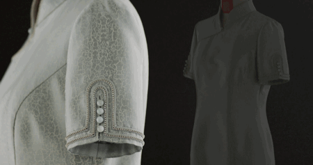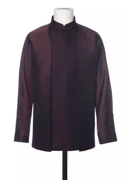 从款式和细节上采用中国设计元素,“黄帝”时期的连肩袖、宋唐的开襟,也有大盛于清的立领、对襟、盘扣等,是一种提炼的、整体化的中国风设计,同时在裁剪上也采用了中西结合的方式。