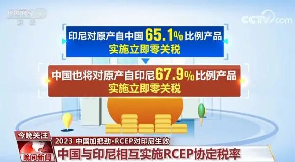 我国也将在中国—东盟自贸协定基础上,对印尼产菠萝汁和罐头、椰子汁、胡椒、柴油、纸制品、部分化工品和汽车零部件等降税,进一步开放市场。1月2日起,按照RCEP协定的承诺,印尼对原产自中国65.1%比例的产品实施立即零关税,中国也将对原产自印尼67.9%比例的产品实施立即零关税。