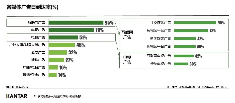 通过报告分析,国潮经济在各个消费细分领域依旧热度不减,已成为推动社会经济发展升级的重要引擎。同时,从报告所展示的典型案例看,品牌力成为驱动增长的关键要素,更多企业和行业正回归品牌价值创造。不确定性环境下,越来越多的消费者倾向于选择更稳妥,更具确定性,信赖感更强的品牌,因此,品牌成为企业真正的核心竞争力与护城河。聚焦品牌价值,持续品牌建设,才能形成更确定、更长期、可持续的增长驱动力。尤其在消费复苏时期,市场噪音降低,品牌敢于超额投放,将赢得更大的市场音量,抢占更大的市场份额,从而更快提升品牌集中度。在此过程中,高覆盖、高质量、高影响的媒体成为推动品牌增长的重要保障。根据凯度《2021年中国城市居民广告关注度研究》,互联网、电梯、电视是三大核心到达媒体,覆盖主流城市主流人群最广,其中互联网到达率95%,电梯到达率79%,电视到达率51%。由于高频触达,消费者对于电梯媒体、社交媒体、短视频的广告记忆数量最多。对线下媒体如电梯媒体、影院媒体驱动消费者的品牌购买意愿更强。