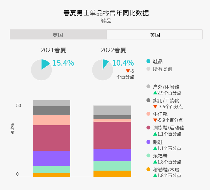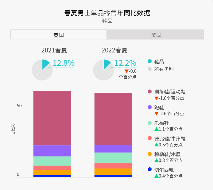 呼应WGSN 革新经典主题中极简而又前卫的设计风格,经典的便士乐福鞋在鞋类市场中略有增长,在英国地区同比增长1.1个百分点,美国增长1.8个百分点。
