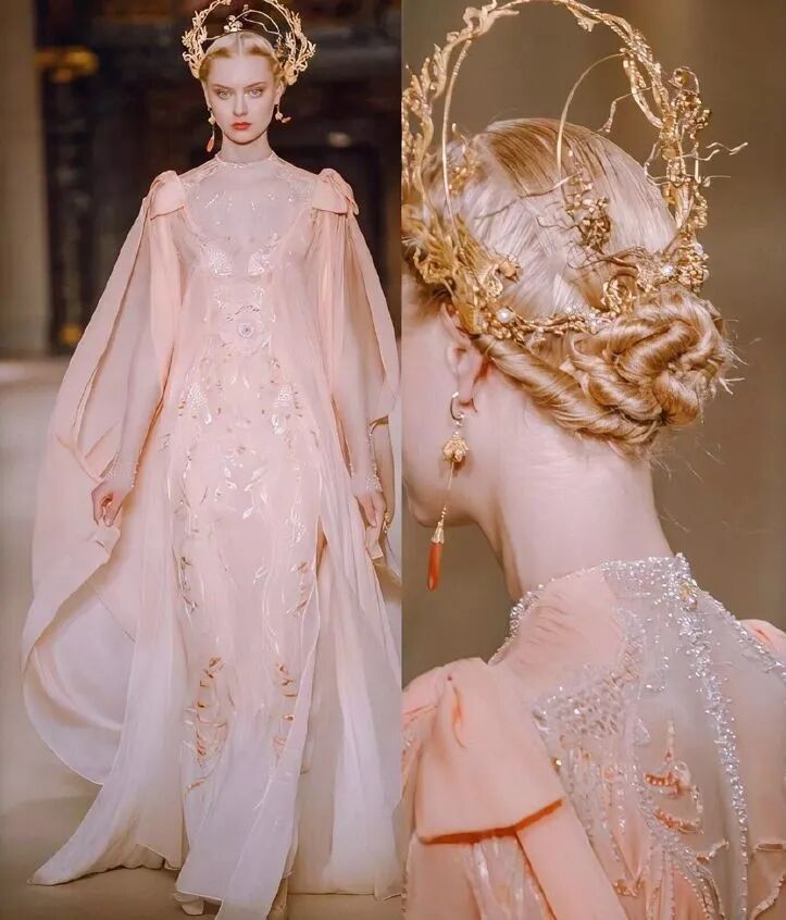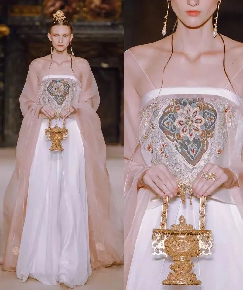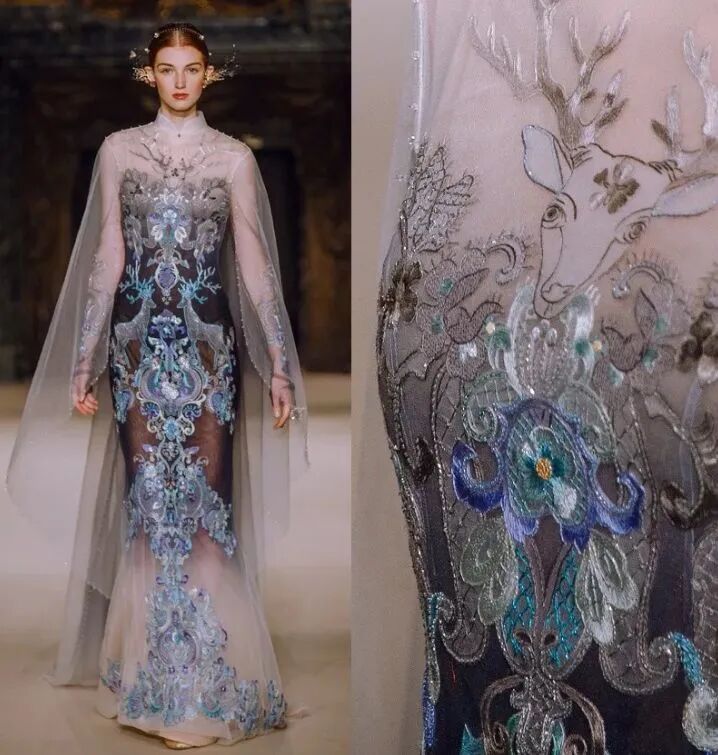 这些神话故事从来不是遥远的,都会在秀场中真实地展现出来,用轻盈薄纱来承载厚重的历史,用创新刺绣来道出远古的传说,用巧妙设计传递中国韵味。