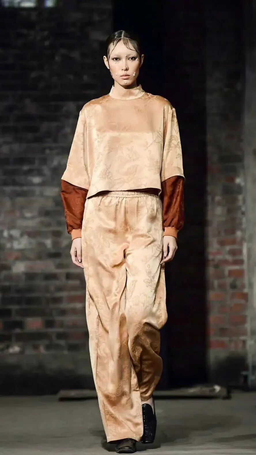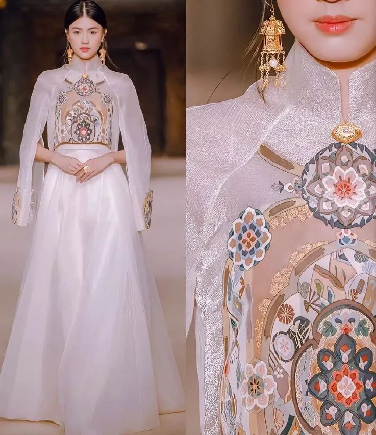 面料上,主要采用典型东方丝绸,如非遗缂丝 、宋锦、香云纱、重磅真丝等原料,植物染料棉、蕾丝为辅,通过刺绣、提花、手绘、珠片、串珠等重工艺等,同时把代表着西方贵族阶级蕾丝、“珍珠时代”文化运用到本次设计,让蕾丝和中式刺绣巧妙结合,加上中式传统手工艺,有力表达出丝绸的别样之美。