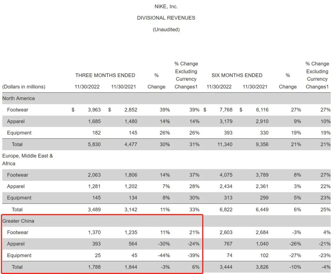 12月21日,耐克披露了截至2022年11月30日的2023财年第二季度业绩。耐克第二季度收入约为133.15亿美元,同比增长17%,高于分析师预期的126亿美元。净利润约为13.31亿美元,接近上年同期的13.37亿美元。耐克直销本季度销售额环比增长16%,达54亿美元,数字销售额环比增长25%。在过去几个季度中,批发收入基本持平,但本季度增长了19%。耐克首席财务官Matt Friend在电话会议上指出,公司本季度开展了大规模促销活动,假日季的销售势头一直持续到12月的前几周。分地区来看,耐克在其大本营北美市场的收入同比增长30%至58.3亿美元,在欧洲、中东及非洲市场,耐克录得34.89亿美元收入,同比增长11%,不考虑汇率影响增长33%。作为耐克的第三大市场,大中华区在该季度的总收入为17.88亿美元,低于分析师预期,同比下滑3%,不考虑汇率影响为增长6%。耐克表示,其在中国的产品需求有所增长。彭博社报道称,耐克的高管们表示,随着中国政府优化调整疫情防控措施,他们正密切关注市场情况。路透社报道援引Morningstar分析师David Swartz的观点称,耐克的大中华区业务仍然疲软,但最近几周正显现出复苏的迹象,“这对耐克来说是很大的利好。”David Swartz说。该季度,耐克的毛利率下降3%至42.9%。耐克表示主要是为了清库存而采取更大幅度的降价导致,在北美市场尤甚。此外,汇率也是一大不利因素,加上高企的货运与物流成本以及攀升的产品投入成本。定价策略部分抵消了这些挤压毛利率的因素。尽管如此,耐克的毛利率仍然超出了分析师的预期。据彭博社报道,耐克高管表示,本季度库存同比增长了43%,但这一数字其实有所夸大了。去年,越南工厂受疫情影响以及漫长的货运时间,扰乱了各地的零售业务,因此上年同期的库存水平异常的低。展望2023财年,耐克预计,在不考虑汇率影响的情况下,全年收入将增长低双位数(可理解为10%至15%),耐克维持全年毛利率下降2%至2.5%的预测。精彩推荐:
