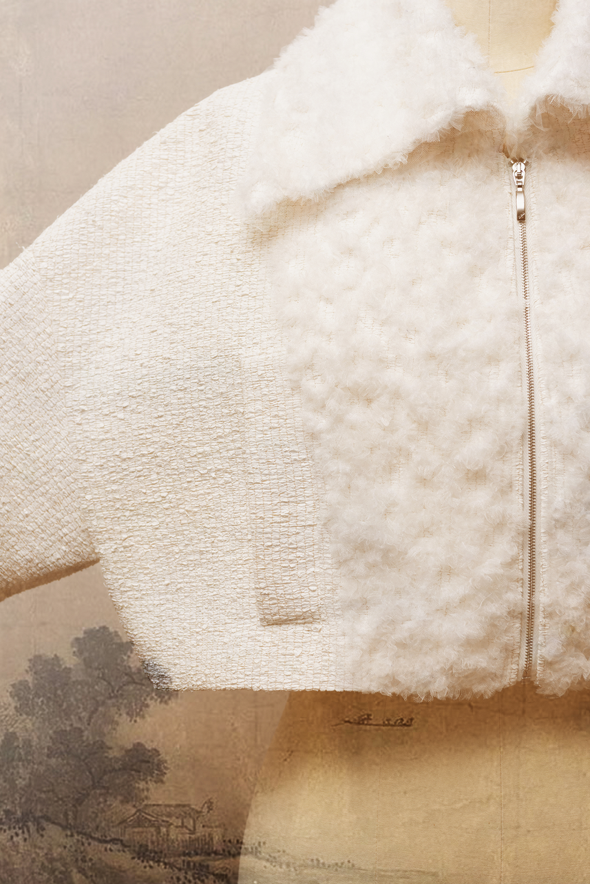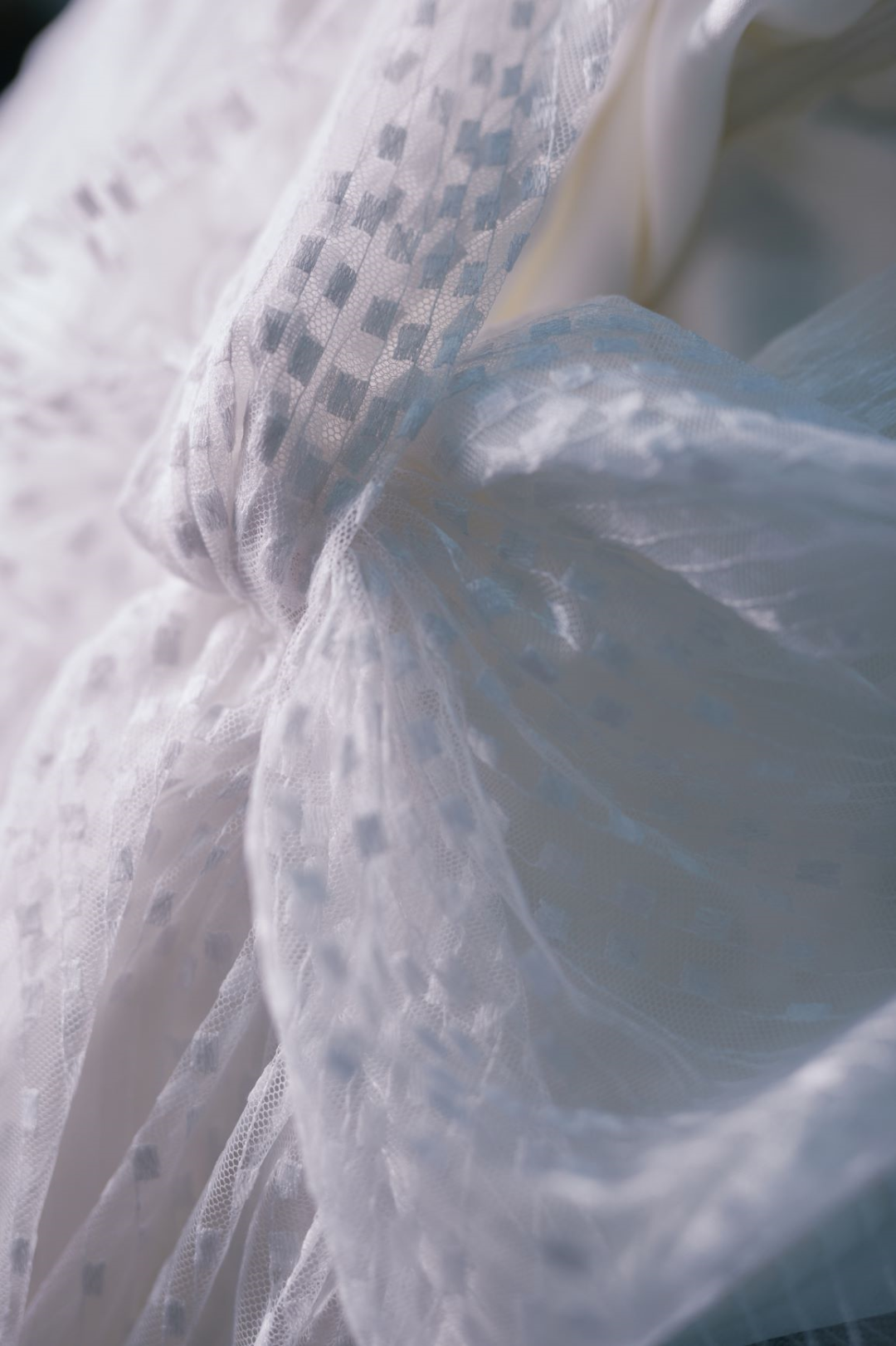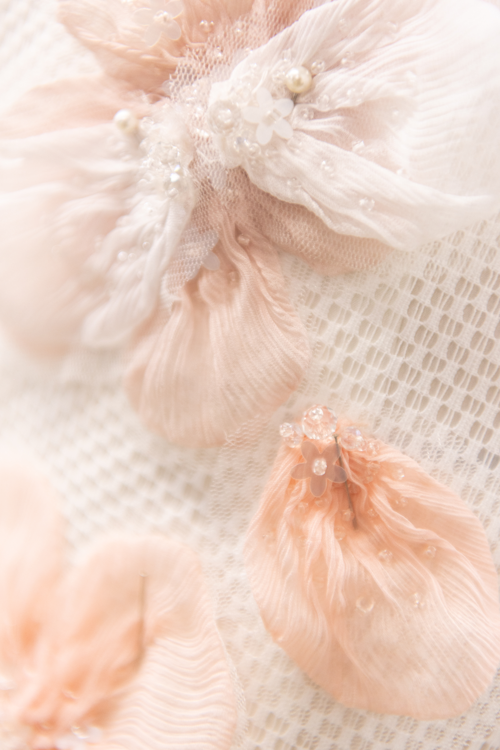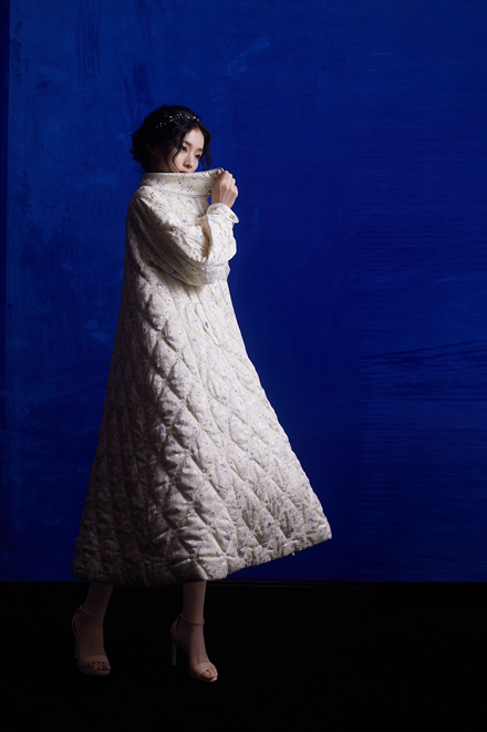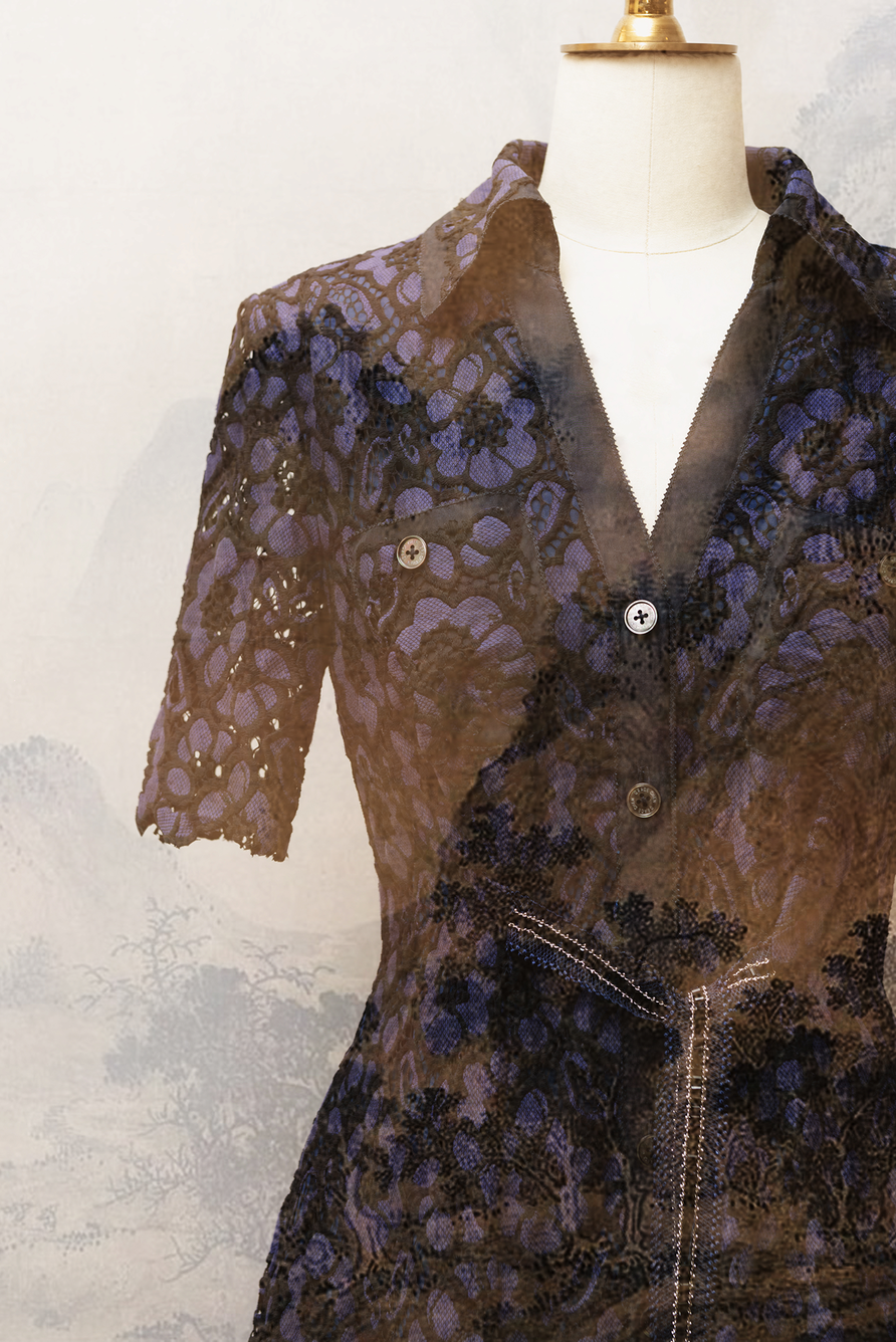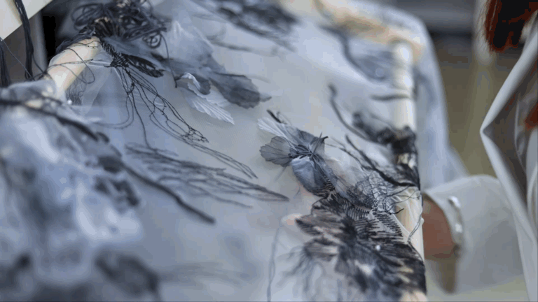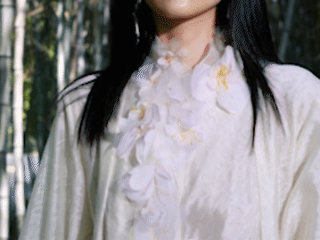 自带水墨效果的绣花面料柔软轻薄,恍若真有干湿浓淡、层层晕染,虚实相生间“花朵”于面料之上缓缓绽放,花之恬淡清雅、娉娉袅袅皆得精妙展现。