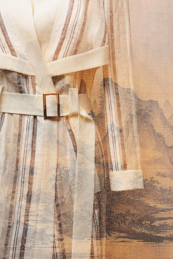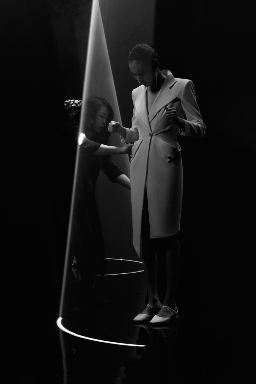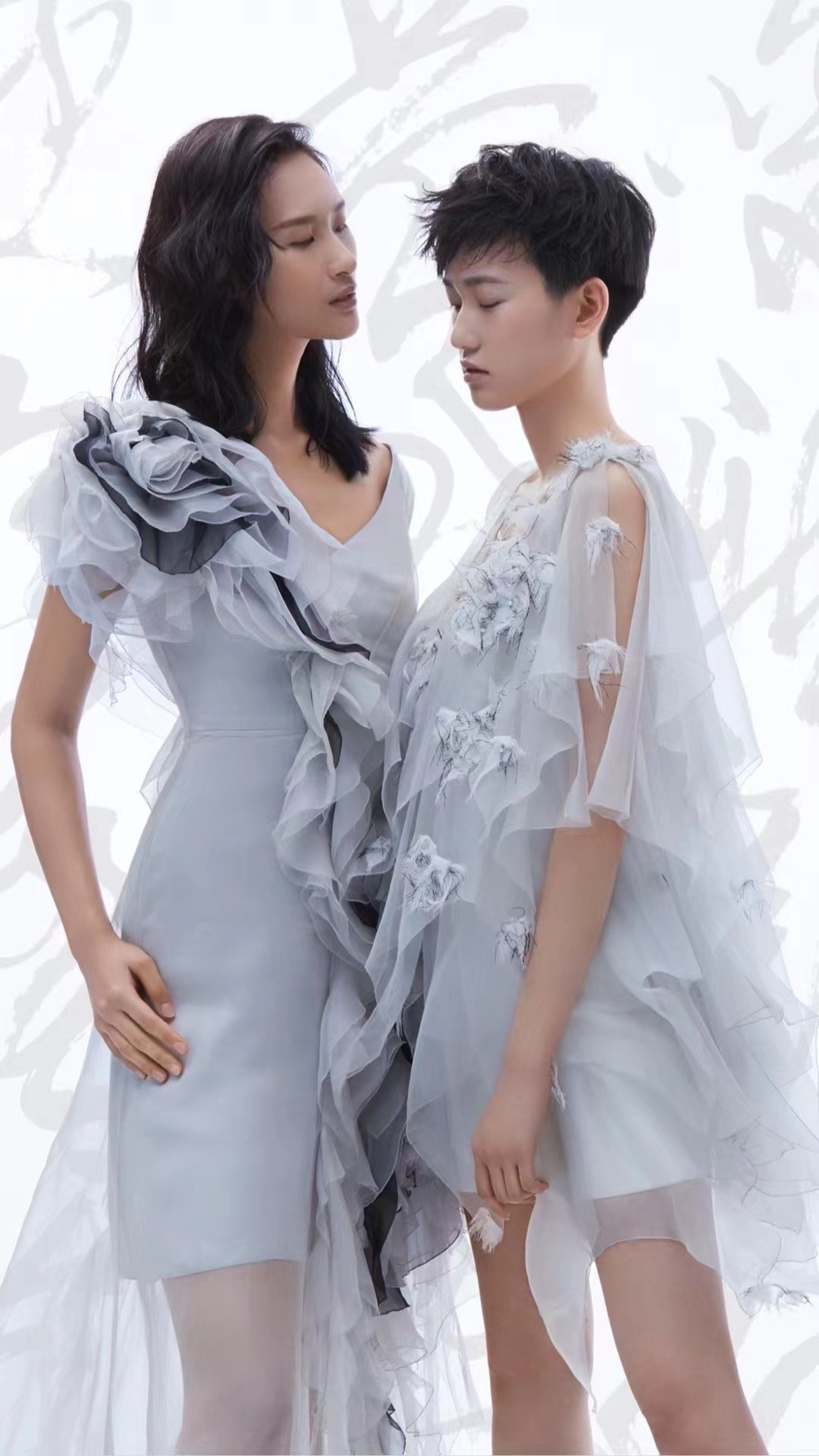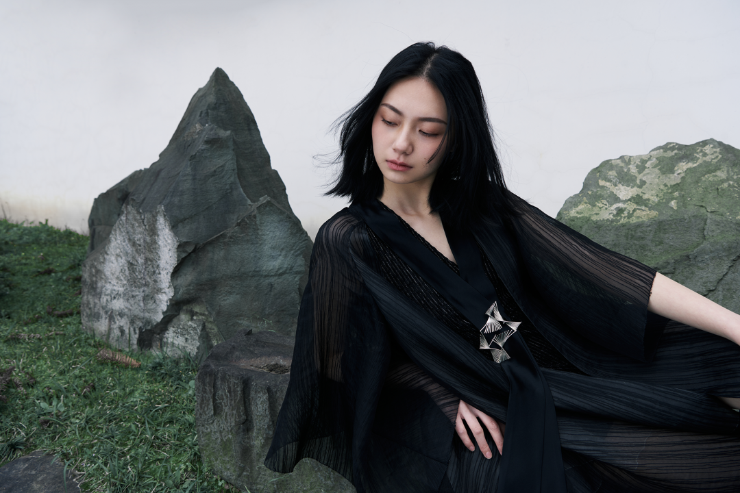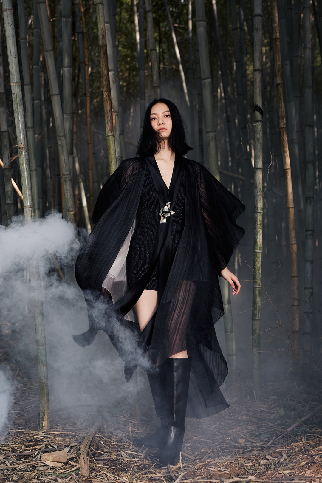 设计师将书法的最本质、最深奥的美学概念以服装的形式呈现——以字“形”的神塑造衣“型”的魂,不见一字,却依然能从服装中感知到节制、展促、流动…的书法之美。