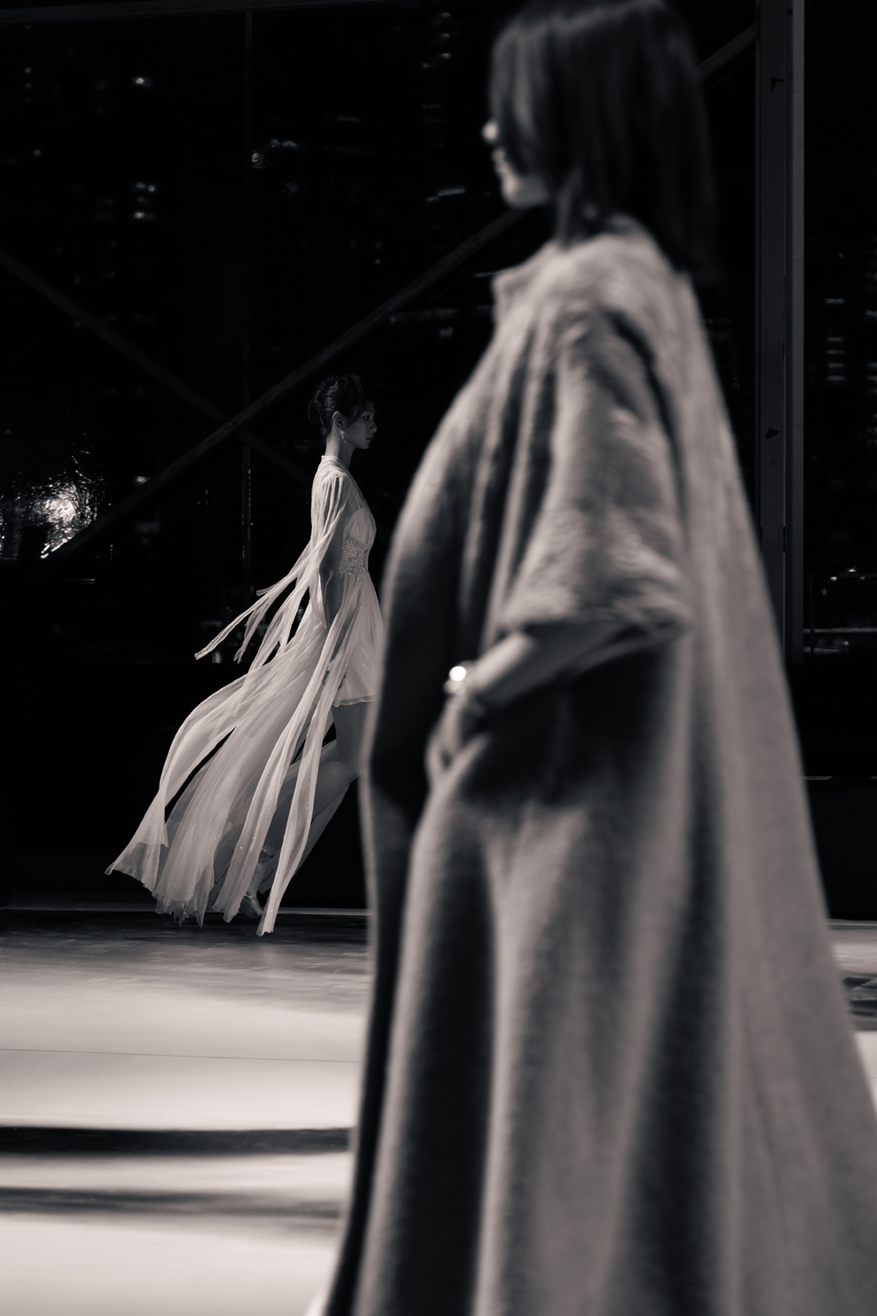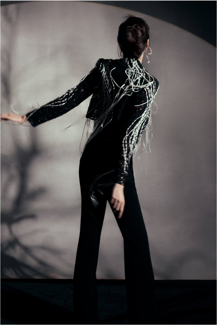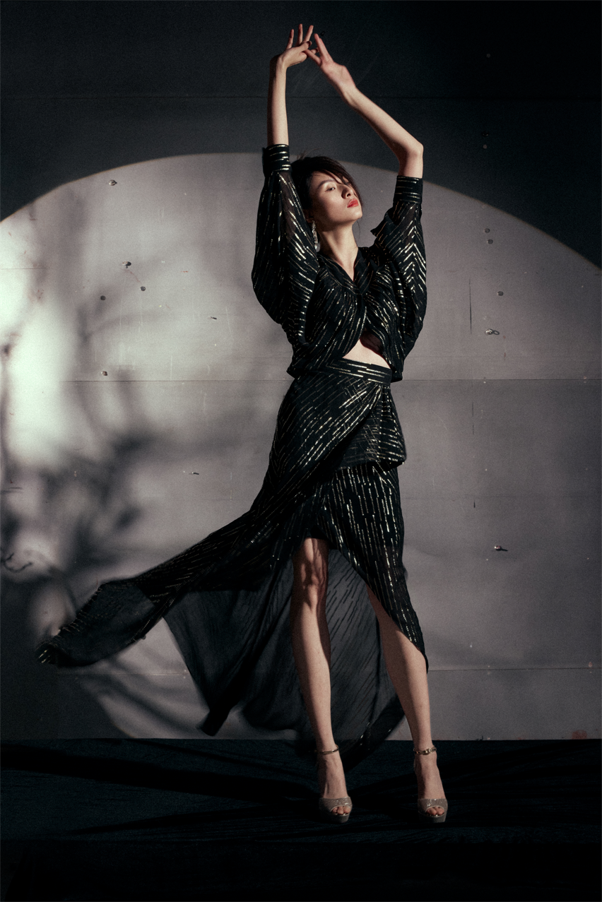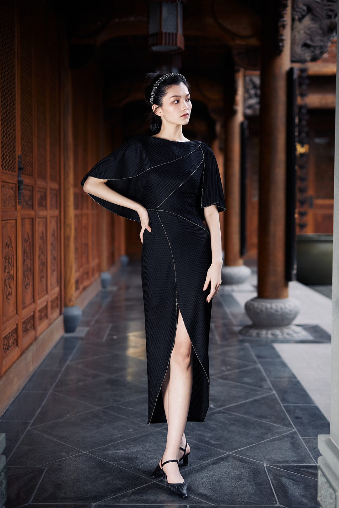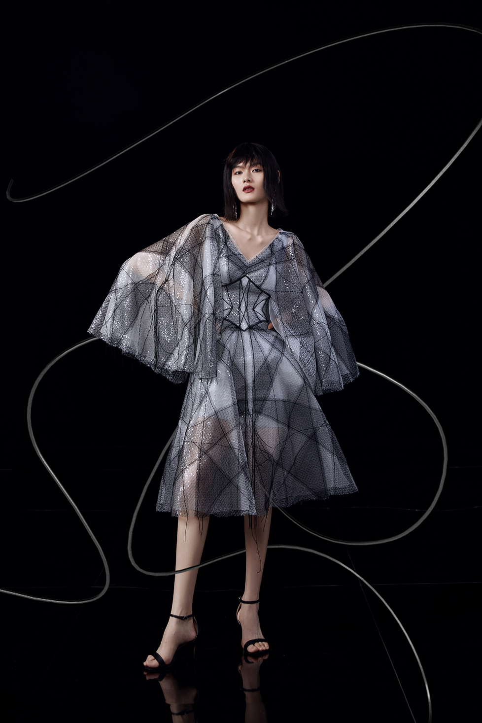 设计师将书法的最本质、最深奥的美学概念以服装的形式呈现——以字“形”的神塑造衣“型”的魂,不见一字,却依然能从服装中感知到节制、展促、流动…的书法之美。