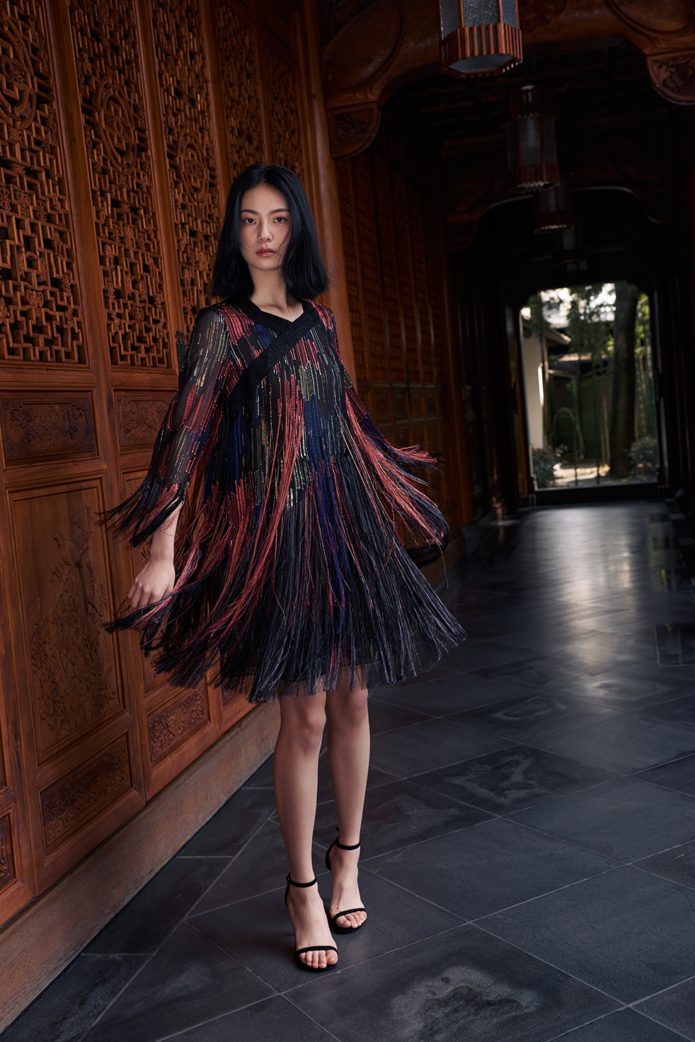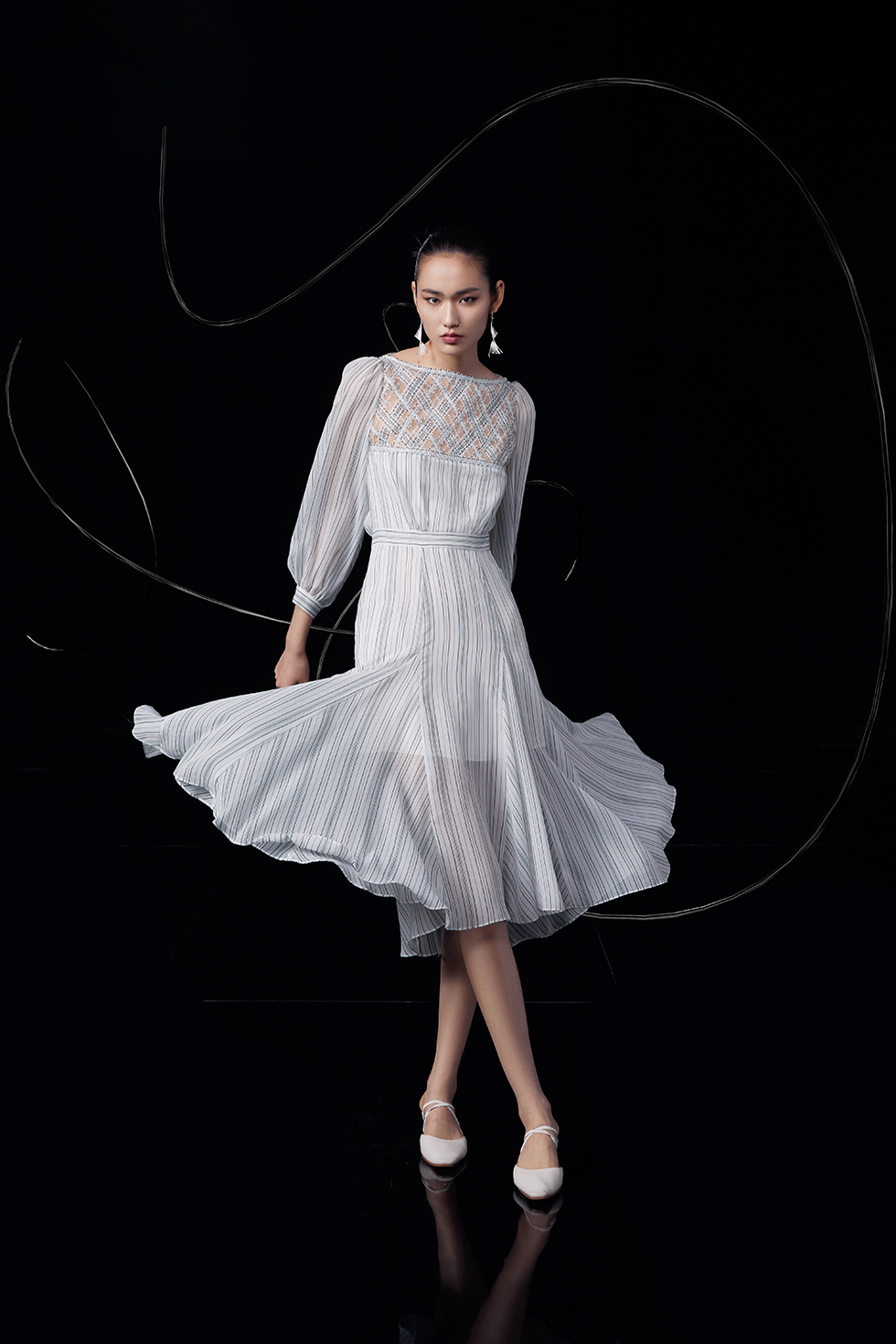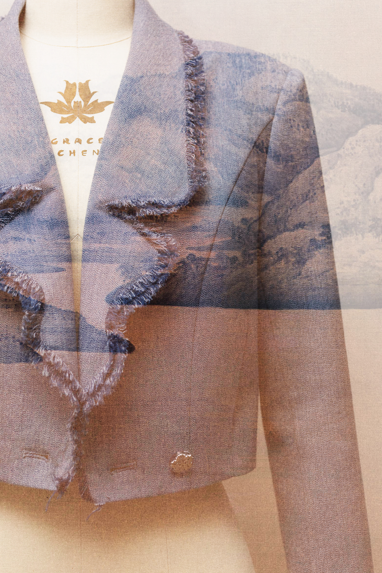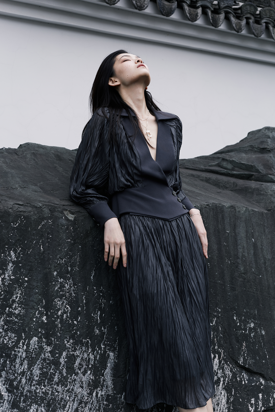 Grace Chen 以不同时代的书法字体为该系列的“型”,并以书法为灵感研究和创造了许多新面料和工艺。