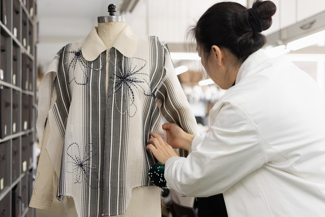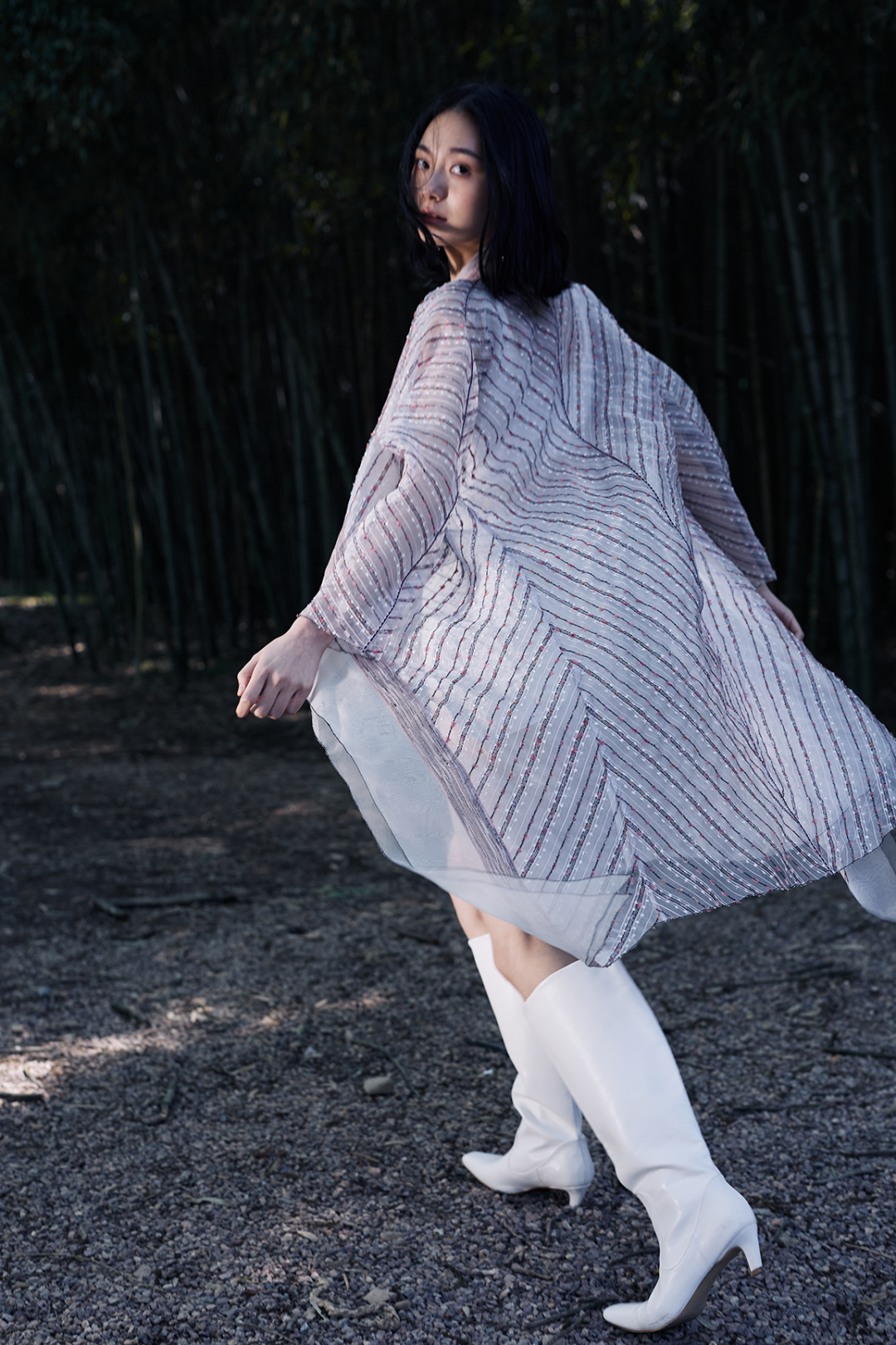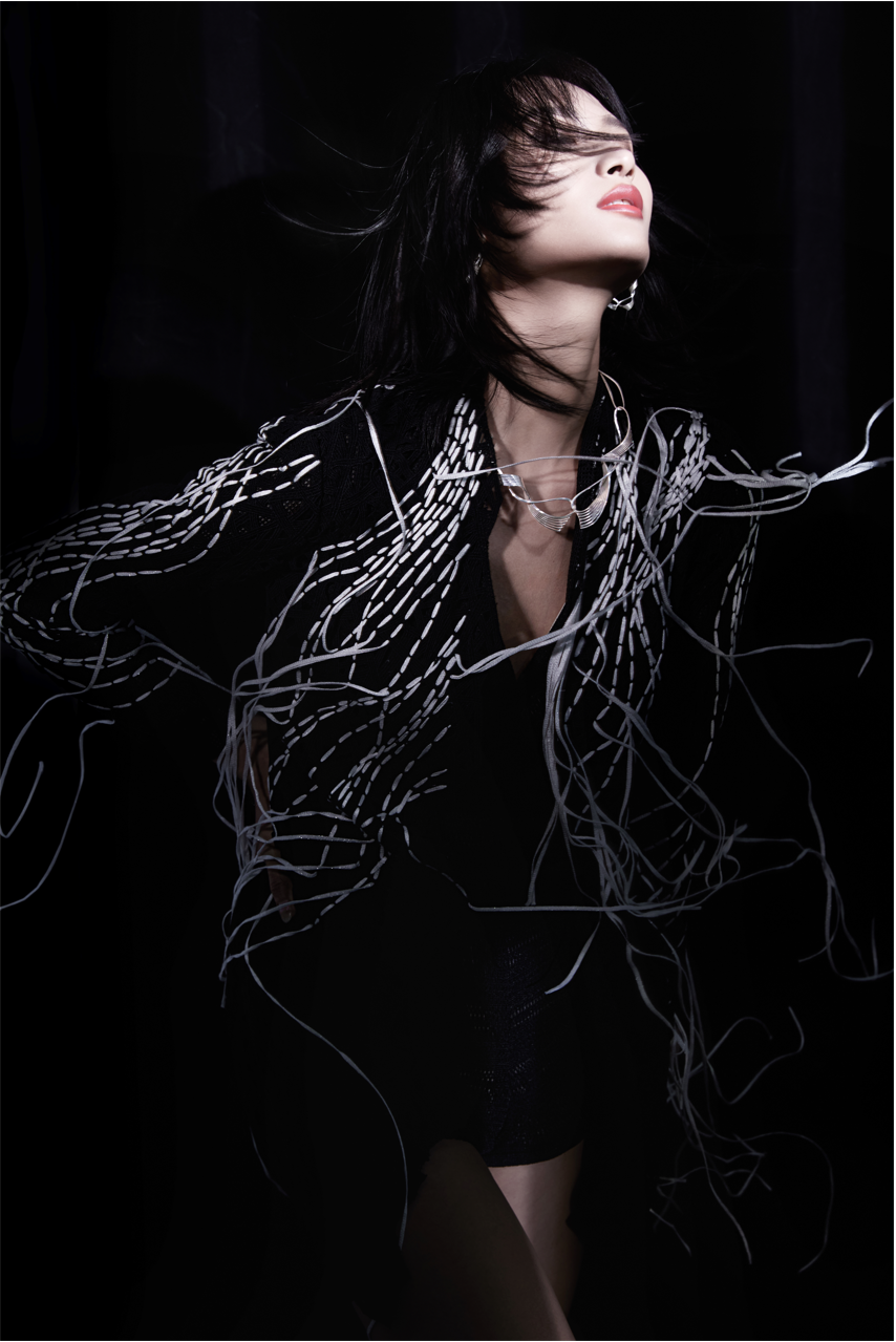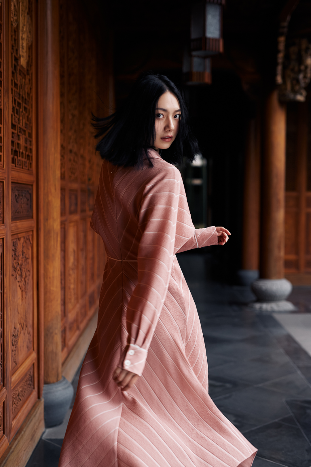 Grace Chen 以不同时代的书法字体为该系列的“型”,并以书法为灵感研究和创造了许多新面料和工艺。