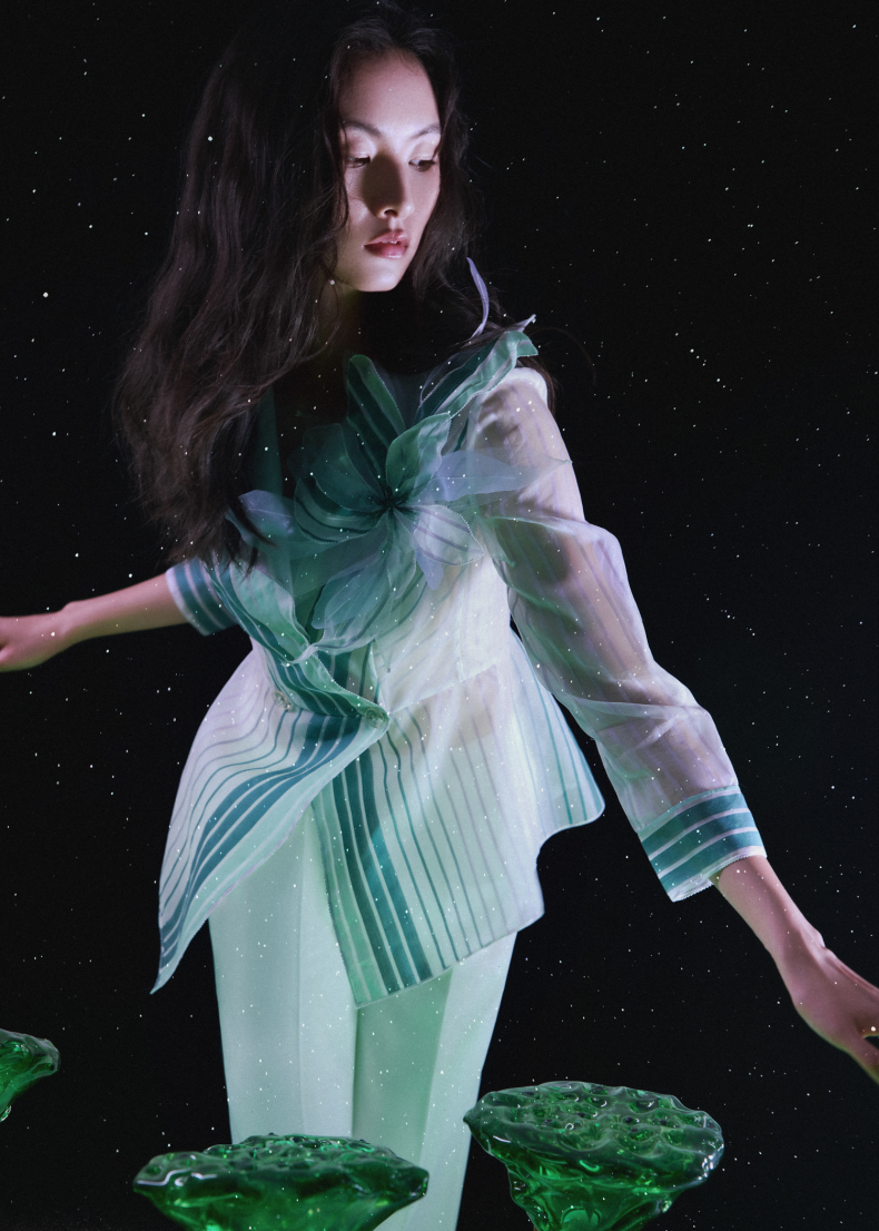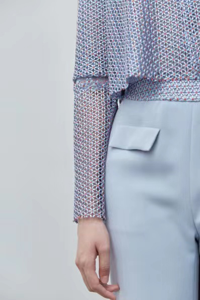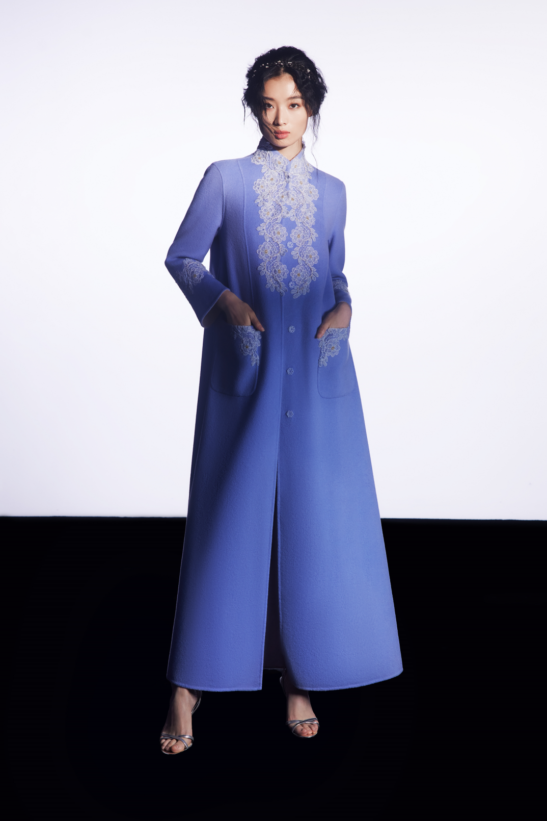 蕴含精美苏绣工艺的冰蓝色苏绣上衣拥有不同凡响的艺术质感,精致的手法与流畅飘逸的廓形完美融合。细腻的针脚薄如蝉翼的轻纱相映成趣,更显斯人如玉。