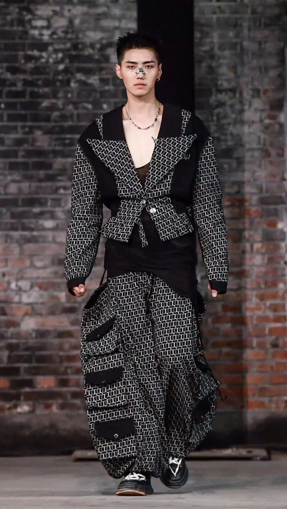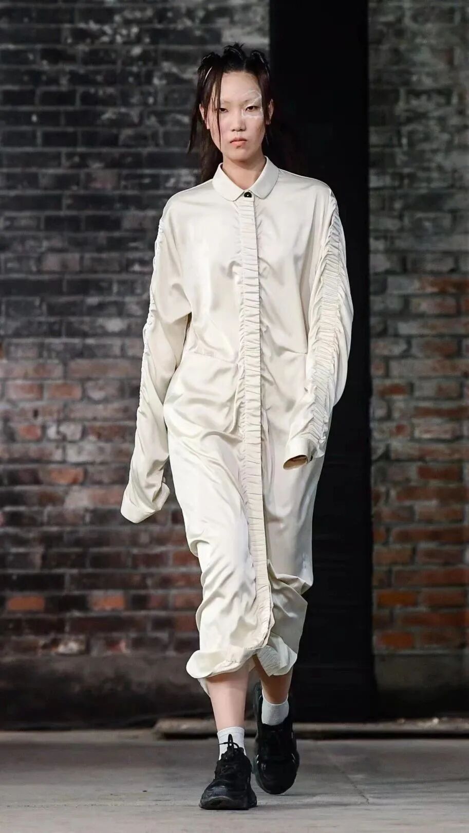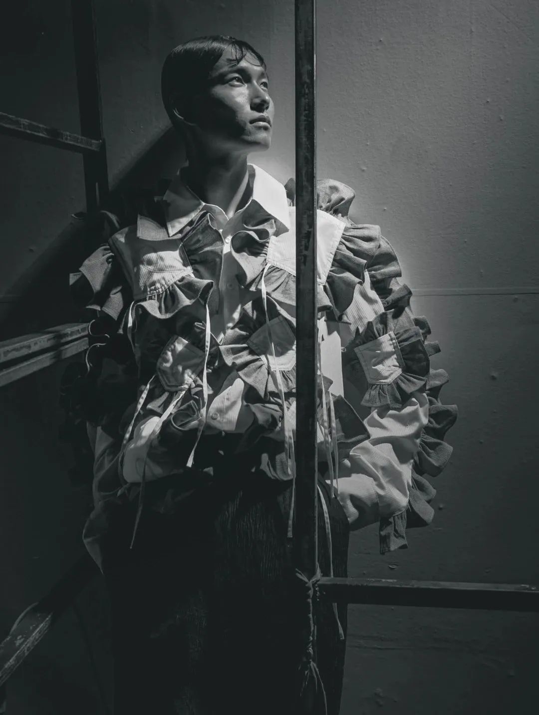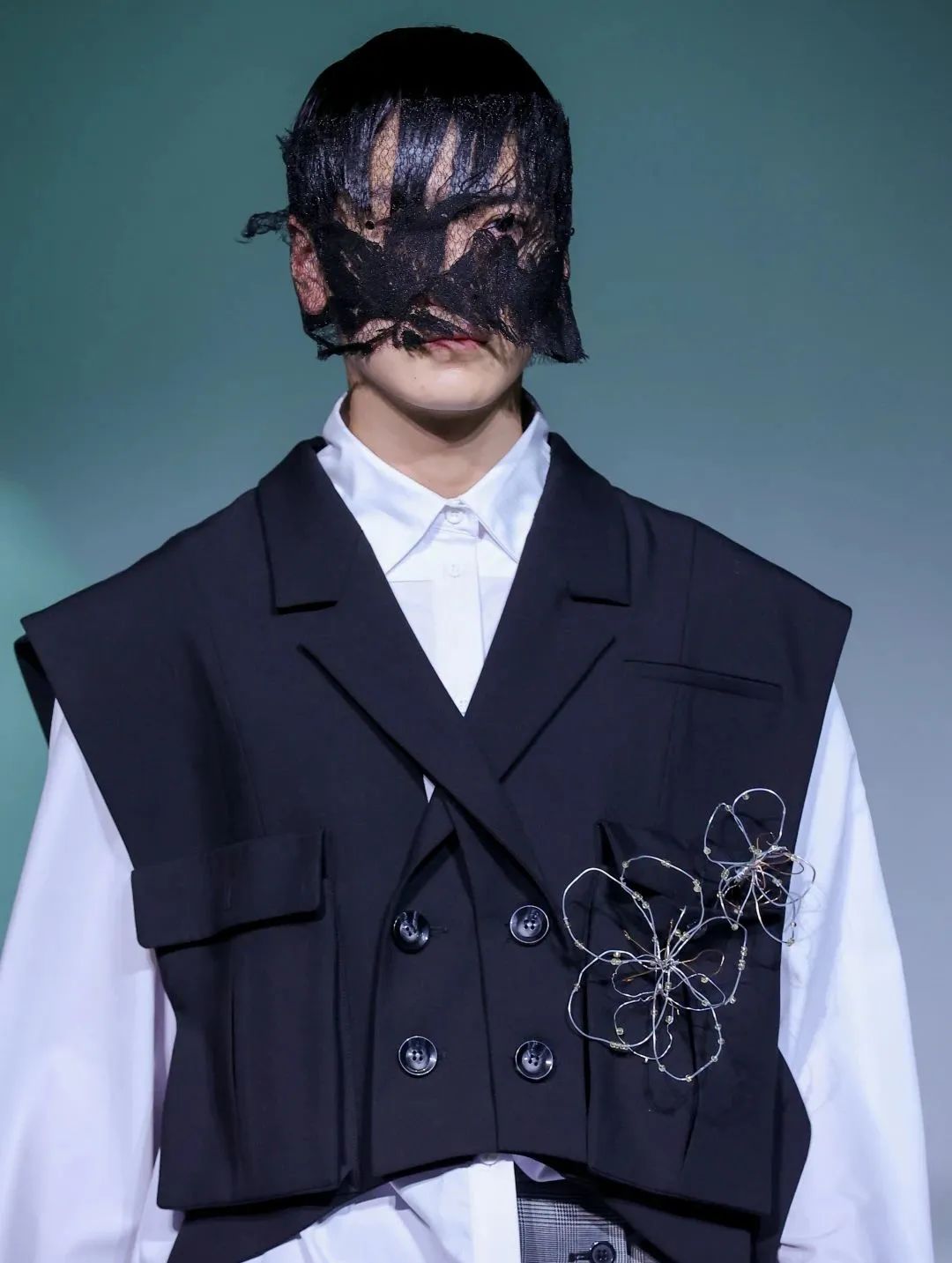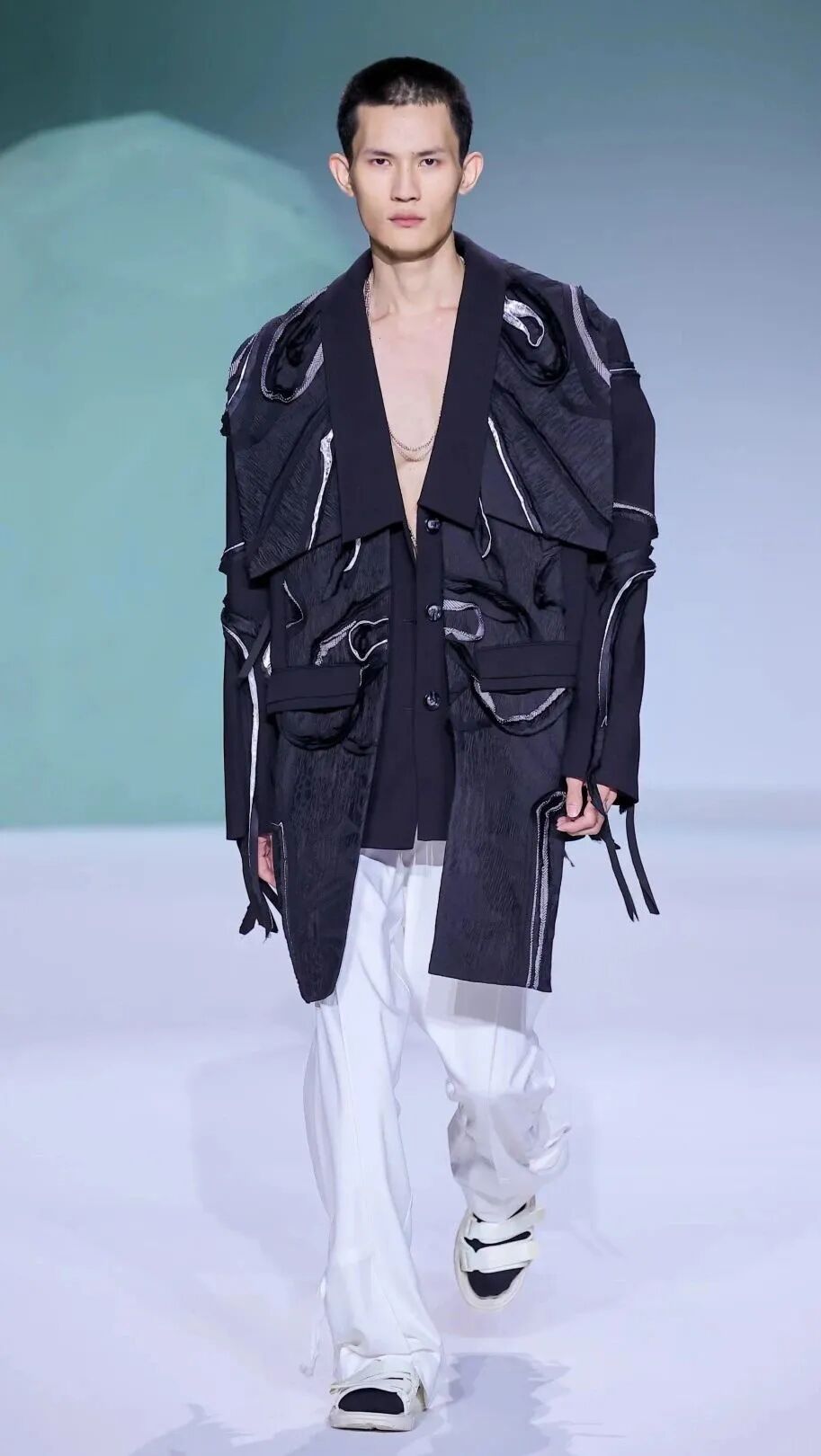 九五丝御品牌创始人余昌晟设运用相关设计手法对服饰支离破碎的或分解的面貌加以利用。本季发布系列延续了以往的解构美感,使用了多层次穿搭、不对称剪裁以及多种材质的叠加,将服装的结构通过强烈的对比清晰呈现。