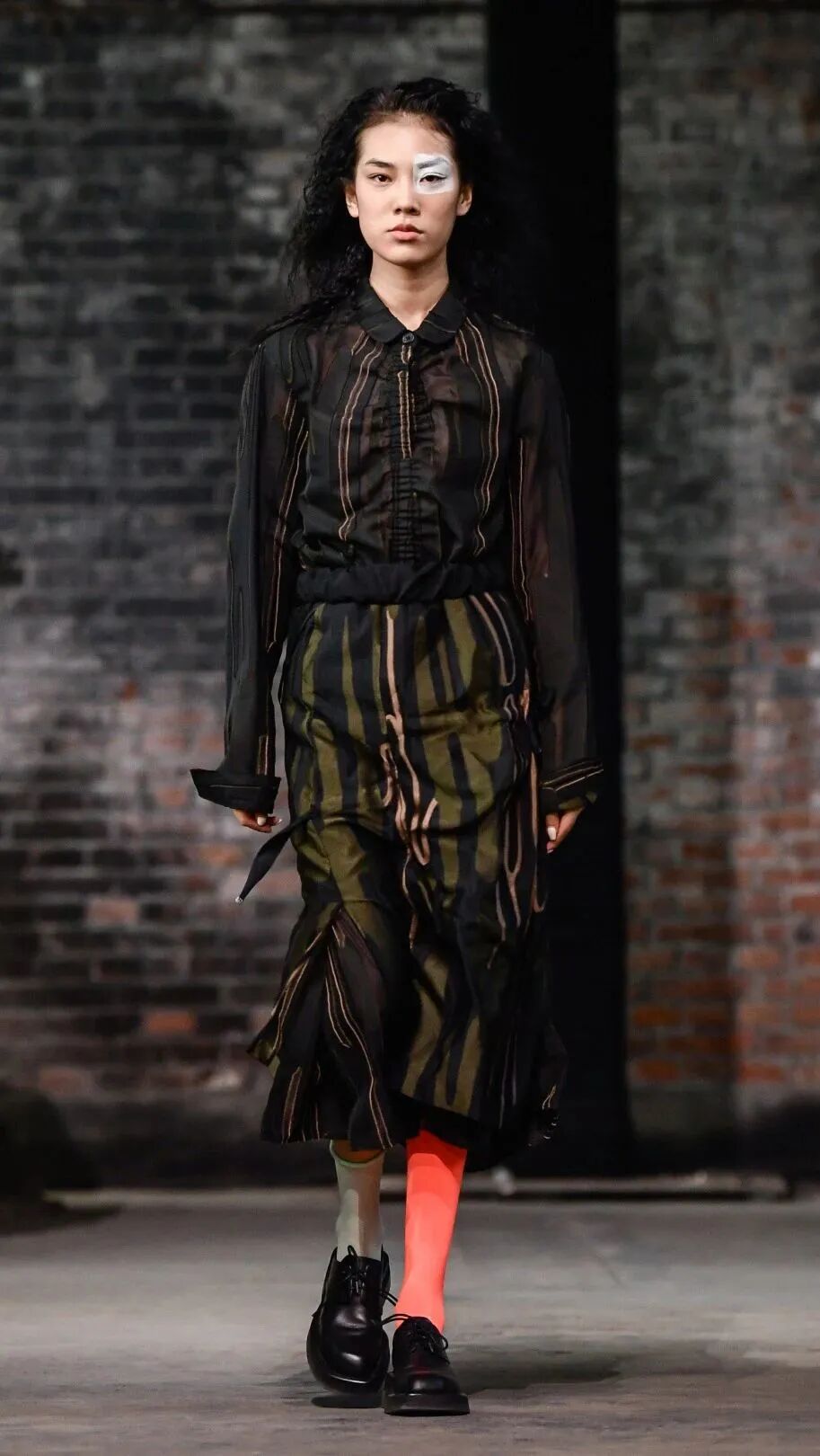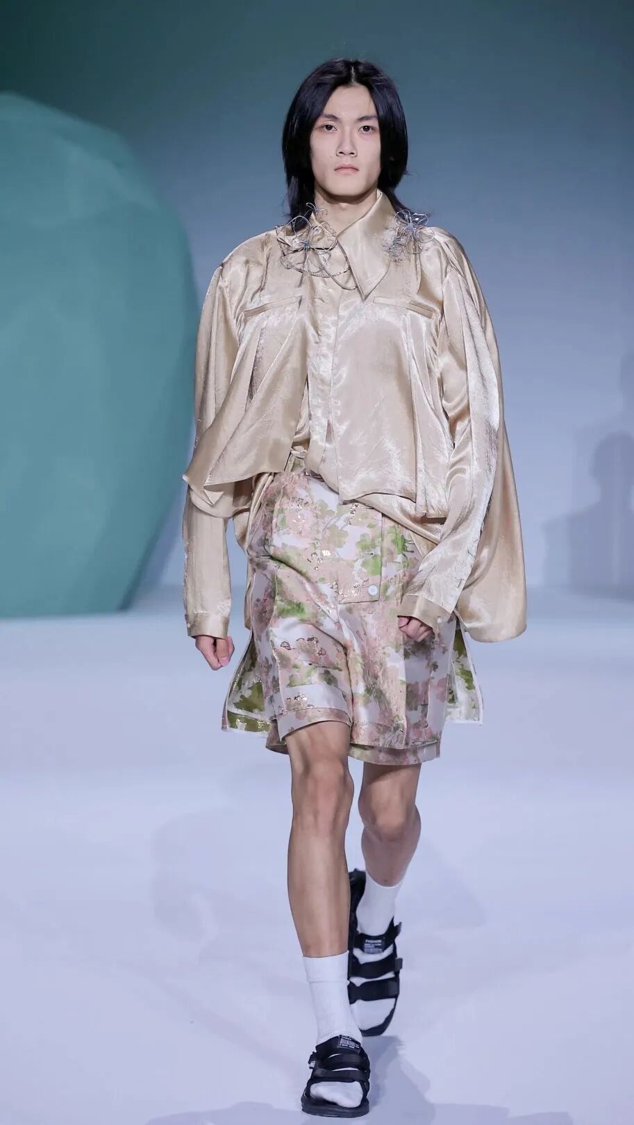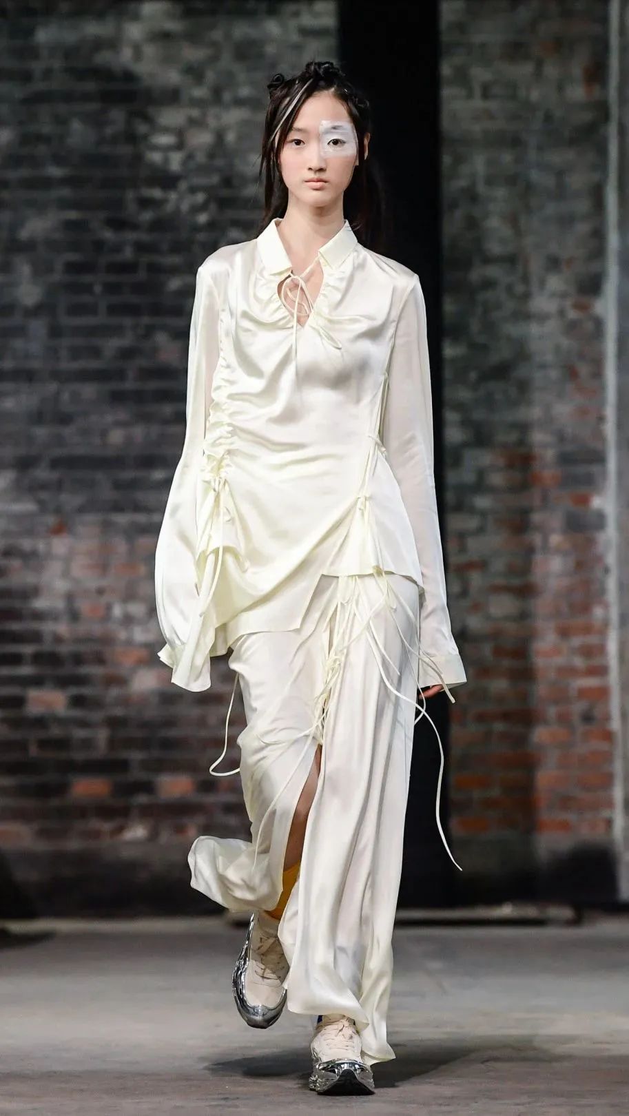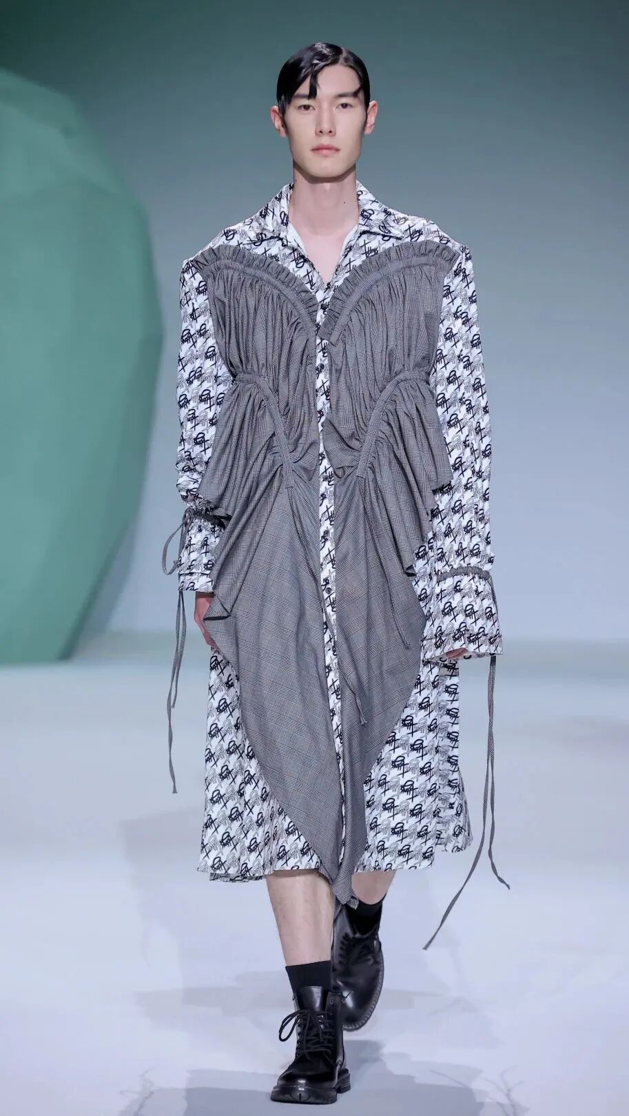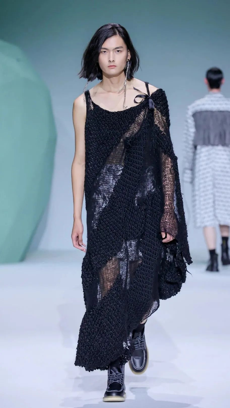 九五丝御品牌创始人余昌晟设运用相关设计手法对服饰支离破碎的或分解的面貌加以利用。本季发布系列延续了以往的解构美感,使用了多层次穿搭、不对称剪裁以及多种材质的叠加,将服装的结构通过强烈的对比清晰呈现。