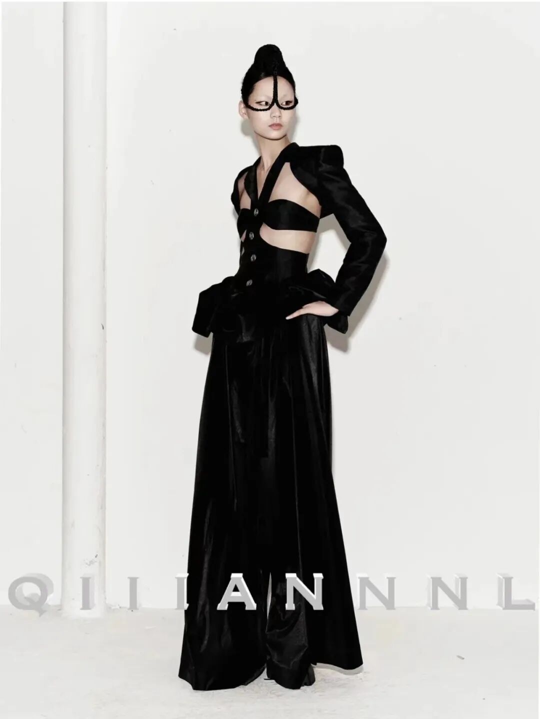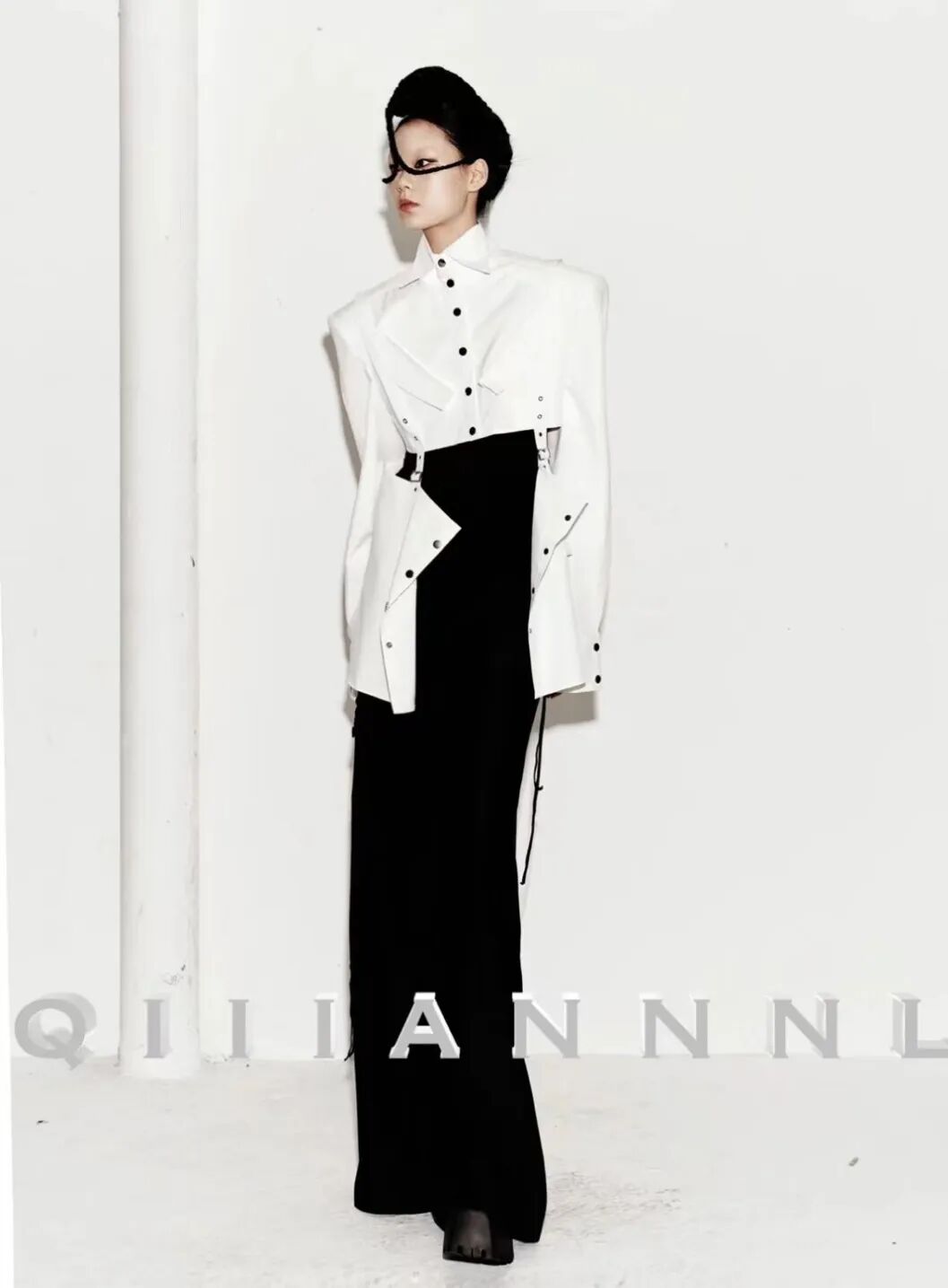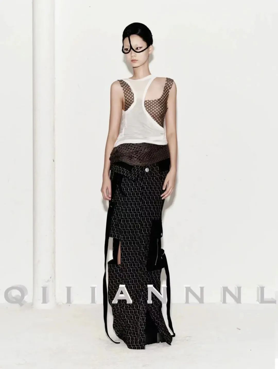2023春夏系列,金属拉链、金属搭扣、金属铆钉让套装不再沉闷,抽褶、镂空、不对称的设计让设计充满灵动。解构之下,那躁动与不安打破了人们对优雅的渴望,而QIIIANNNL又将实用性孕育其中,在修饰人体曲线的同时唤醒着心底澎湃的力量。