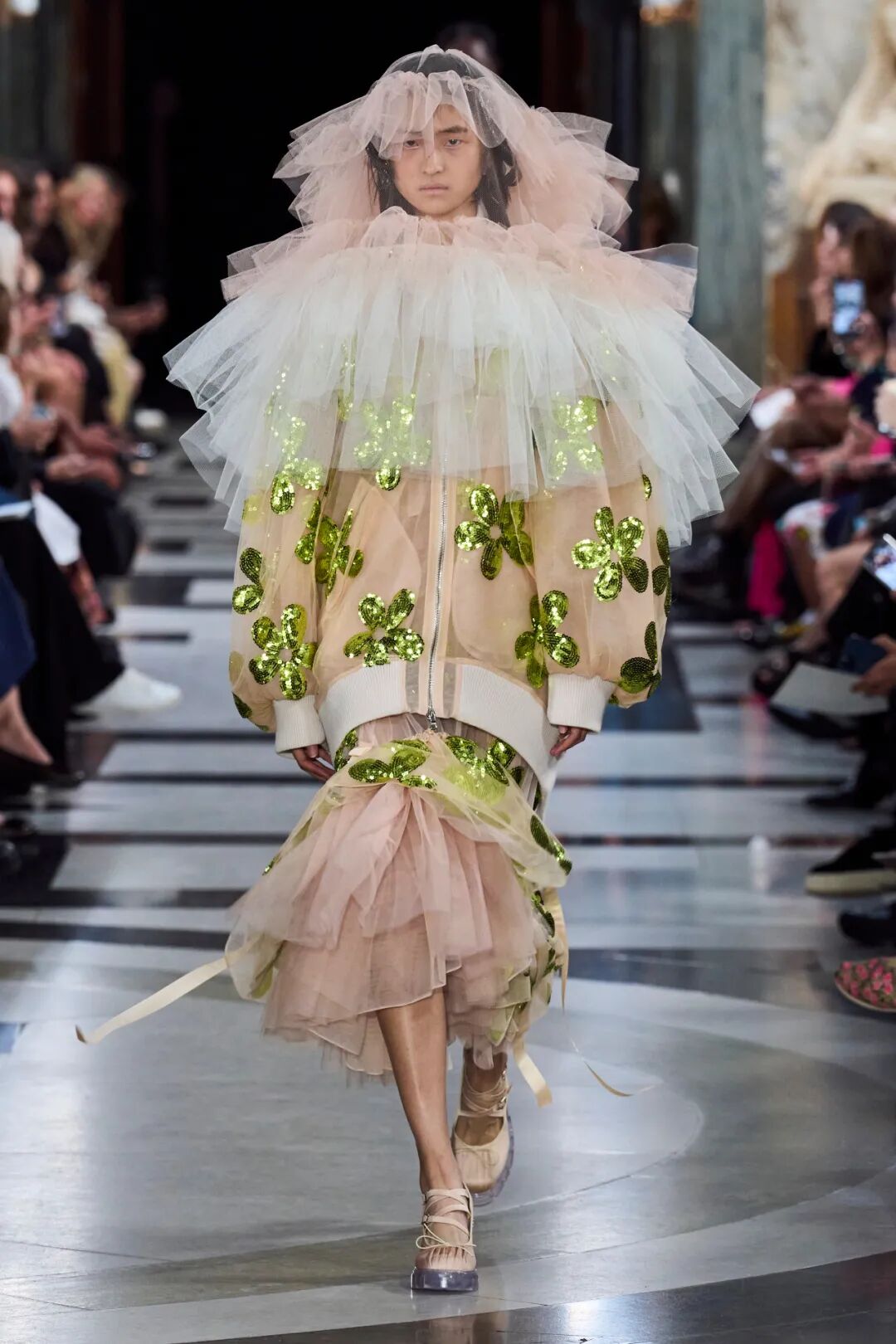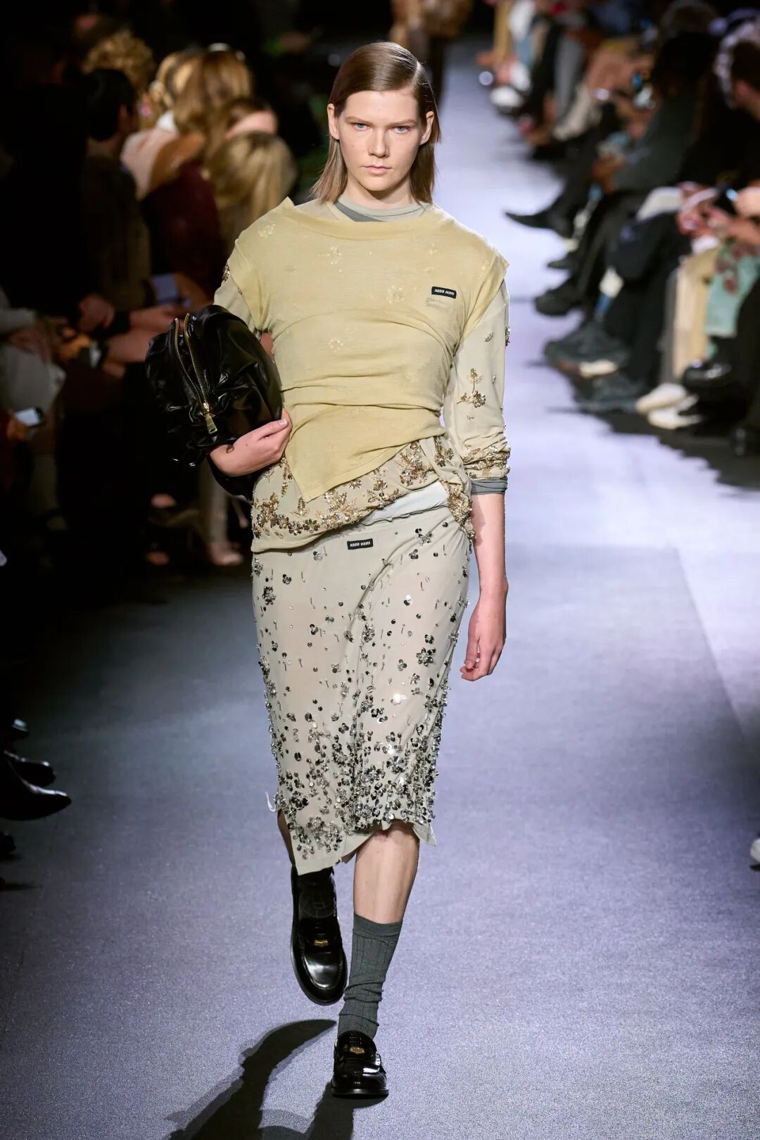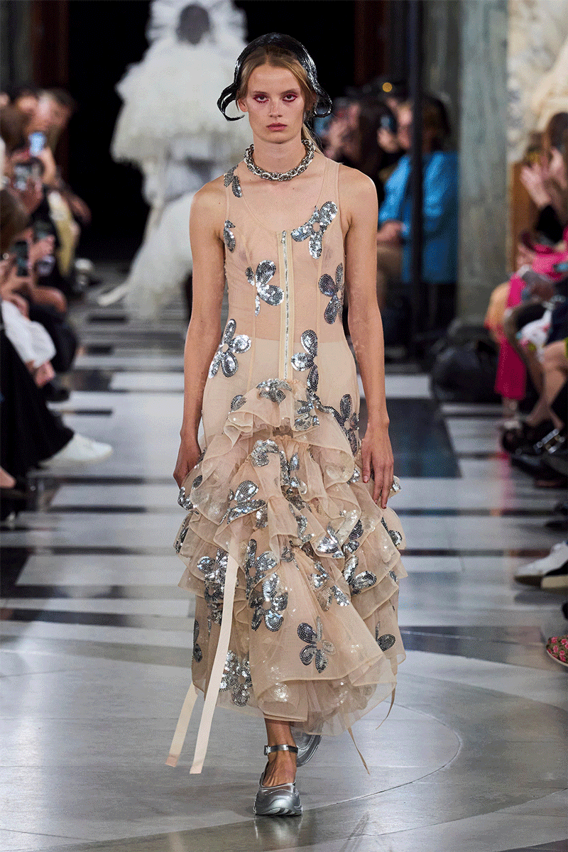 透明塑料亮片以鱼鳞排列方式装饰在单品上,更显少女浪漫;彩色反光亮片以花朵或发射状排列,趣味绚丽;簇状订花亮片与珠片及钻石元素组合,更高贵奢华。