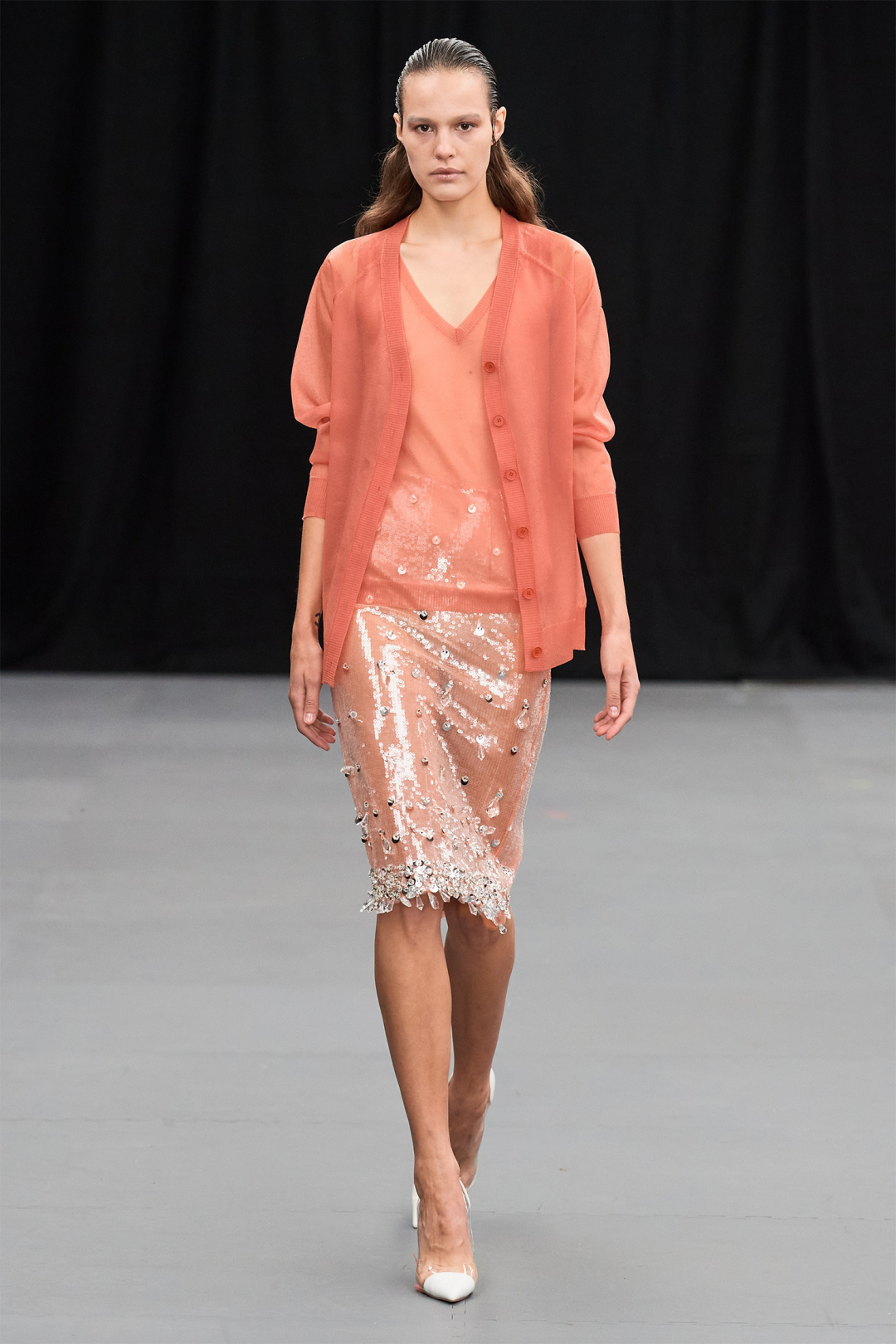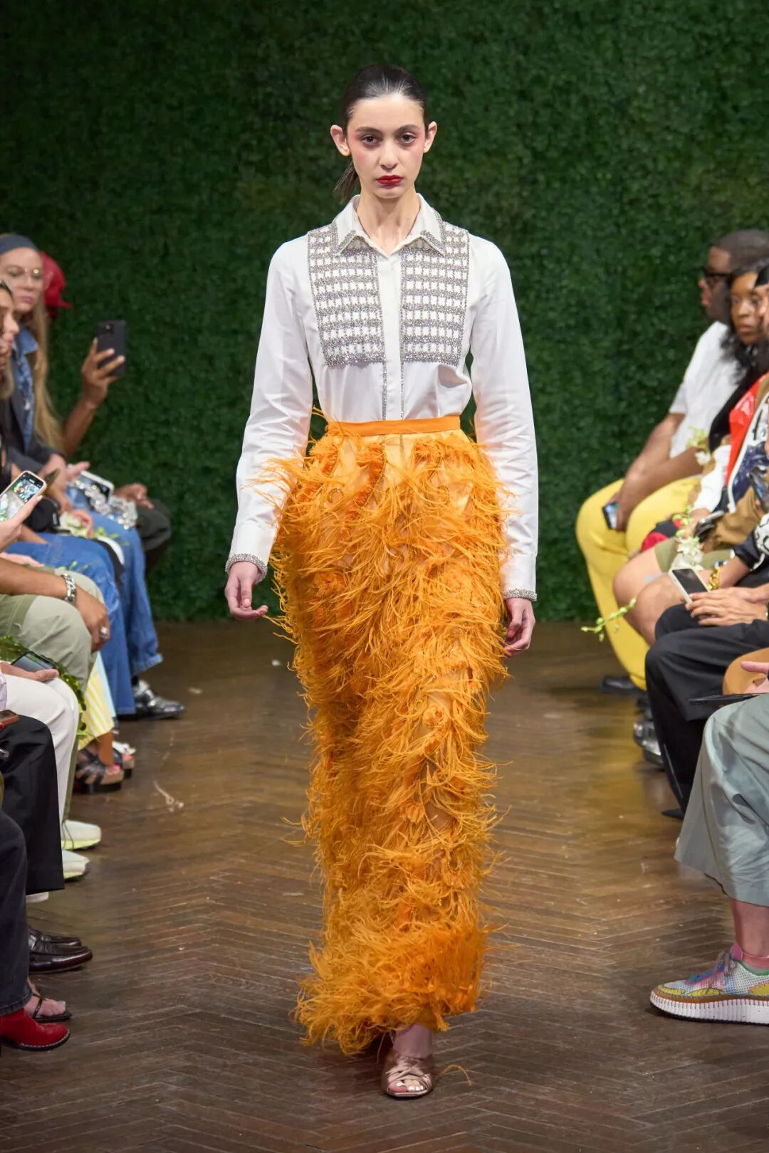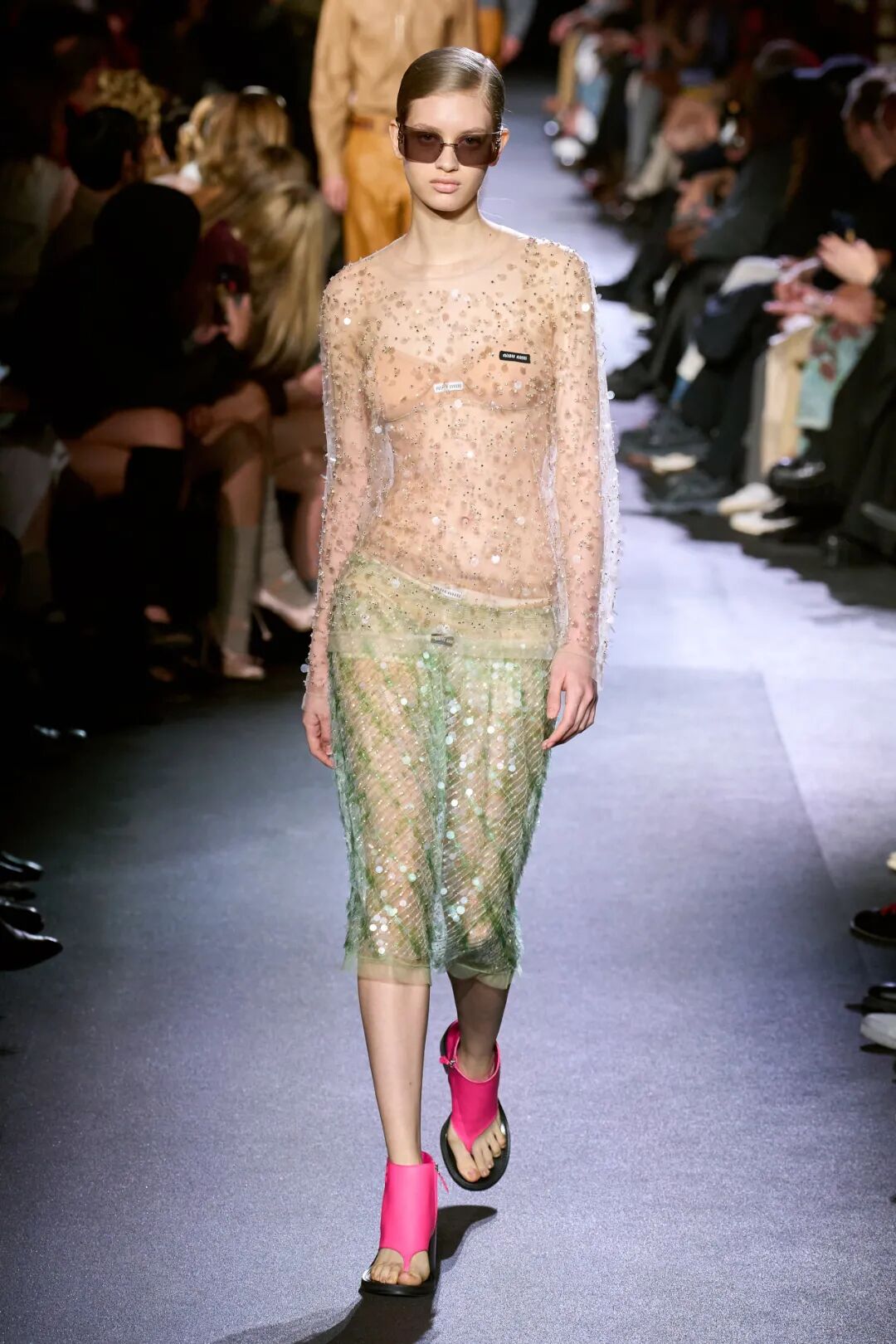透明塑料亮片以鱼鳞排列方式装饰在单品上,更显少女浪漫;彩色反光亮片以花朵或发射状排列,趣味绚丽;簇状订花亮片与珠片及钻石元素组合,更高贵奢华。