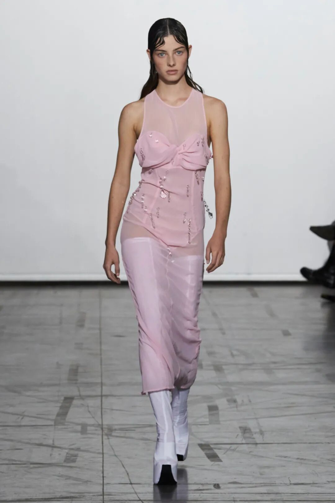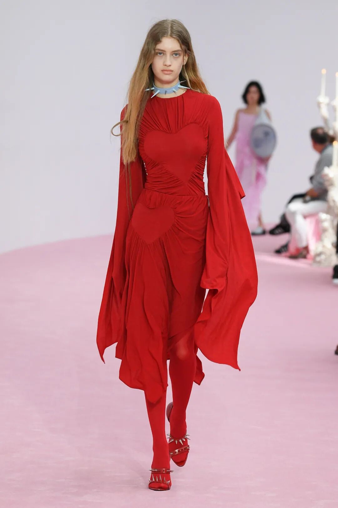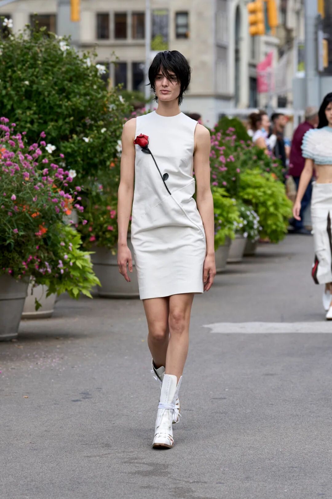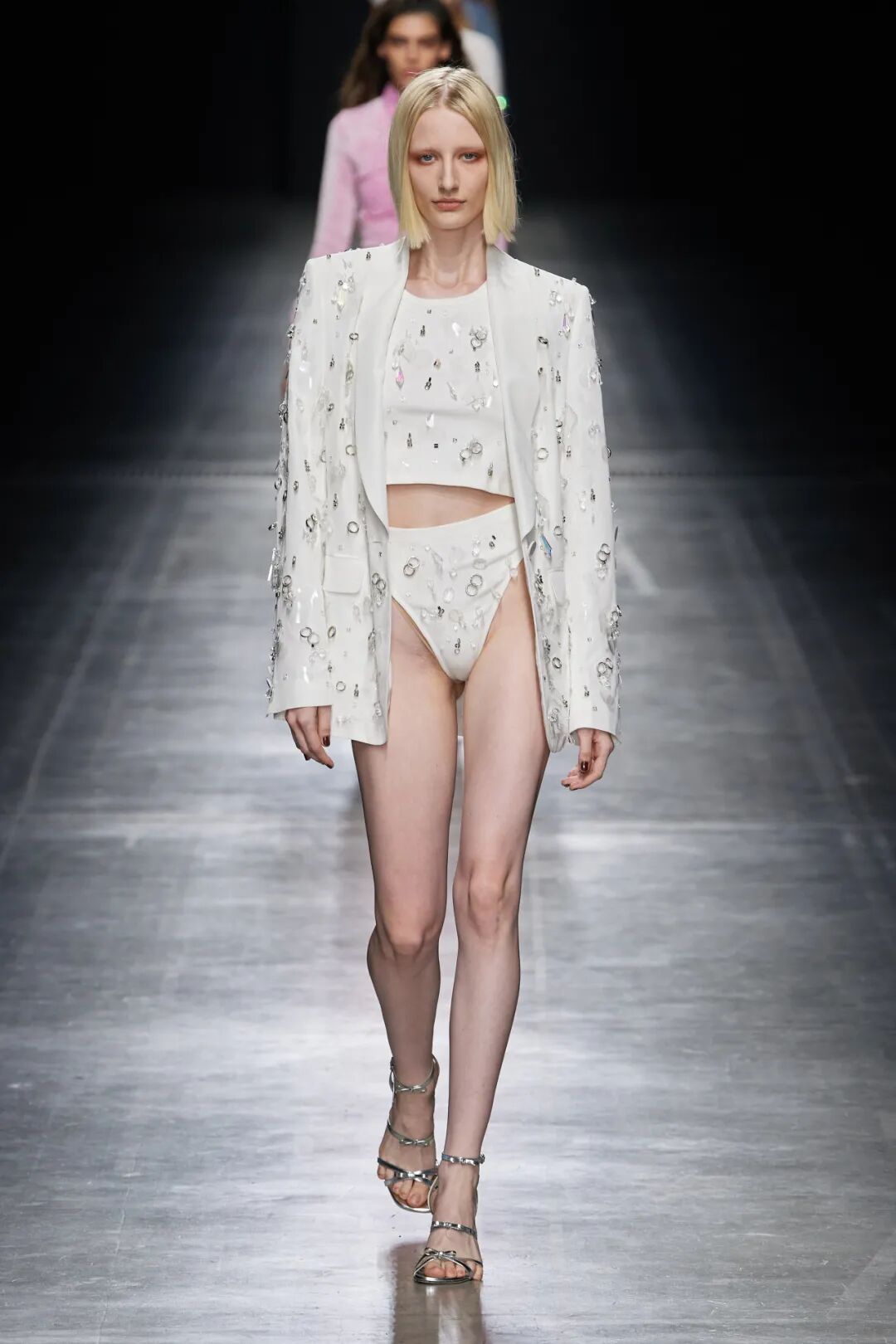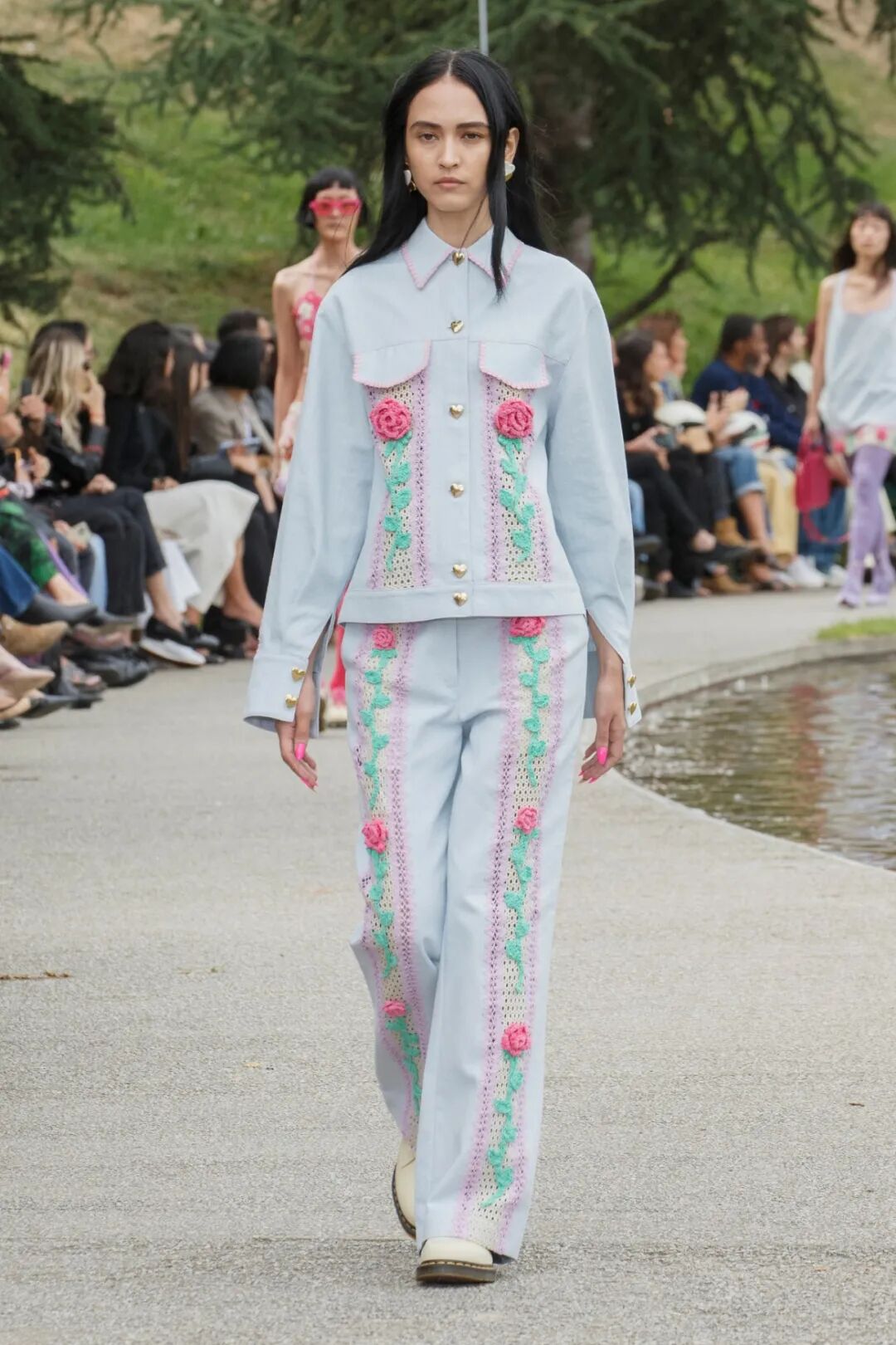 2023春夏女装T台工艺类别占比中,钻石装饰、蕾丝花边拼接、立体花朵和亮片面料拼接热度最高,其次为爱心型、亮片装饰、金属装饰、抓皱工艺等;从工艺元素的表现可知,钻石装饰多用在休闲装,蕾丝花边多应用在裙装,立体花朵更偏爱正装和半高定,亮片面料拼接更多用于时尚接头感成衣。