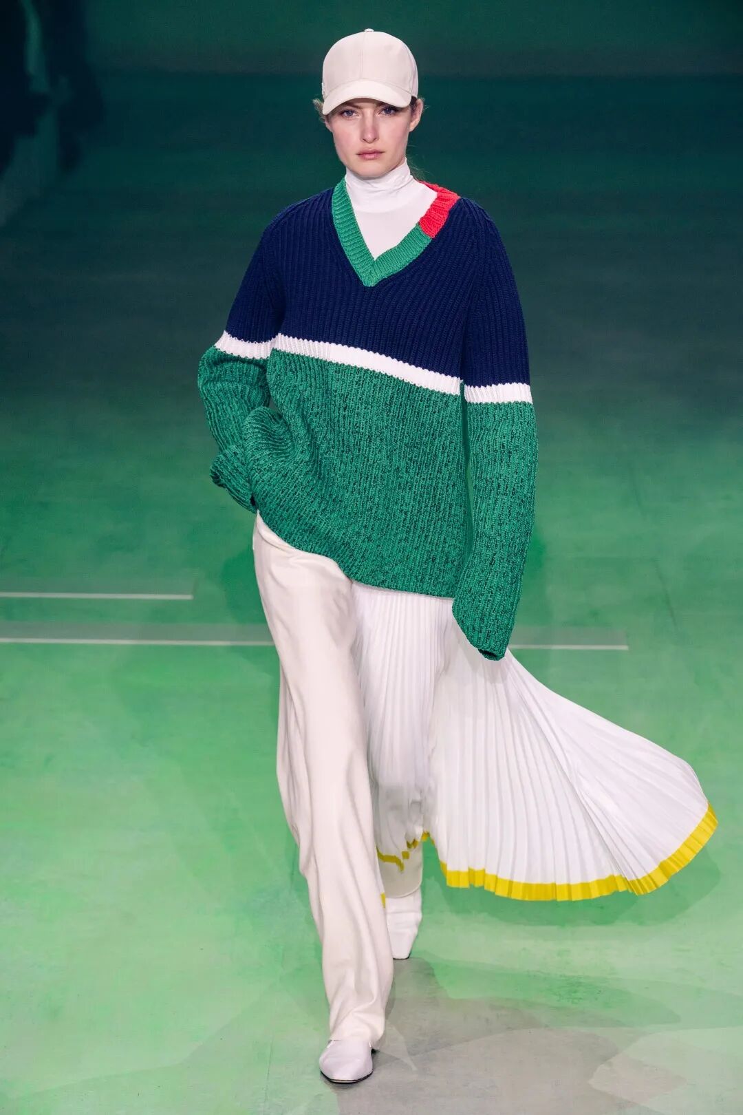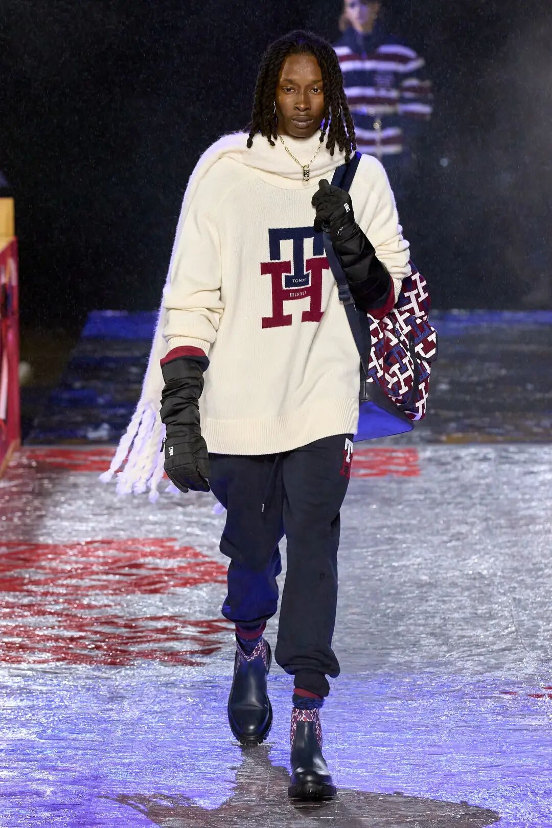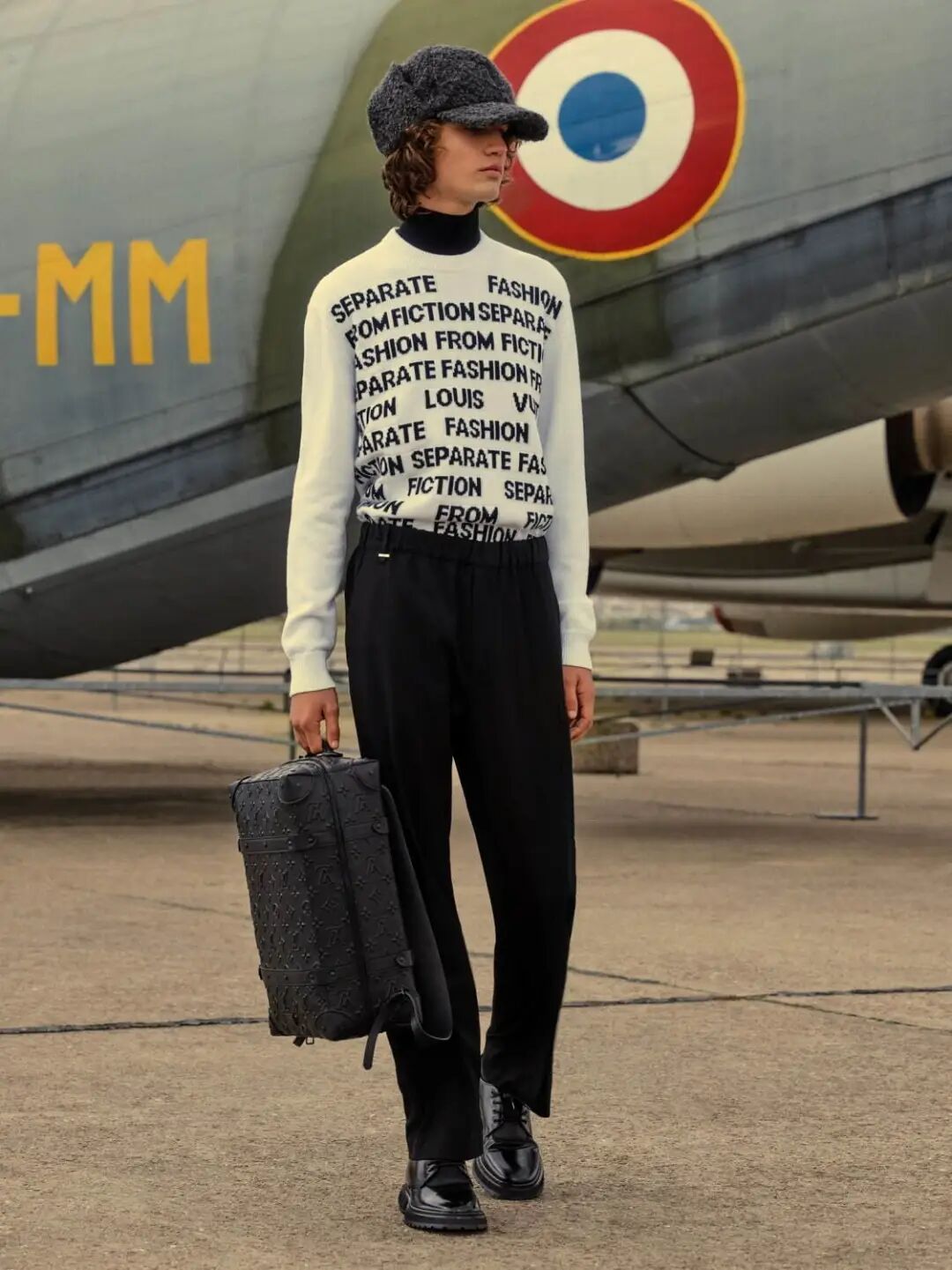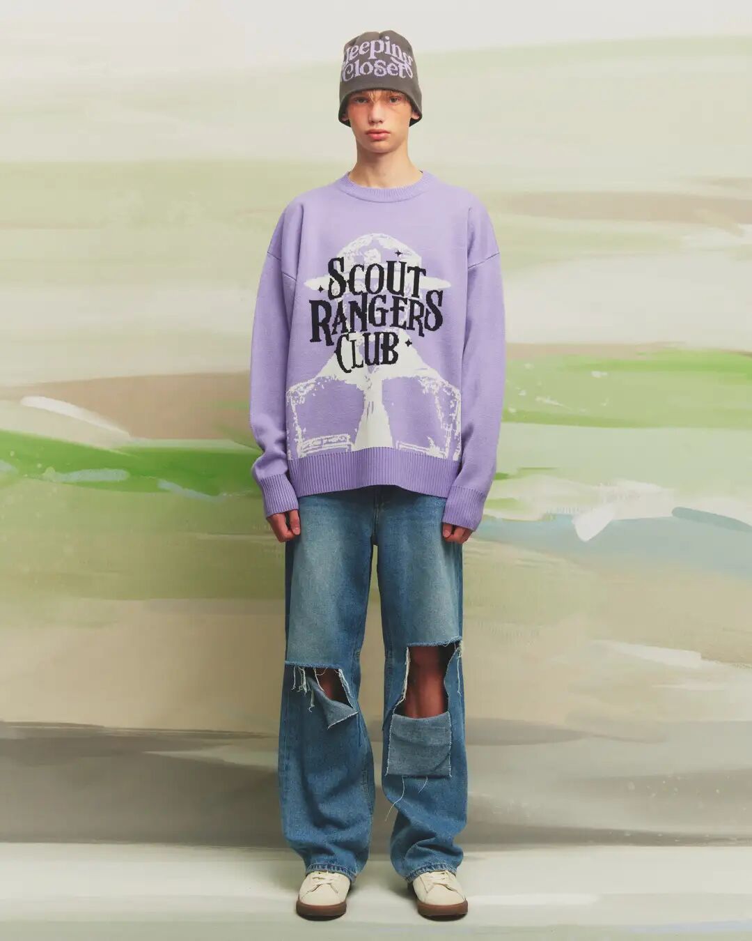 字母元素在套衫单品中的占比是比较大的,在平面中进行延展的字母立体设计,可为整体增添空间感;以点聚成字母的设计则更显精致;将字母与几何块面等元素相结合进行设计,整体的画面感更加丰富有层次。将品牌名称以提花、印染、刺绣等手法在款式局部呈现,提升了整体的品牌标识性,而满版的设计则更具视觉张力。
