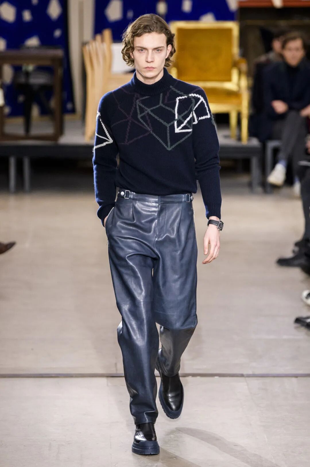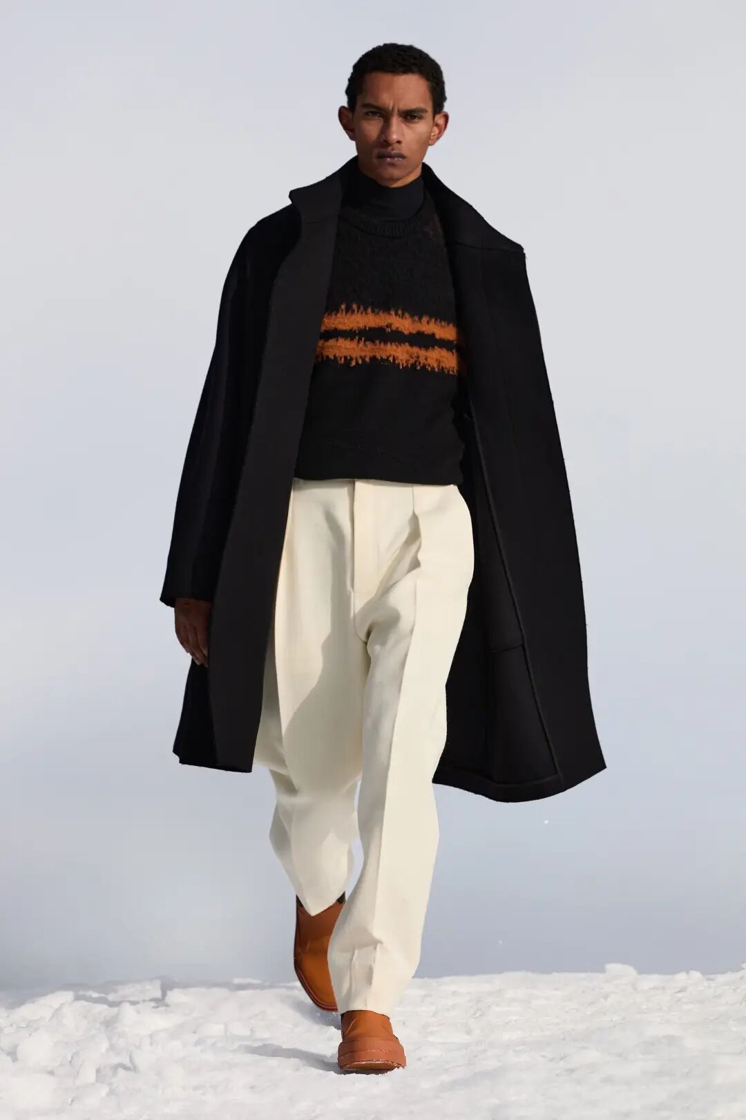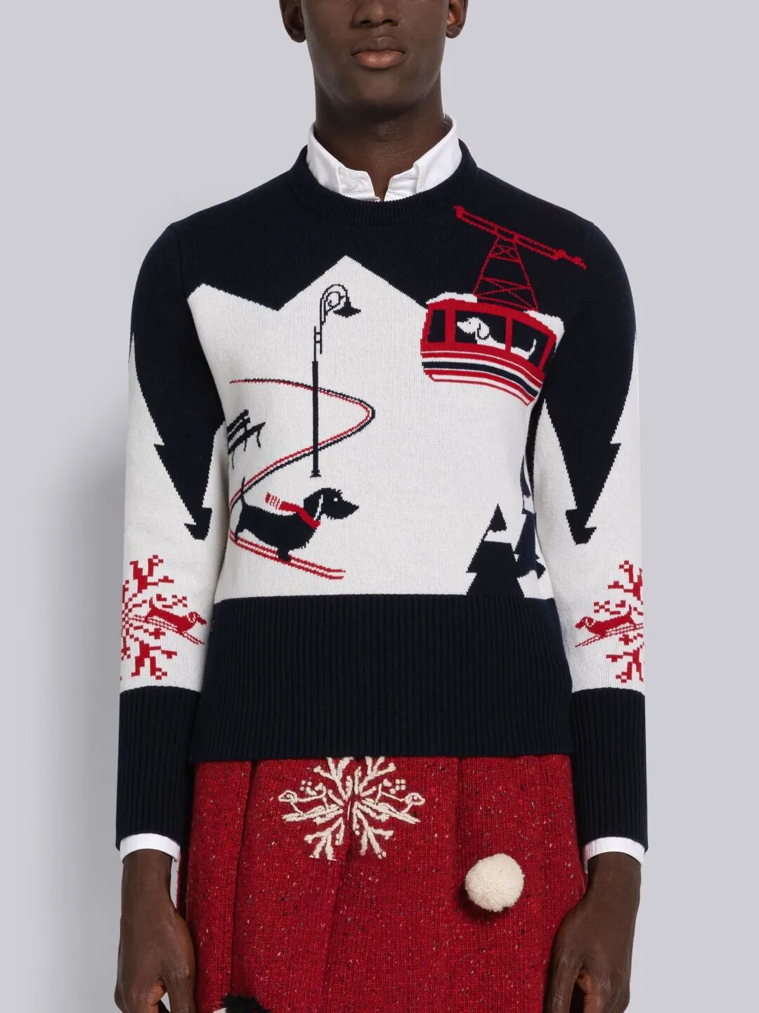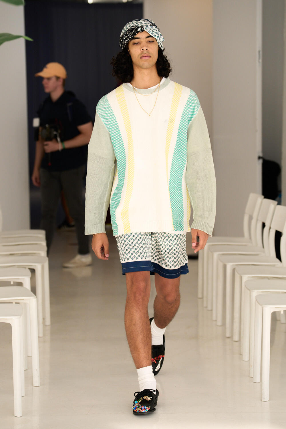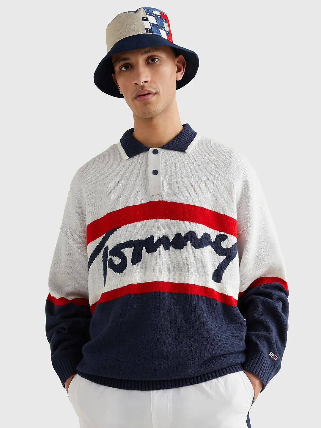 字母元素在套衫单品中的占比是比较大的,在平面中进行延展的字母立体设计,可为整体增添空间感;以点聚成字母的设计则更显精致;将字母与几何块面等元素相结合进行设计,整体的画面感更加丰富有层次。将品牌名称以提花、印染、刺绣等手法在款式局部呈现,提升了整体的品牌标识性,而满版的设计则更具视觉张力。
