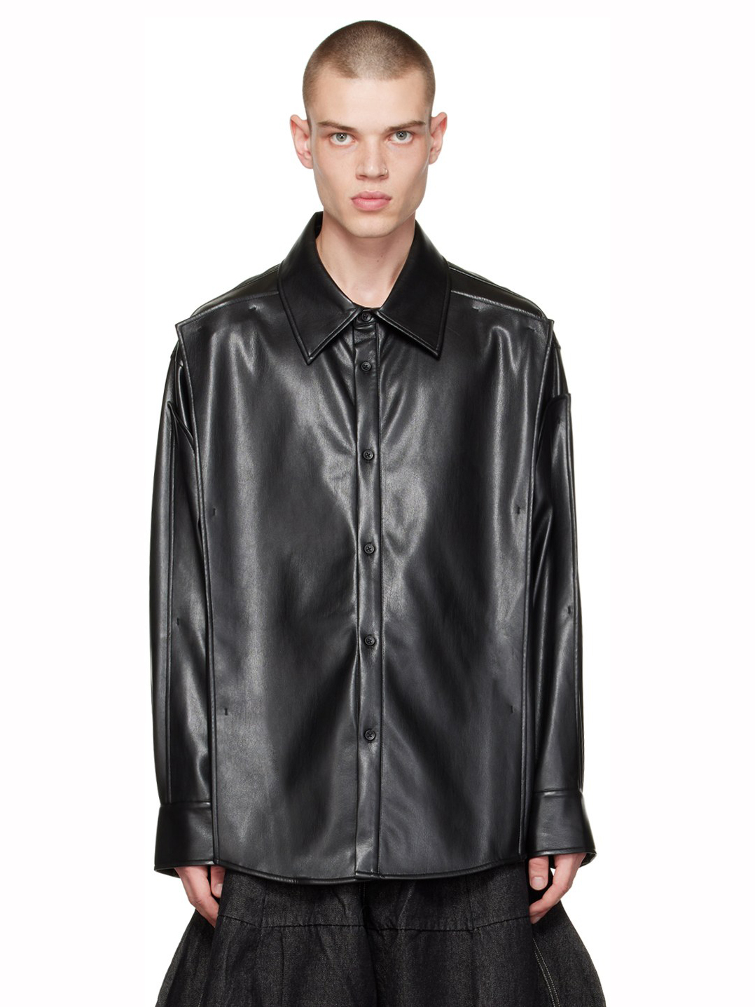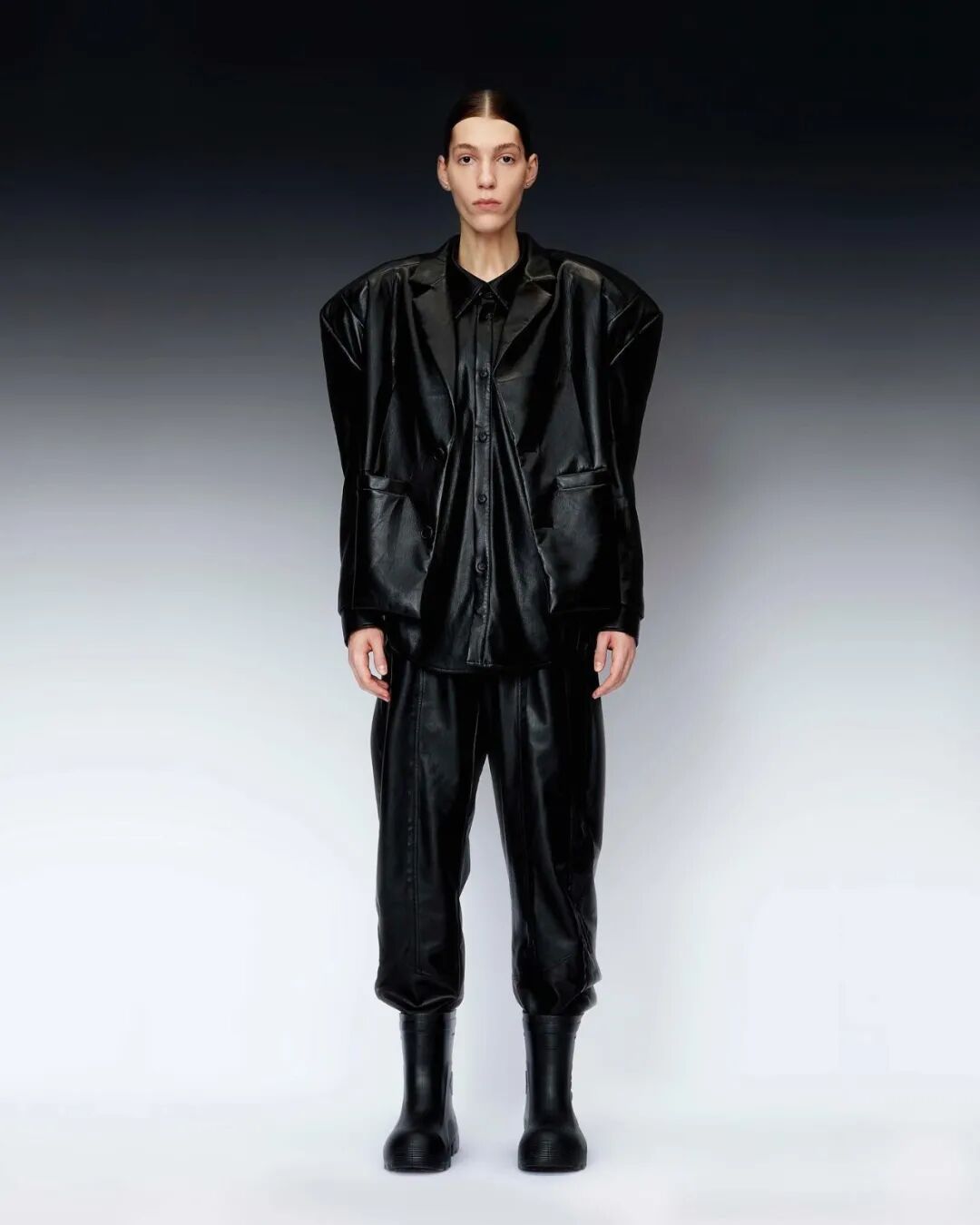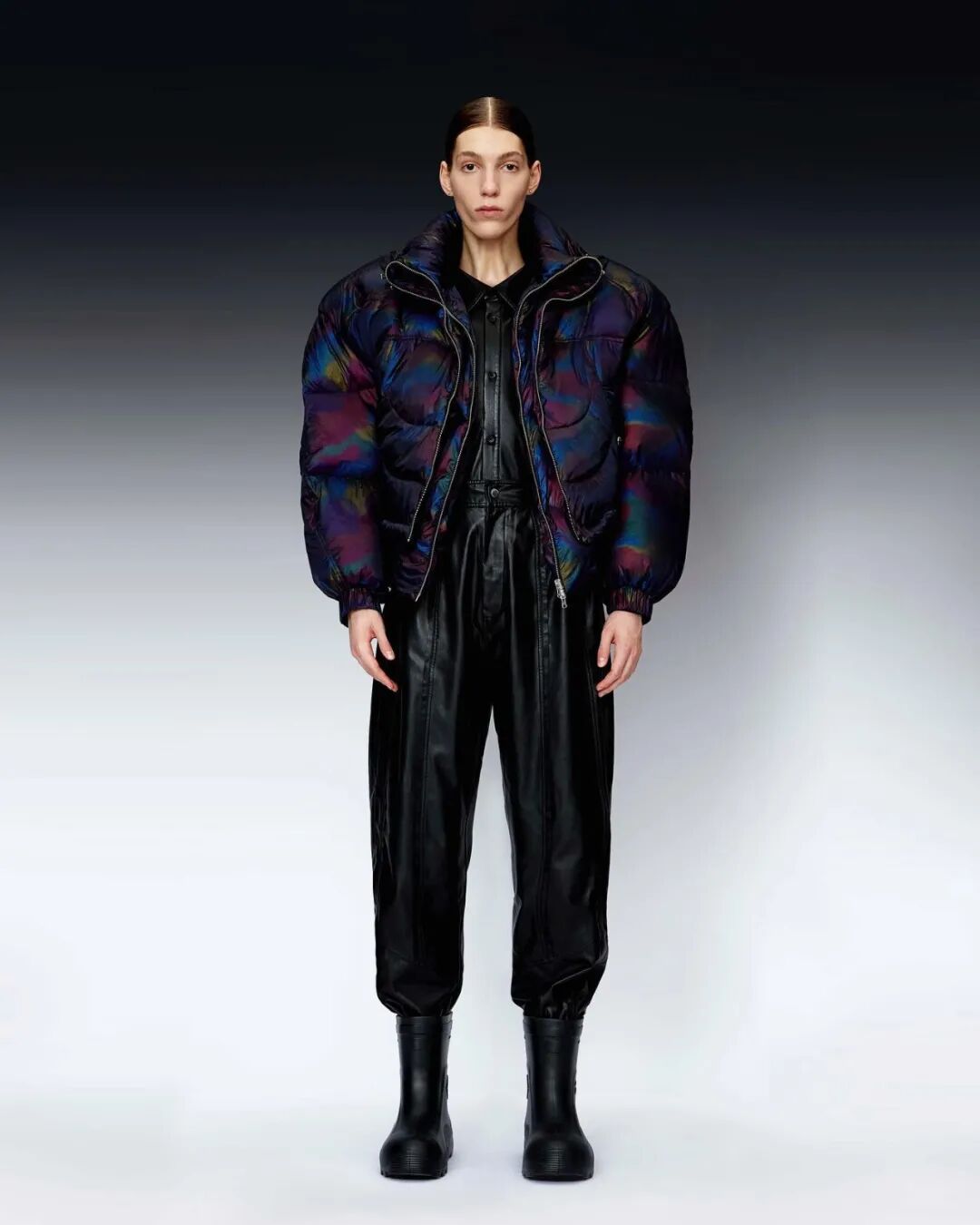 皮革元素在衬衫、外套、羽绒等单品上以漆面和哑光体现,呈现更加丰富且多元化的设计表达,长款漆面羽绒以宽肩造型设计,体现富有未来感的先锋格调。