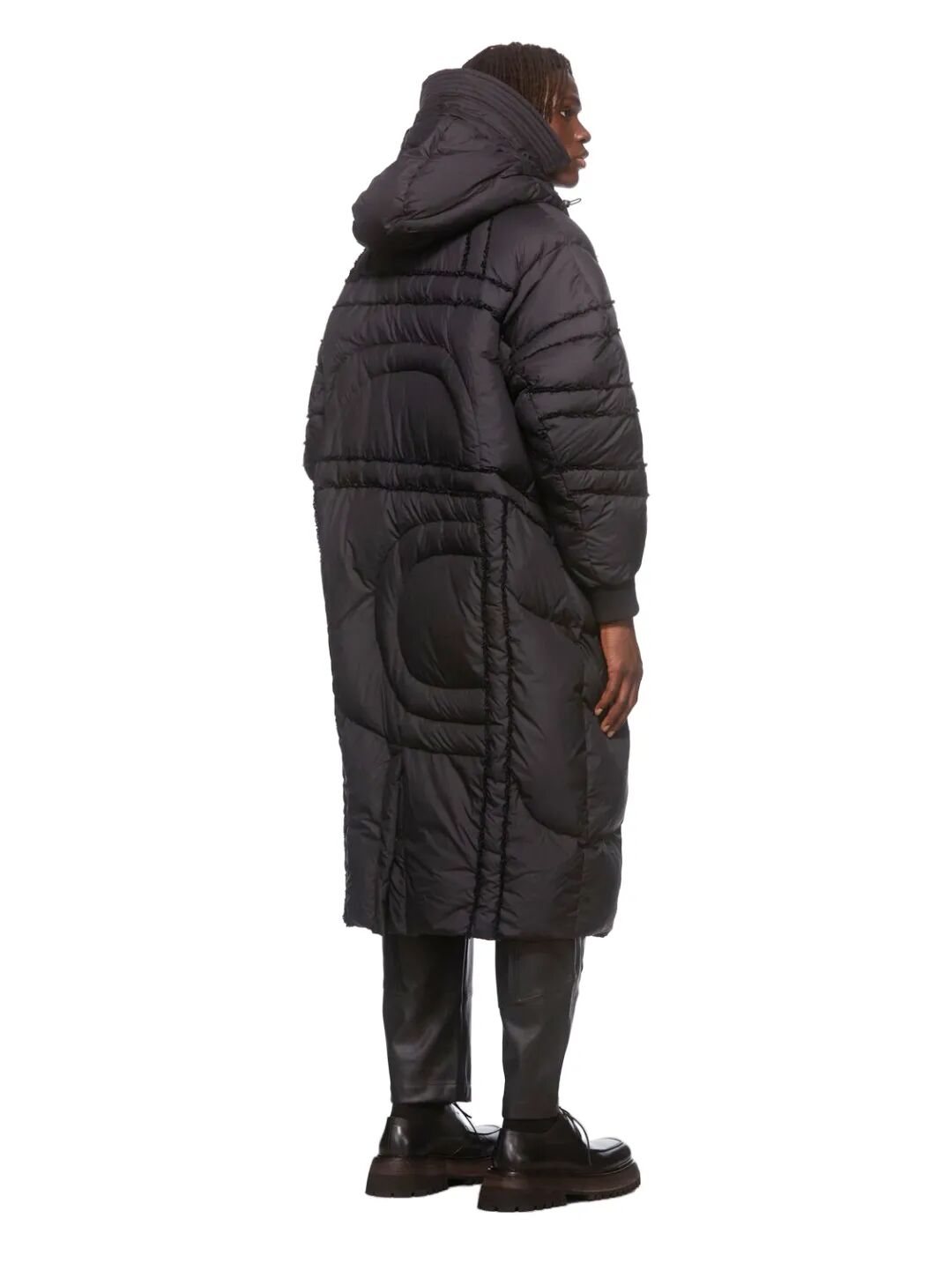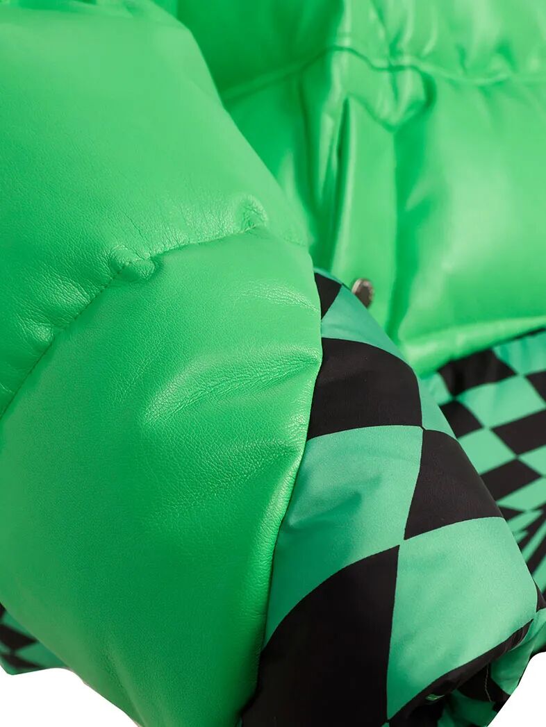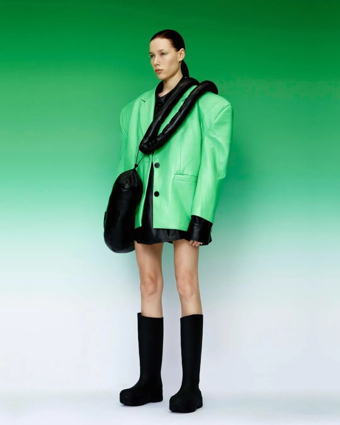 皮革元素在衬衫、外套、羽绒等单品上以漆面和哑光体现,呈现更加丰富且多元化的设计表达,长款漆面羽绒以宽肩造型设计,体现富有未来感的先锋格调。