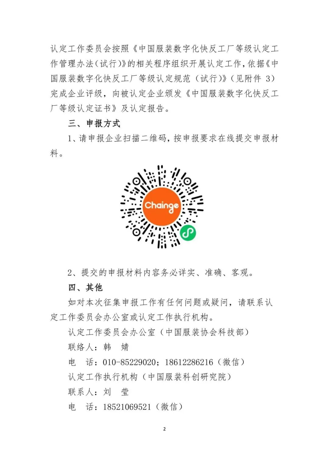 为全面推进服装行业数字化转型升级发展,引导和推动服装企业创新能力提升和数字化改造,促进服装行业高质量发展,中国服装协会在组织制定《中国服装数字化快反工厂等级认定工作管理办法(试行)》(见附件1)的基础上,决定启动中国服装数字化快反工厂等级认定工作,现将有关事项通知如下。
