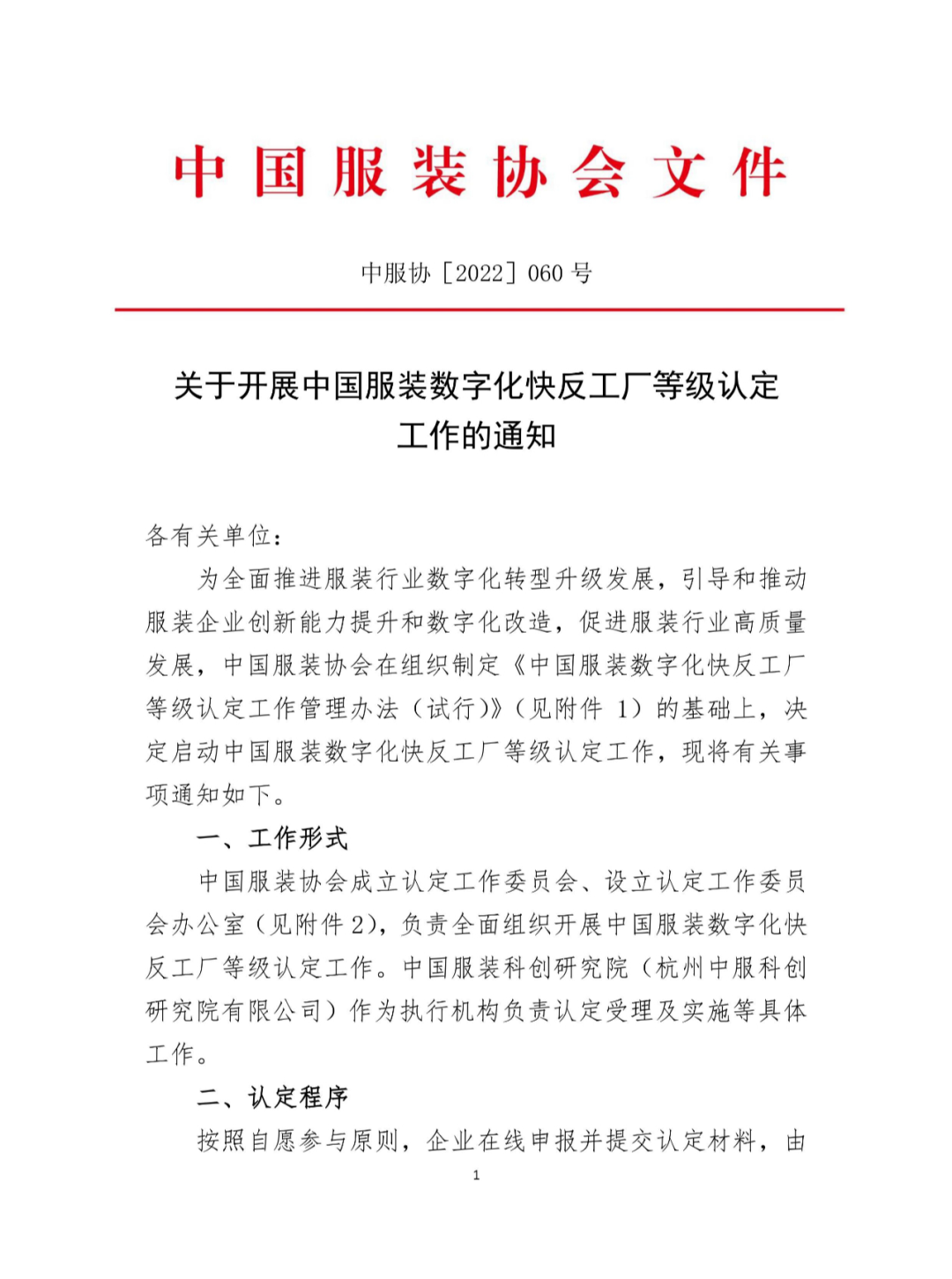 1、《中国服装数字化快反工厂等级认定工作管理办法(试行)》
