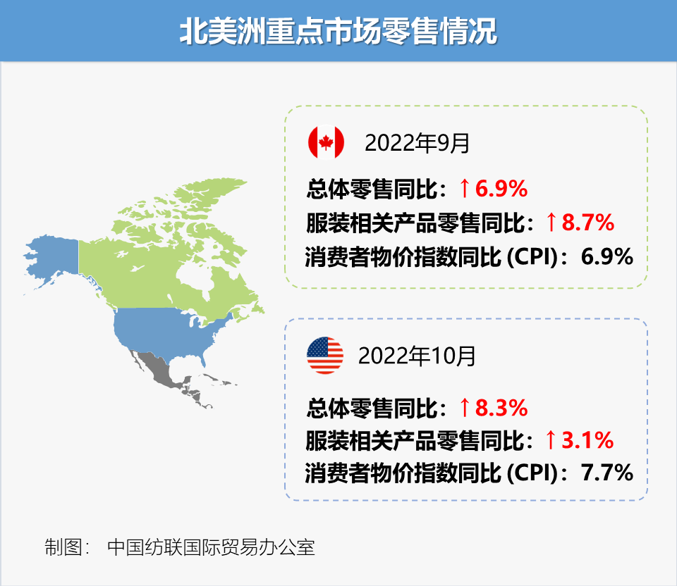 9月,加拿大通胀率连续第三个月放缓至6.9%。当月,加拿大零售总额同比增加6.9%,环比微降0.5%;服装类用品销售额为25.1亿加元(约18.7亿美元),环比增长1.5%,同比增长8.7%。