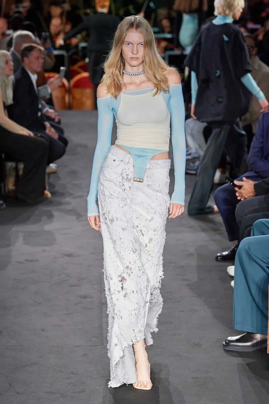MM6 Maison Margiela的2023春季成衣系列以穿着热身衣的舞者为灵感,模特在人群中迂回穿行,而安排在剧院座位上的管弦乐队则演奏着电影“春之祭”的原声带片段。设计人员使用了激光切割技术,在薄薄的T恤和长裙上制造出细孔和破碎的痕迹,这些本需要多年的磨损和洗涤才能实现。柔软轻薄的布料贴在模特们的身上,让她们看起来就像是从街上走来的刚下课的舞者。