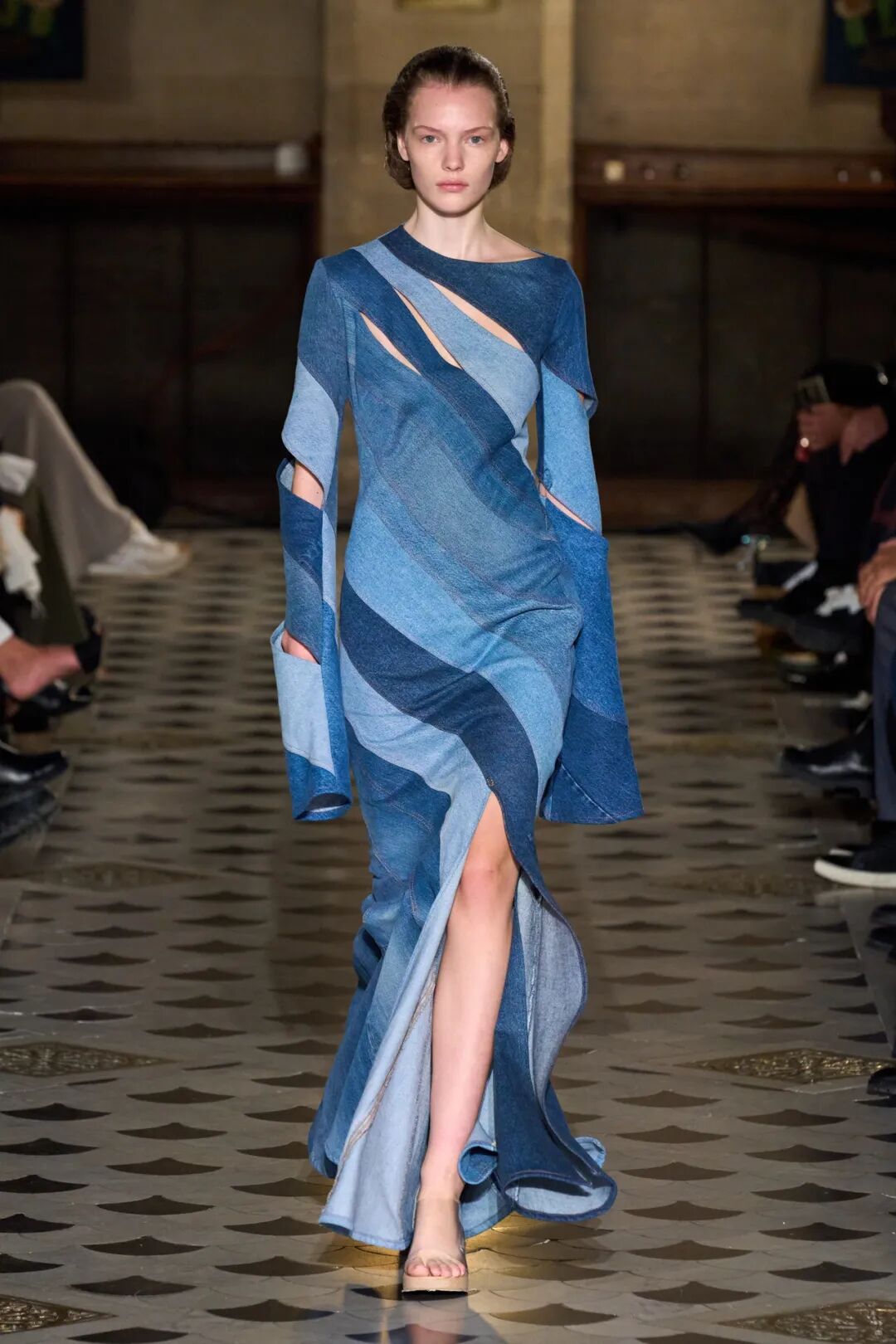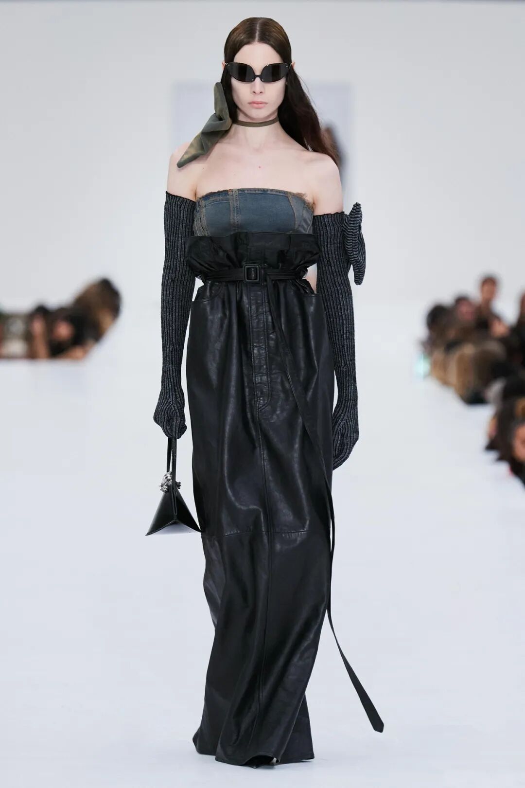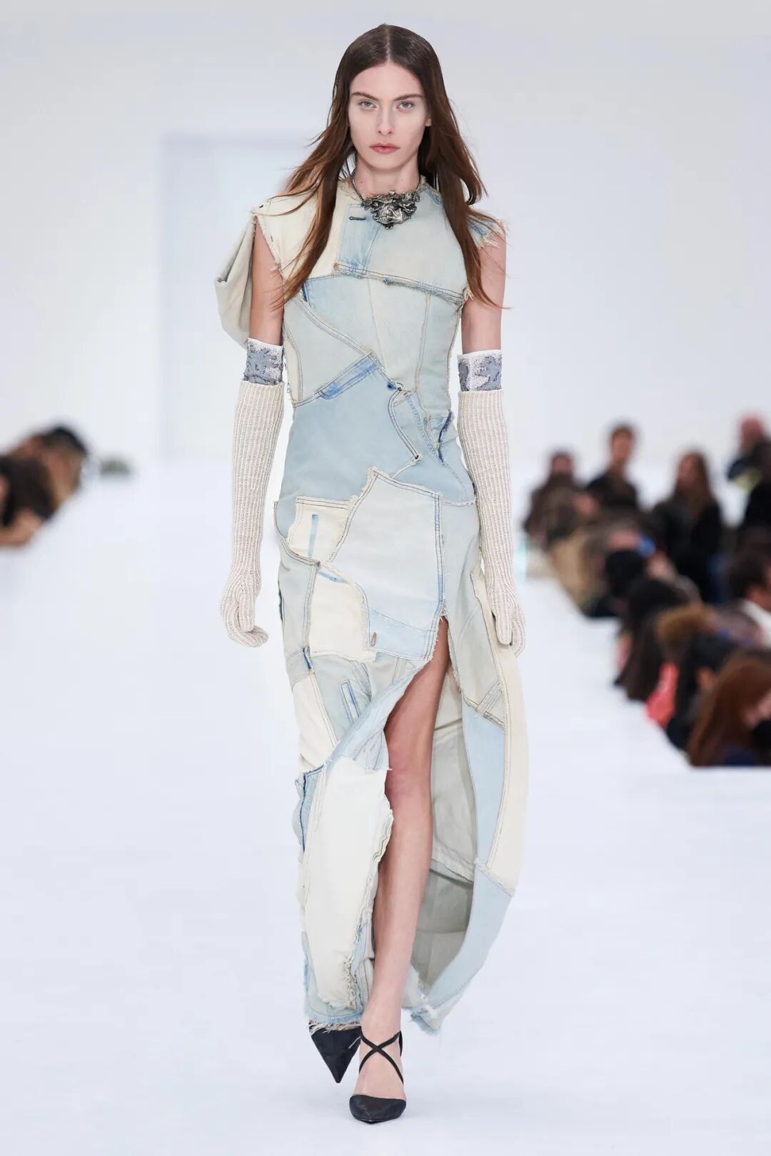 Acne Studios的2022秋季成衣系列开场造型是一条长至脚踝的牛血红牛仔布裙, 随后还展示了补丁拼接的牛仔连衣裙和牛仔布纸袋裙。这些都是在向牛仔布这种单一的媒介致敬。