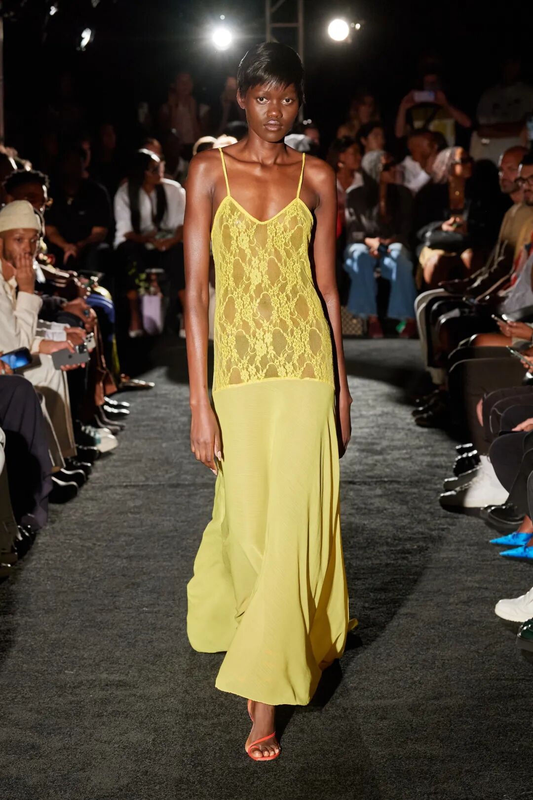 A.W.A.K.E. Mode,这个伦敦品牌融合了维京人、斯堪的纳维亚童话和像大卫林奇风格的《沙丘》中的太空沙漠等灵感,在巴黎的秀场上展示了扫地的薄纱裙和建筑风格的梭织长裙。富有新意的剪裁、对荷叶边和缝隙的玩法展示了艺术性和可穿性的结合。Theophilio的春季系列以怀旧为基础,设计师Edvin Thompson以一个移民的视角,提供了他对于成长过程中经历的y2k热潮的看法。受到Tom Ford的启发,他创造了纤细的薄纱连衣裙和牛仔长裙——这些都恰到好处地勾勒了女性的身体曲线。