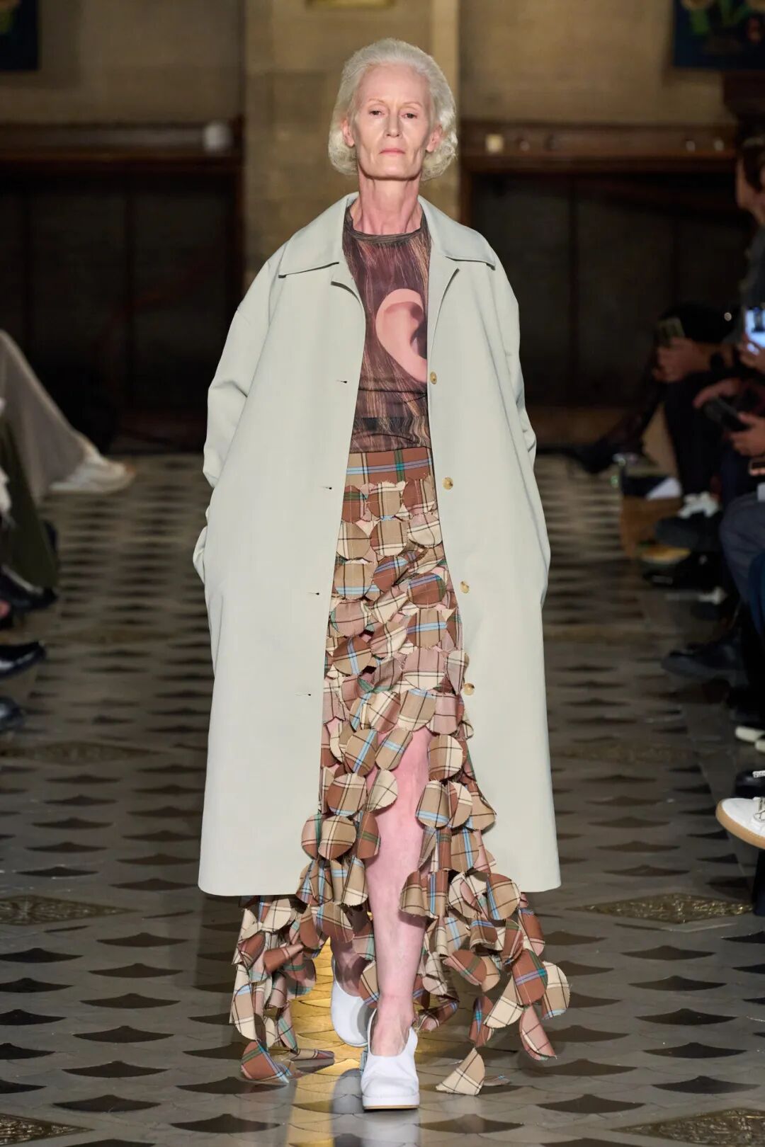 Balenciaga的2023春季系列,Demna则让每一件衣服都沾满了泥土,完成了一种对时尚的"亵渎"。当75名模特在湿滑的赛道上行走时,泥土溅到了他们裸露的脚踝上,也浸湿了他们的下摆——一种猜测是,Demna为了展示这种“亵渎”故意将裙子做成了高雅的拖地长度。