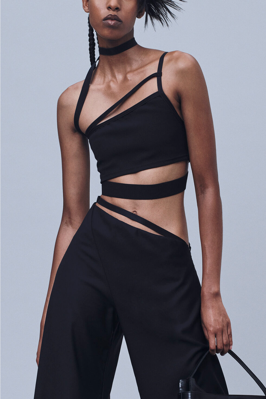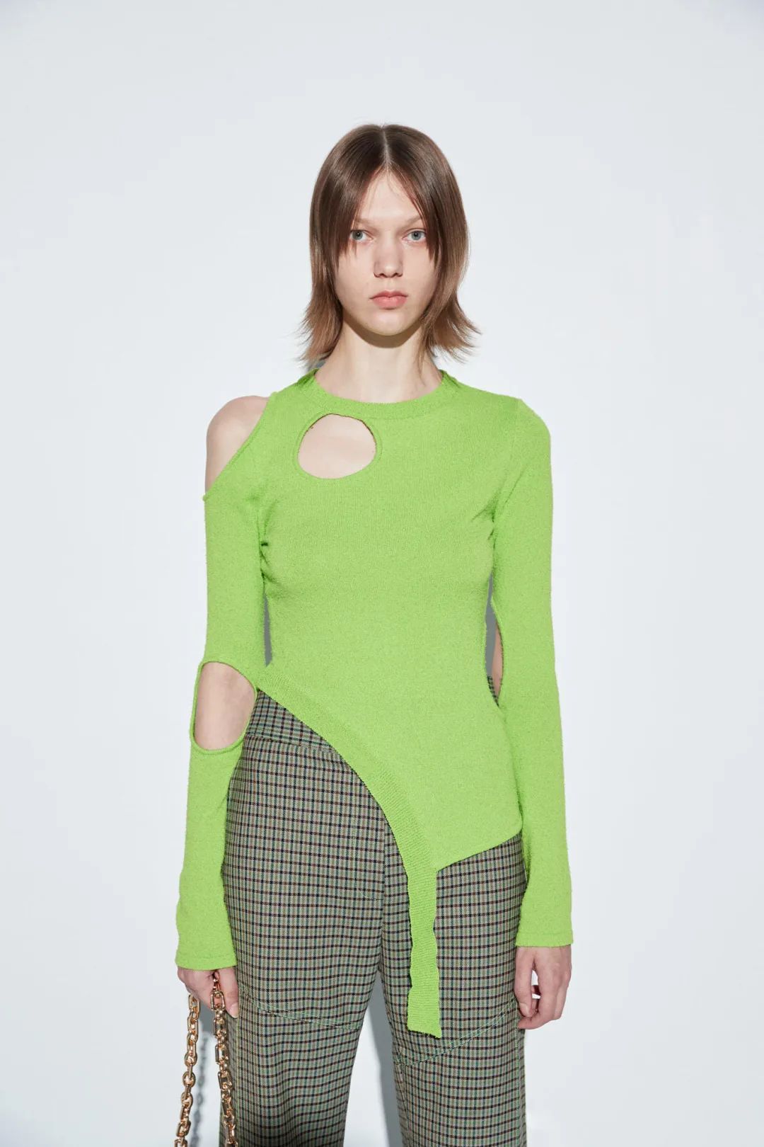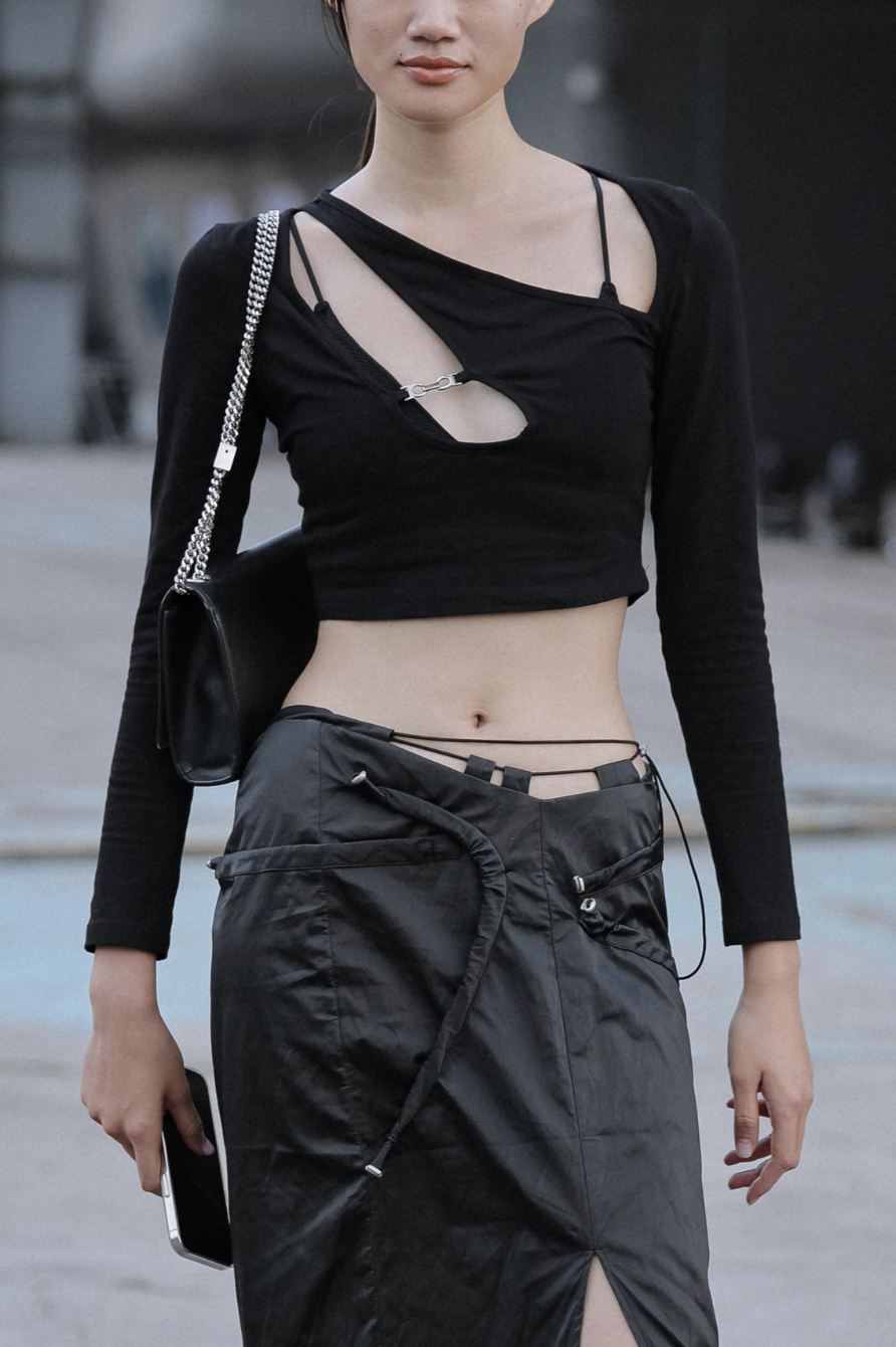 通过多种形式的变换,不对称的结构让造型更加多样化,强调个性的同时还增添了服装的趣味性。形成的镂空效果不仅注入了空气感,还适合叠搭!
