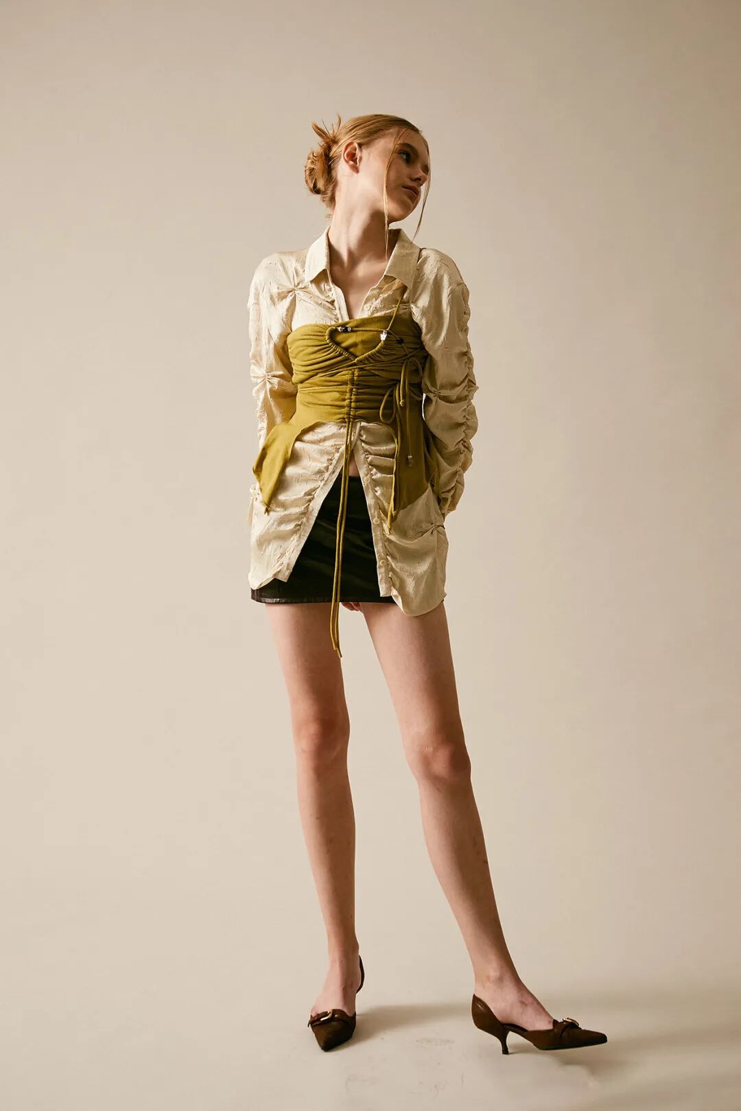设计师利用材质特点进行错位剪裁,使原本的结构从视觉上变型,又增添了设计感。同时整体的造型又带有视觉上的平衡,一切都演绎得敲到好处。