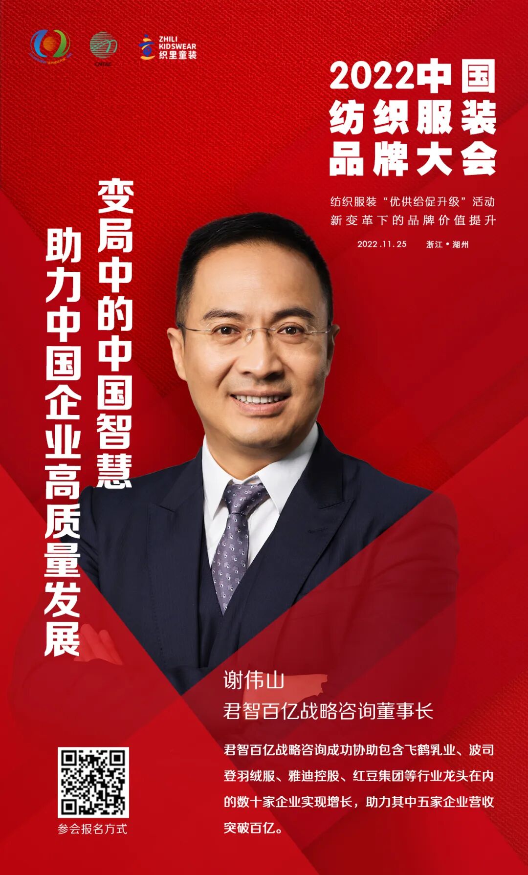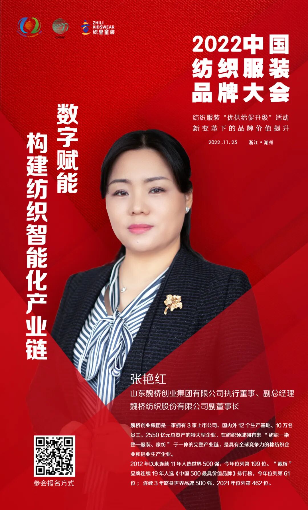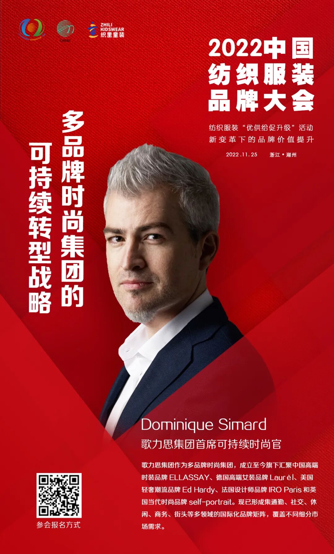 11月25日,2022中国纺织服装品牌大会将在浙江湖州举办。大会由中国纺织工业联合会、湖州市吴兴区人民政府主办,以“新变革下的品牌价值提升”为主题,多角度、多层次探讨在新变革下的中国纺织服装品牌如何在技术创新、文化自信、绿色低碳循环发展、消费引领方面进行探索与践行。以多元化的思维,深度解析提升品牌价值的重要性和独特性,共期为促进行业品牌建设高质量发展,满足人民群众对美好生活的新期待,实现共同富裕的新目标做出积极贡献。