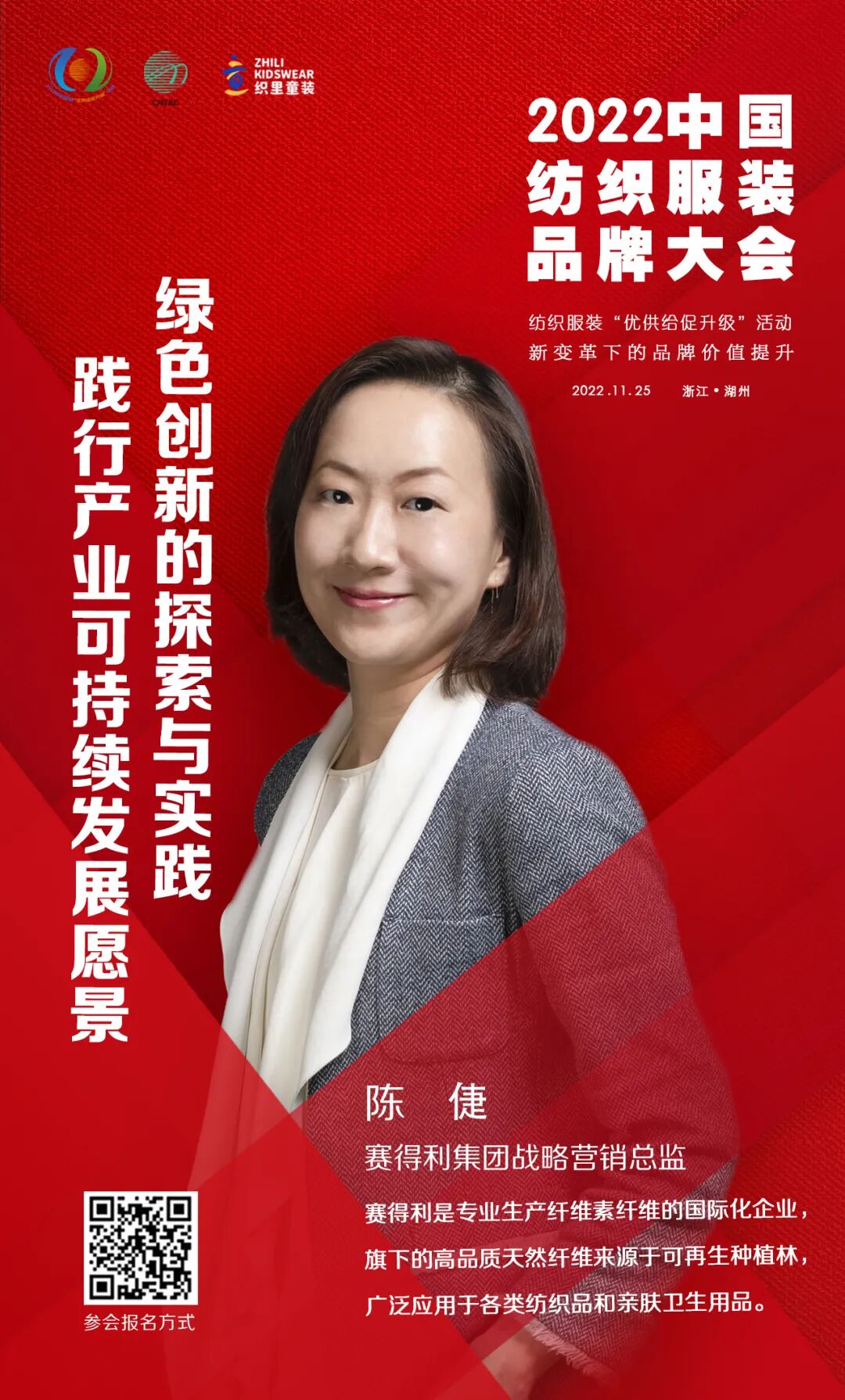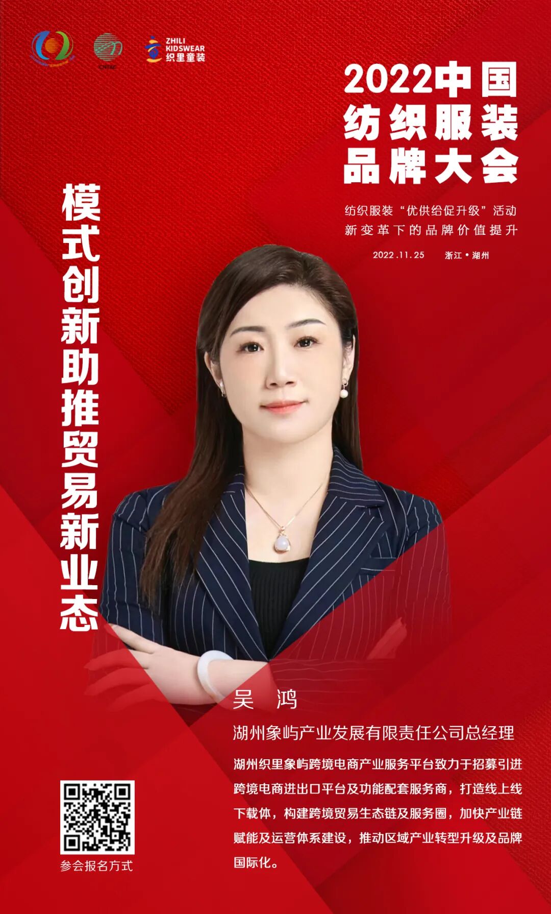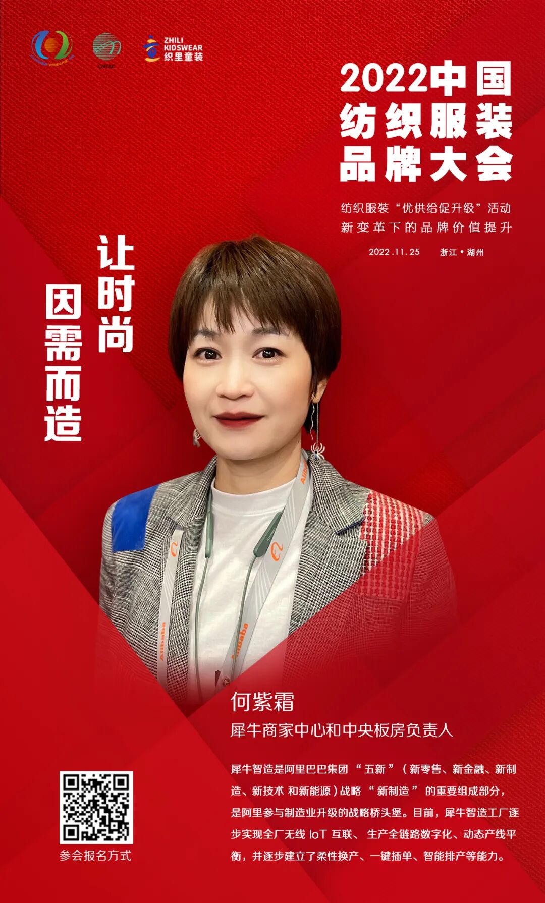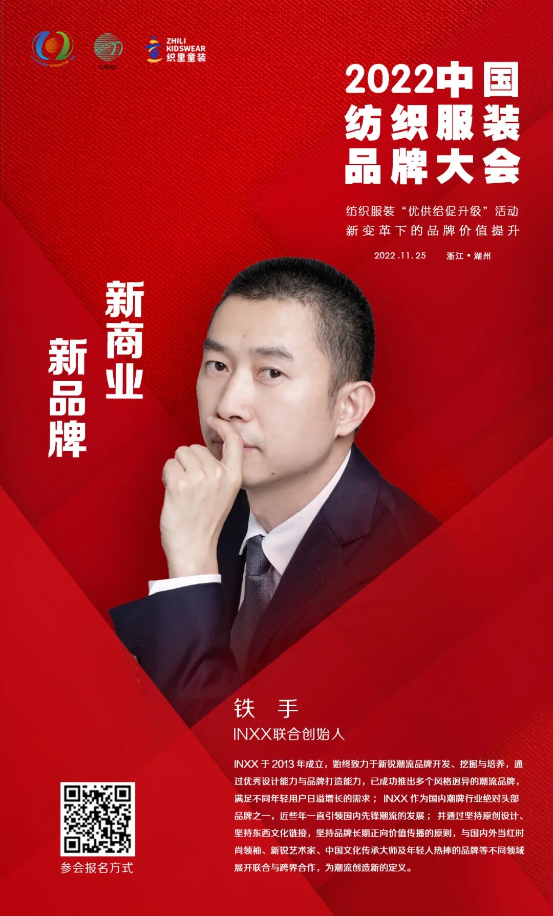 11月25日,2022中国纺织服装品牌大会将在浙江湖州举办。大会由中国纺织工业联合会、湖州市吴兴区人民政府主办,以“新变革下的品牌价值提升”为主题,多角度、多层次探讨在新变革下的中国纺织服装品牌如何在技术创新、文化自信、绿色低碳循环发展、消费引领方面进行探索与践行。以多元化的思维,深度解析提升品牌价值的重要性和独特性,共期为促进行业品牌建设高质量发展,满足人民群众对美好生活的新期待,实现共同富裕的新目标做出积极贡献。