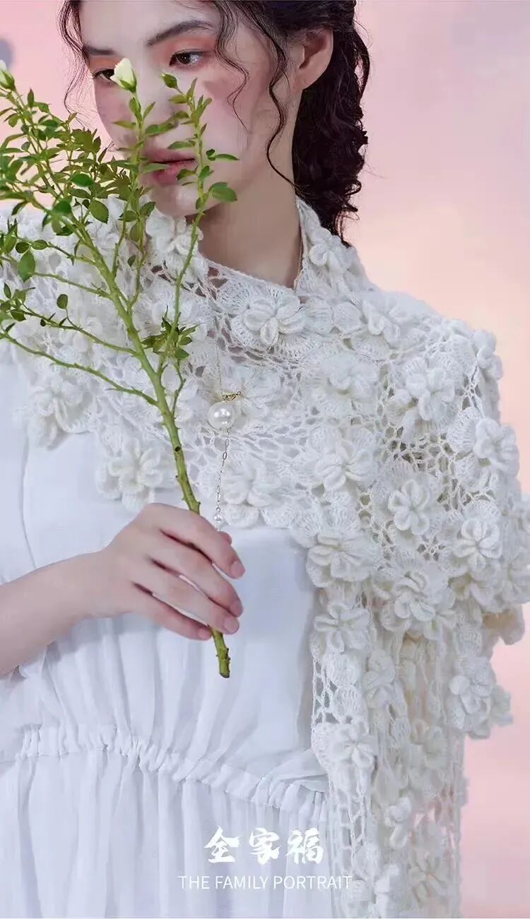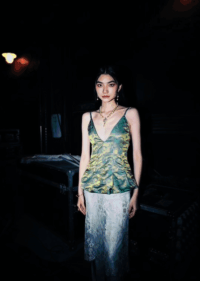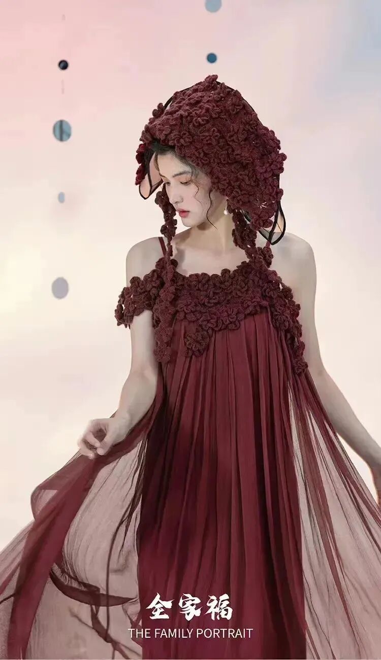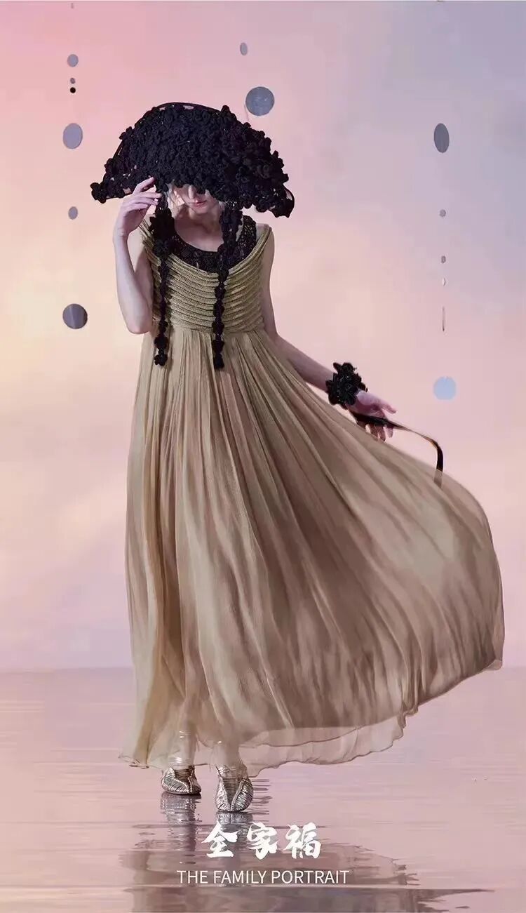 本套搭配以潮流单品“披肩”的形式将手工编织、手工流苏、手工打榄、香云纱等非遗面料与非遗工艺完美地融合在一起,在尊重传统的同时不断在传统文化中获取灵感,并善于汲取亲和的力量。采用东方柔软的丝纱面料结合飘逸的裙摆,处处散发着爱和美好的气息。