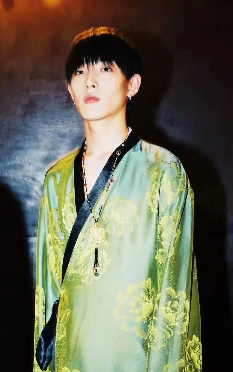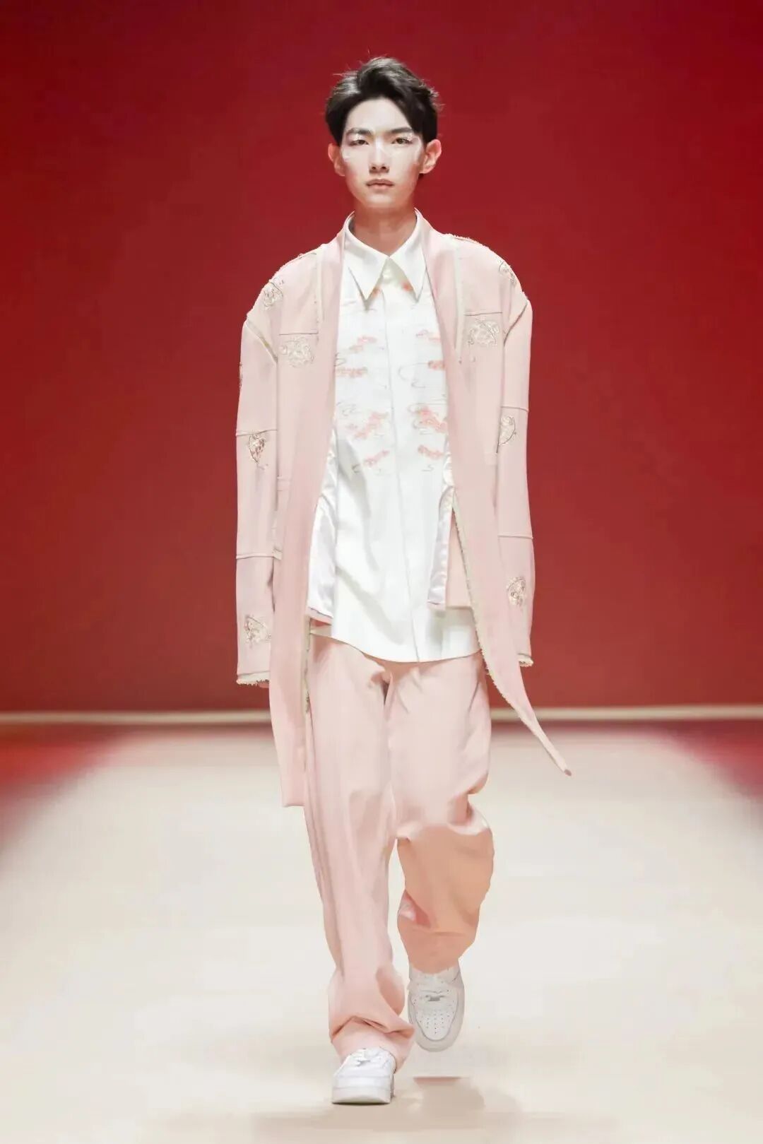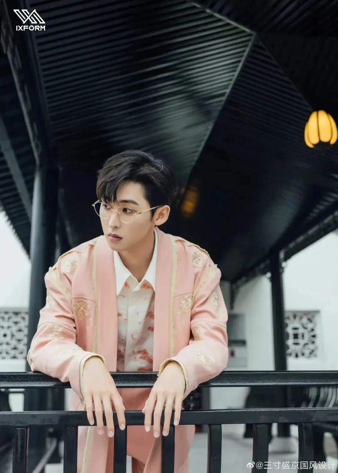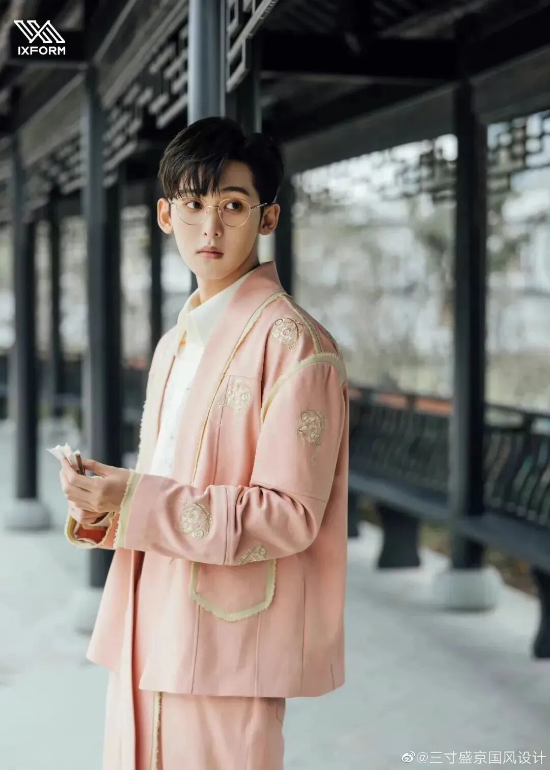 粉绿配色,传统的团花、交领与新时代丝毛、拼接的碰撞,搭配卷草云纹刺绣,打造出粉嫩嫩的国风美少年。