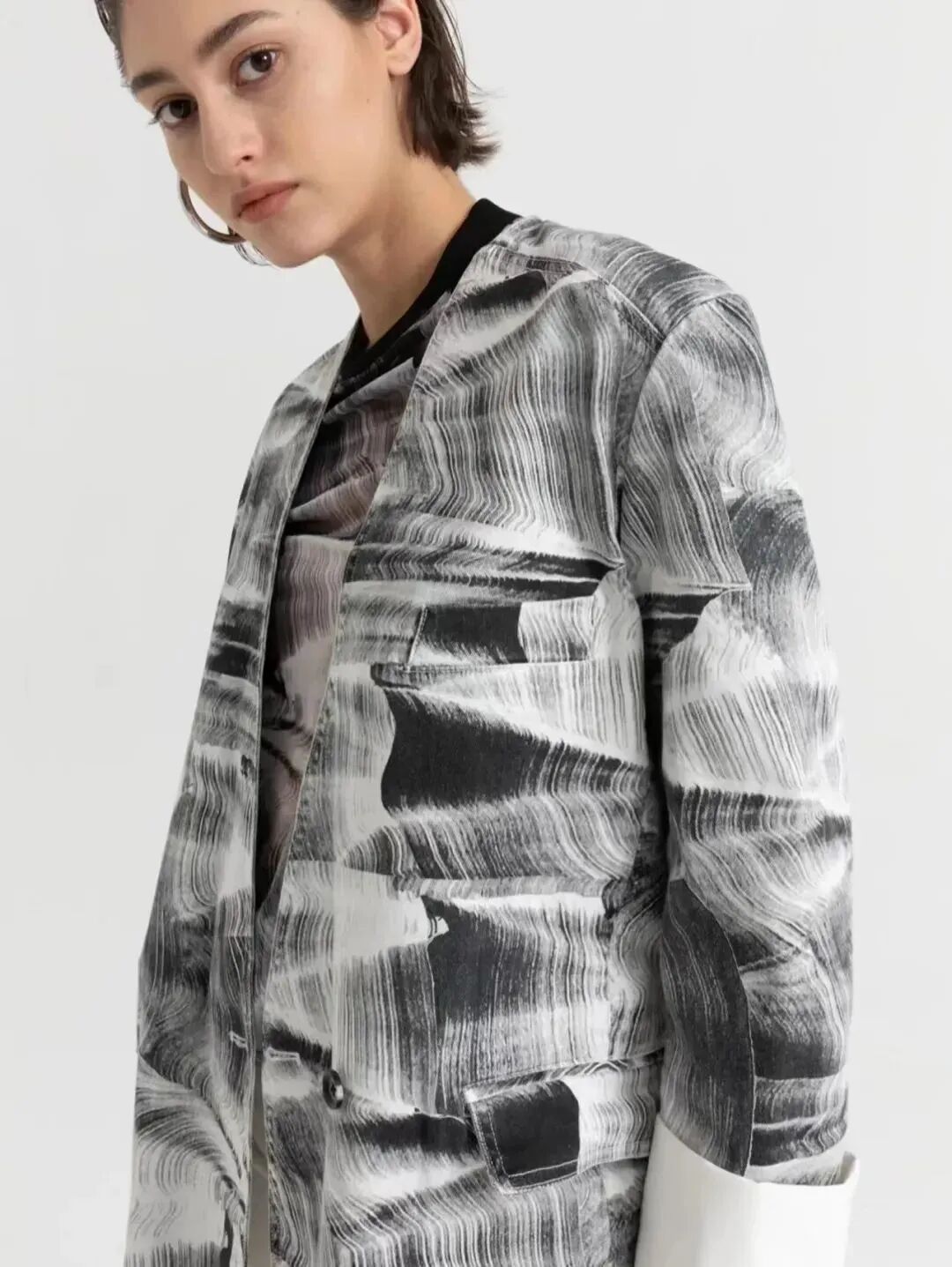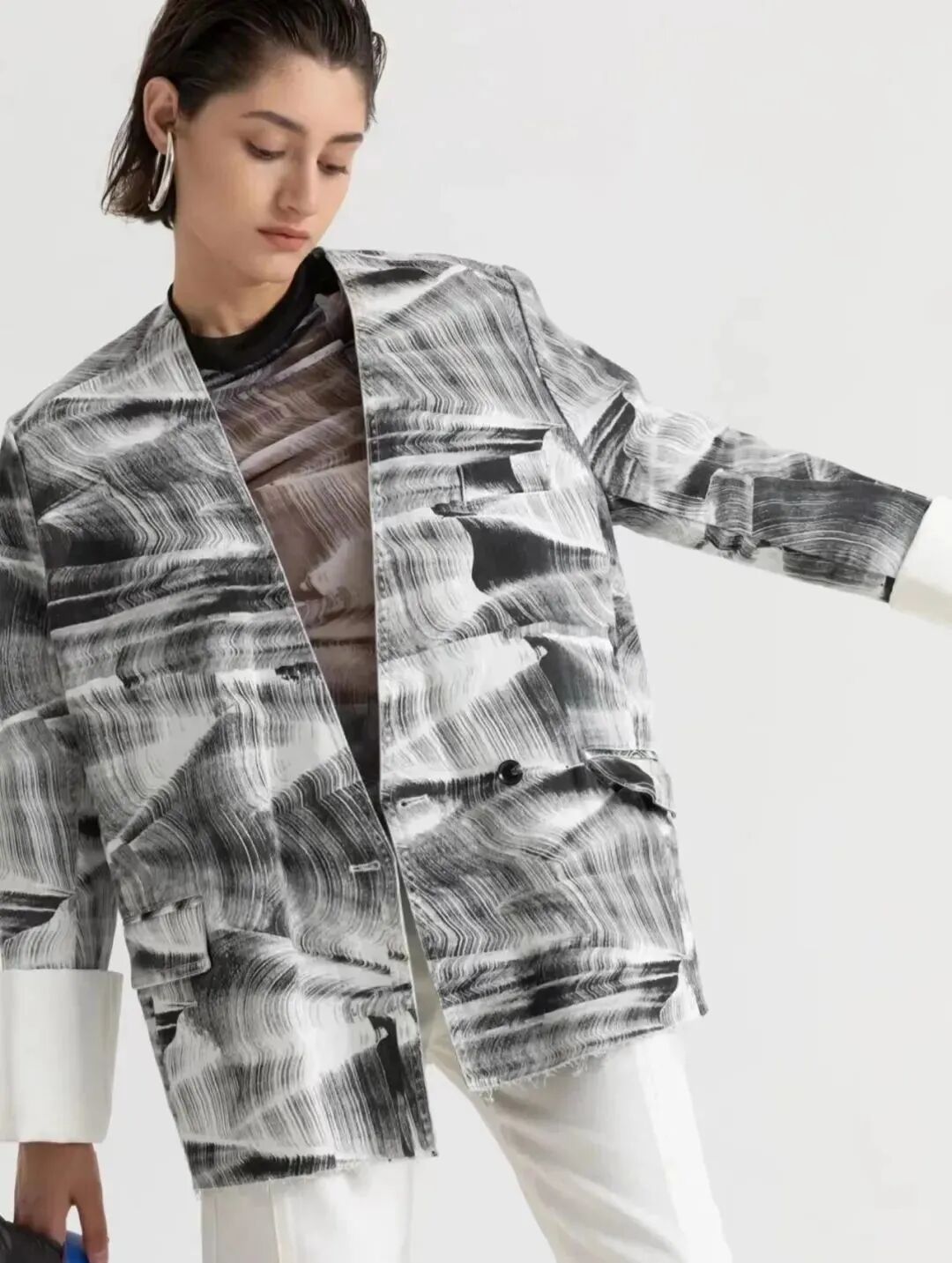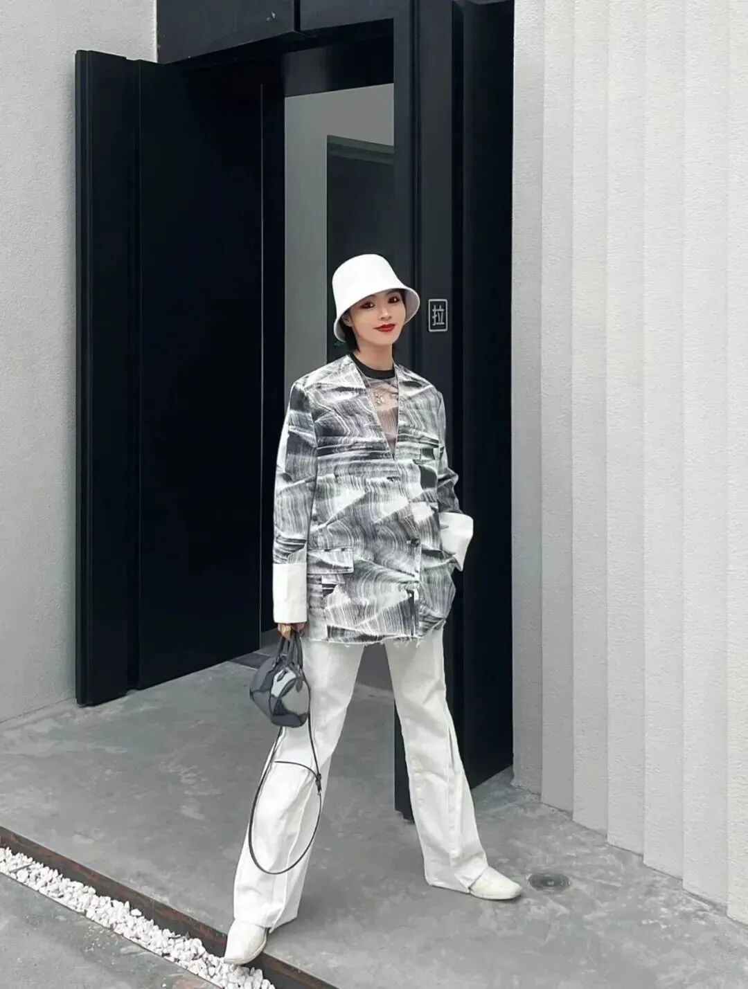 千年穿越了沙漠的行路人也是敦煌痕迹的创造者,他们在沙漠留下短暂的痕迹很快随风变化,随风消散,由此提取出地质般层叠覆盖且有流动感的图案。经典的黑白配色,恰好中和了层层印花带来的视觉冲击,挺括版型搭配下摆散边,更添休闲自在,通勤或出游的可以完美驾驭。