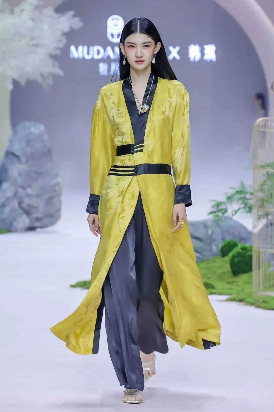 织锦缎国风外袍采用非遗织物“罗”,“宋锦苏锦”以及交织丝绸等传统面料,打造时尚飘逸的新国风时尚家居服系列,在服饰造型方面融入了修长飘逸之感,加入老绣片的刺绣工艺以及珠宝配饰造型,整体造型时尚又带有浓郁的国风气息。