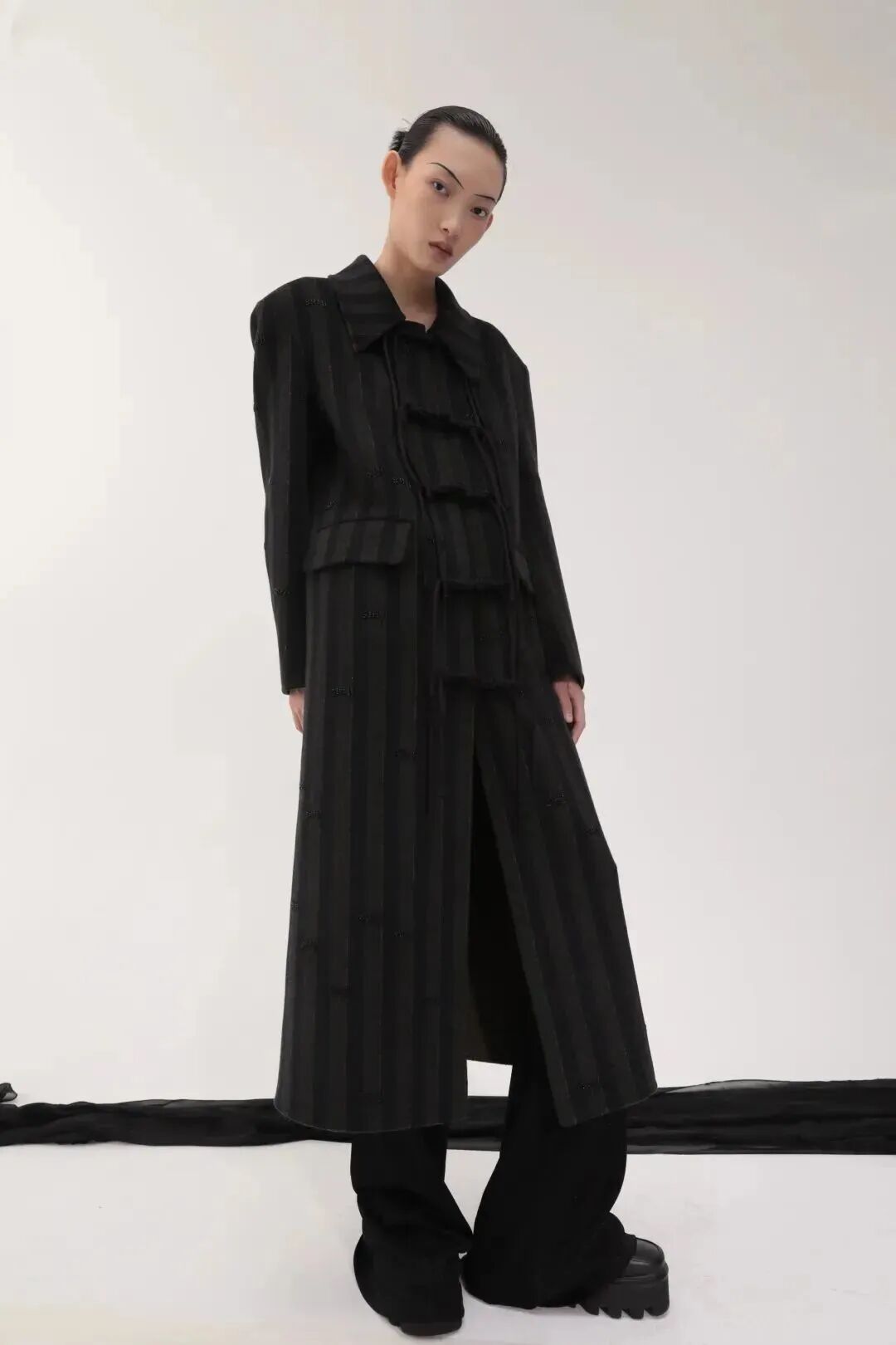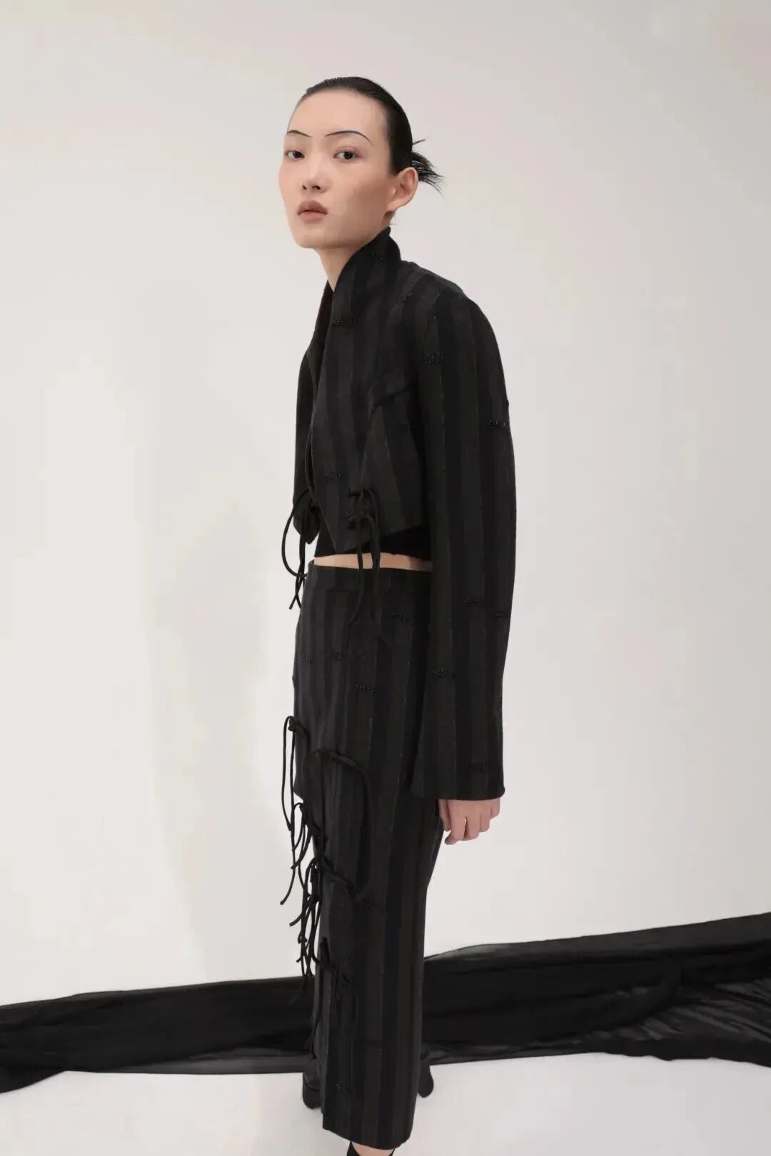 织锦是一种古老的面料,现代化条纹的设计赋予织锦蓬勃的生命力,现代廓形和穿搭理念辅以中国传统盘扣的设计,用前卫潮流地方式演绎传统。
