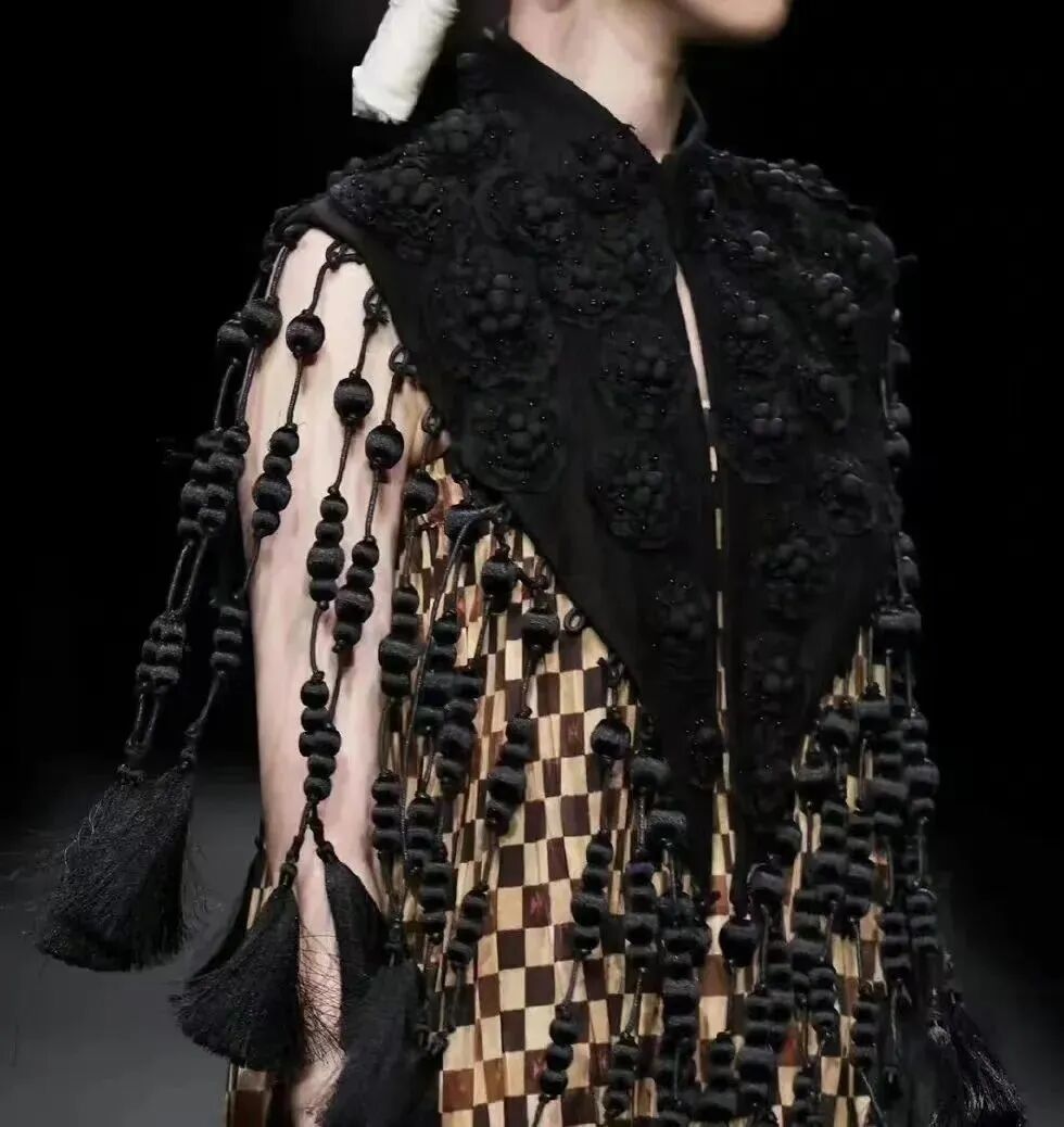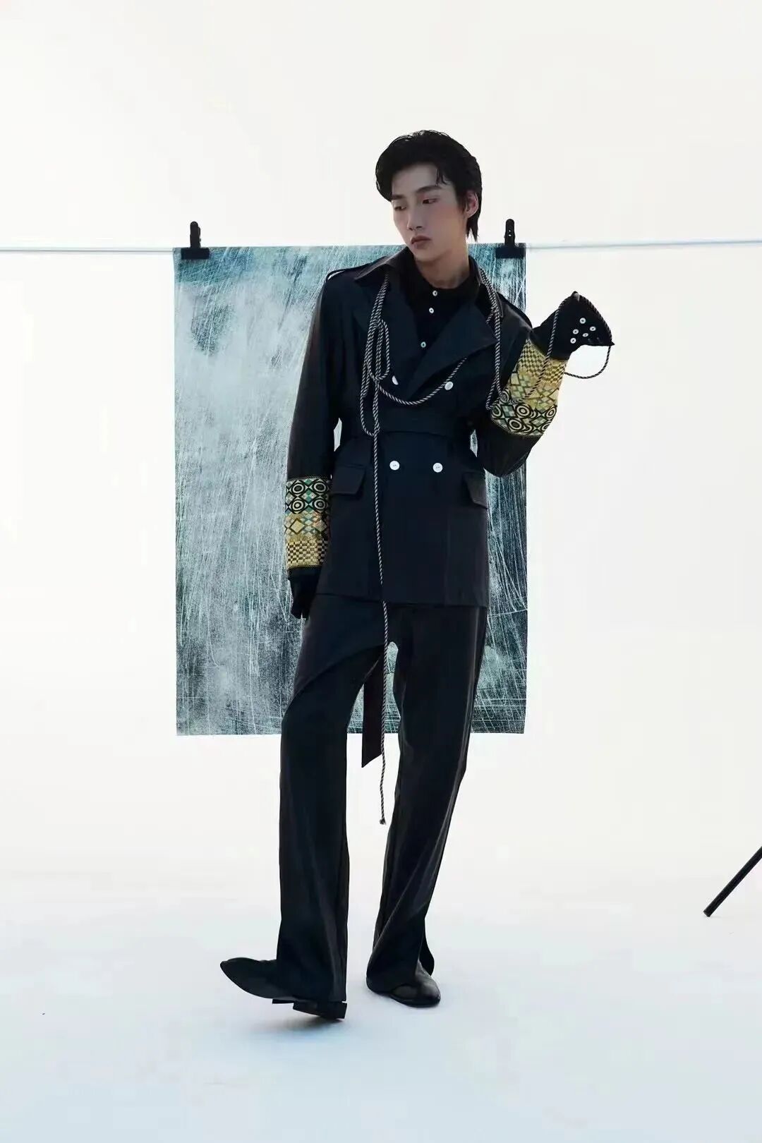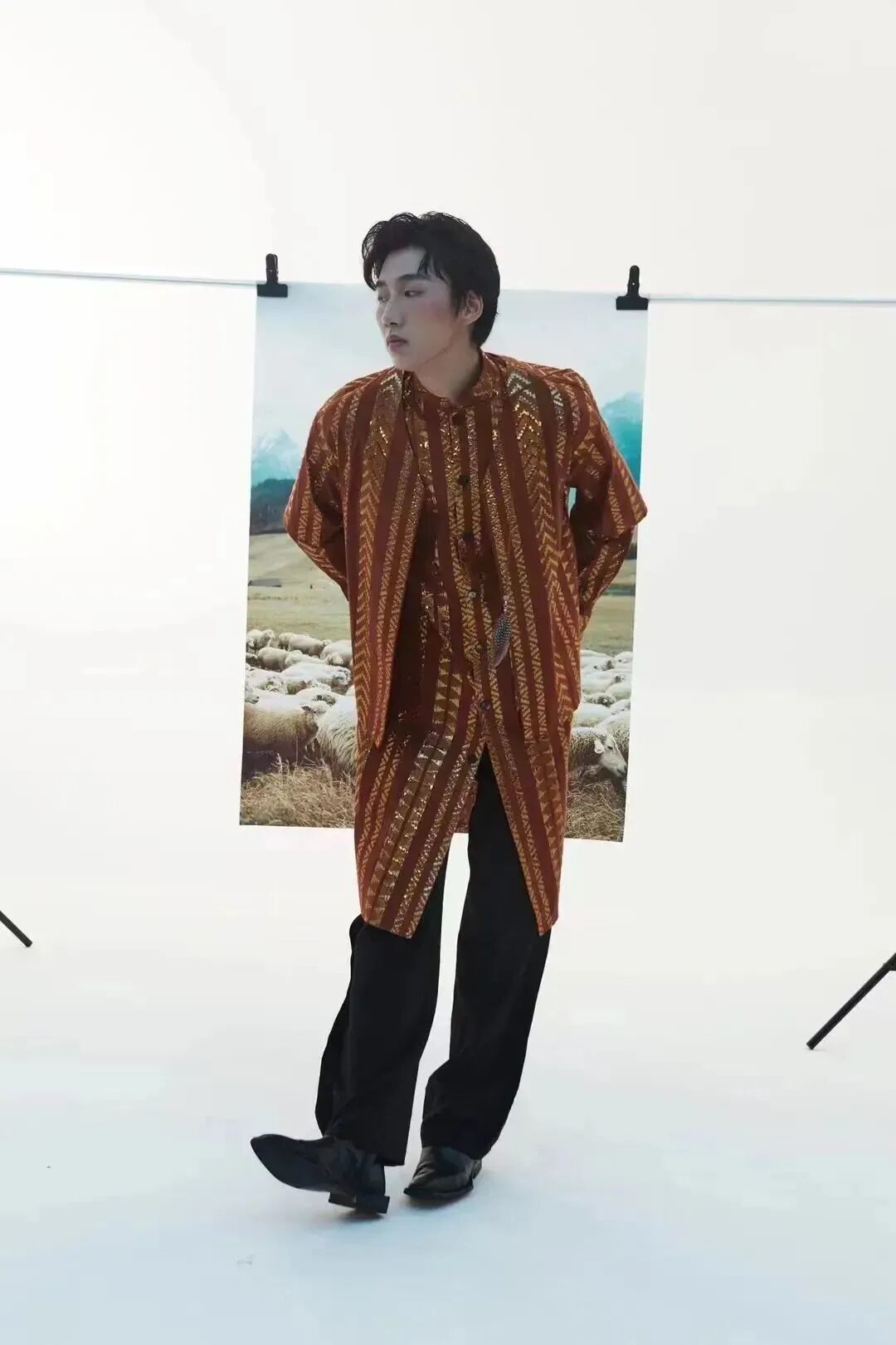 藏纹饰军装风外套很好的将民族元素与现代廓形风格相结合,袖口的藏纹提花面料的拼接是根据织物本身的特性而进行创作设计,整体挺拔干练。