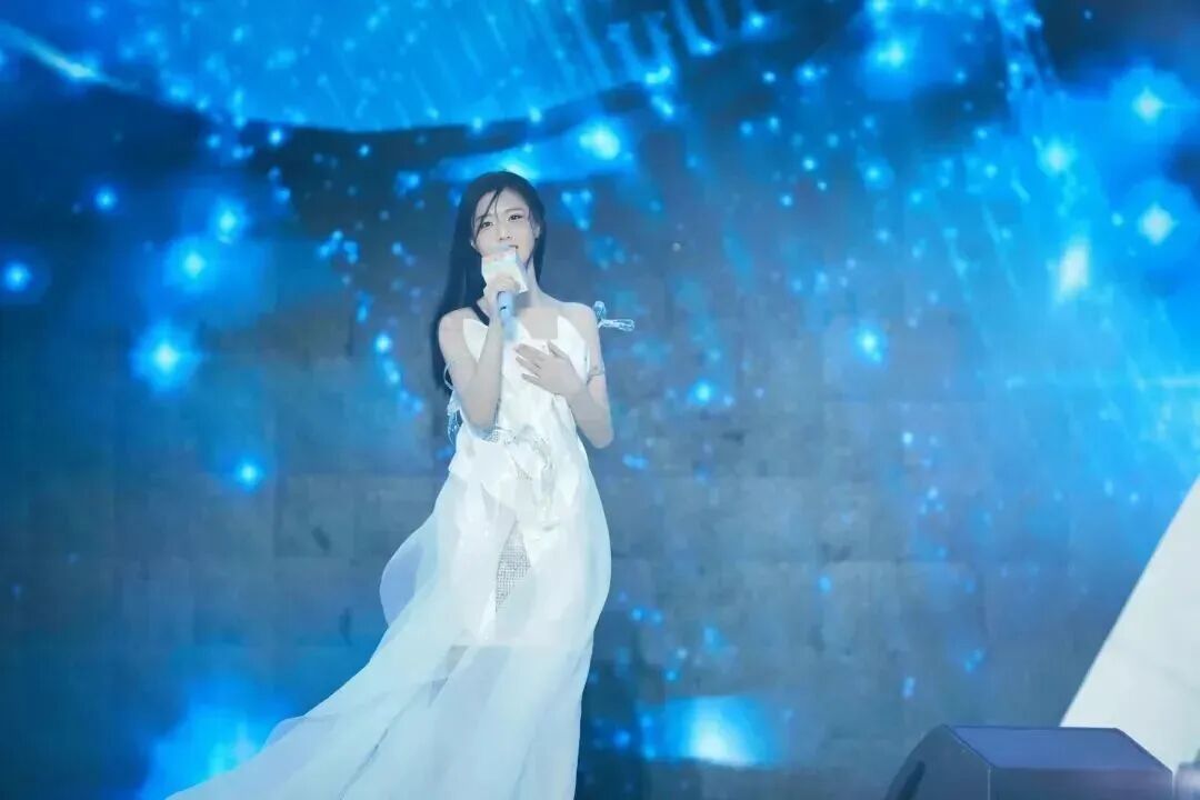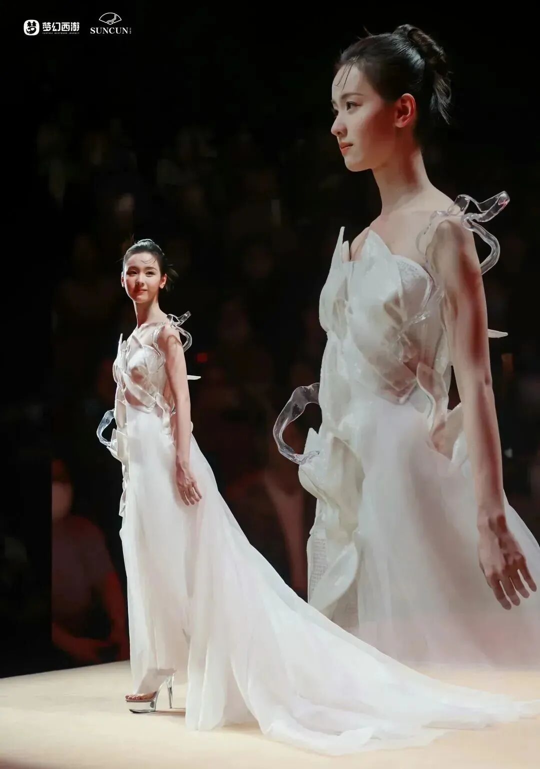 以形意为衣,采用3D打印技术塑造飞天飘带的婉转灵动,片片花瓣晶莹剔透,错落有致,轻纱层叠,如梦似幻地包裹出两位明星的女神形象。