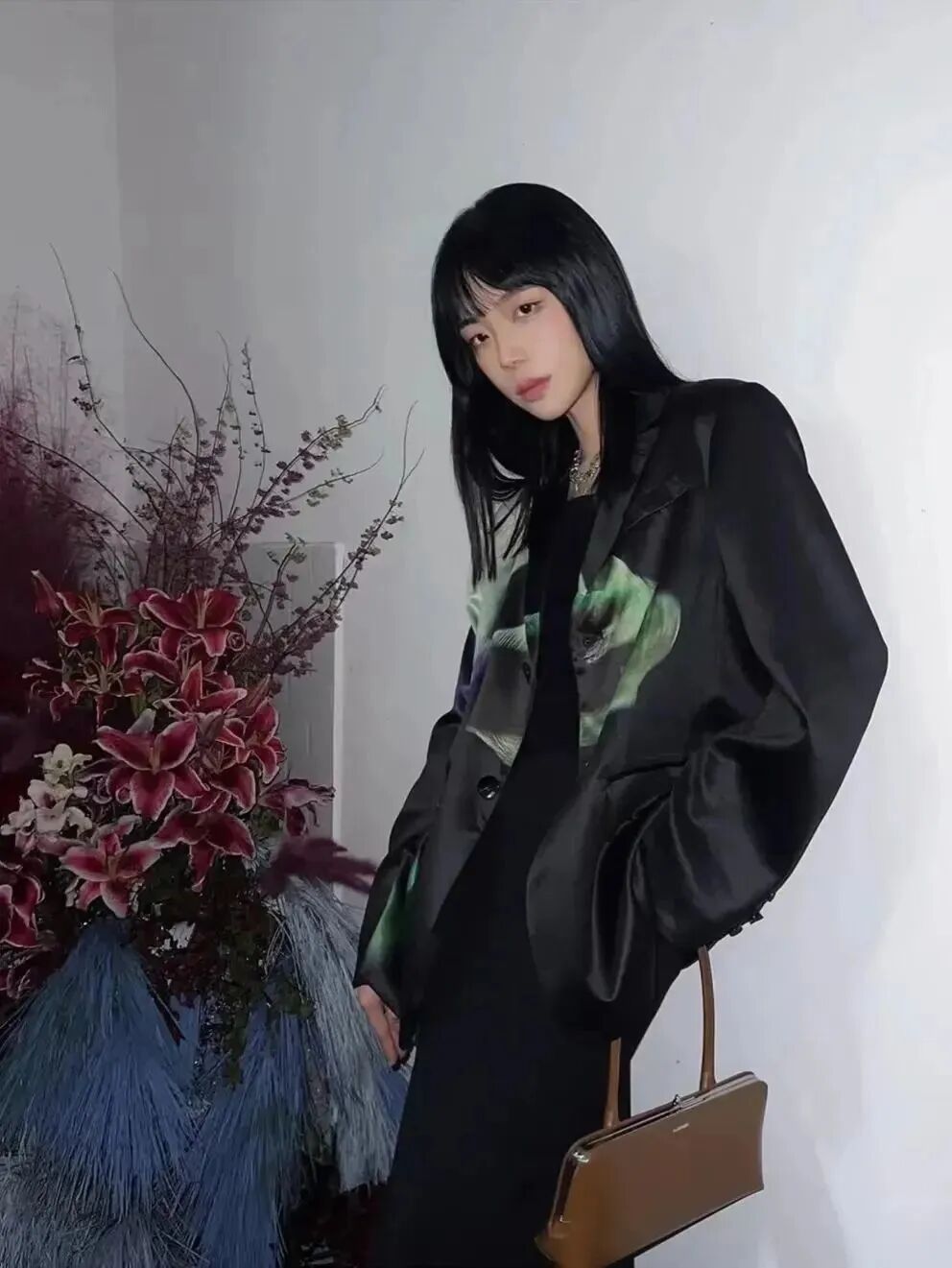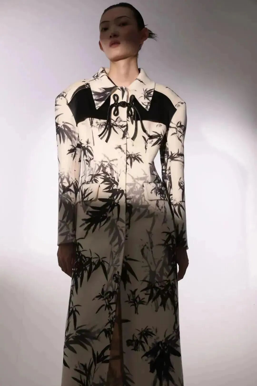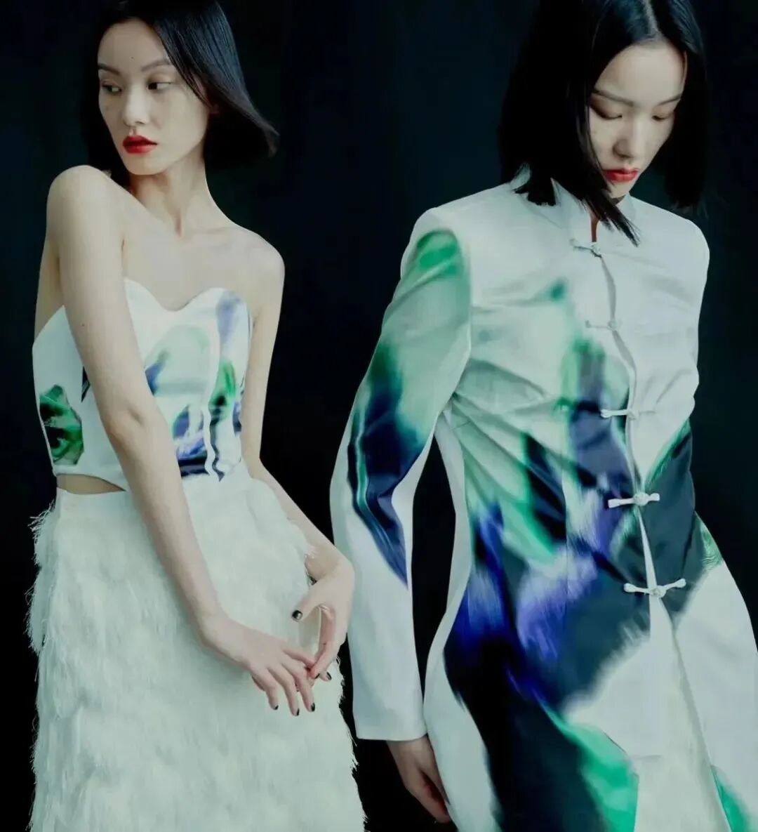 定位水墨印染的鸢尾花恣意生长,无限延续,这种泼墨国画手法打破原有对襟中式服装沉闷的刻板印象,展现出中国文化的洒脱随性。
