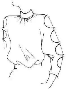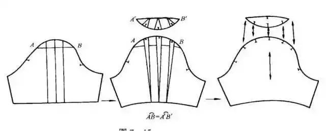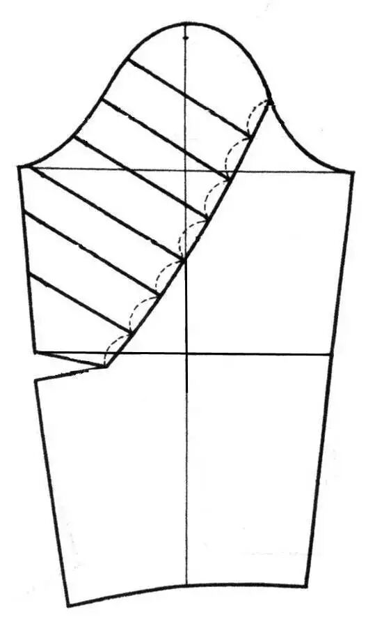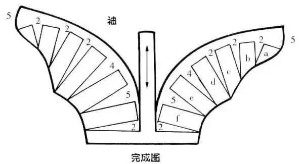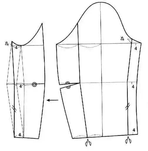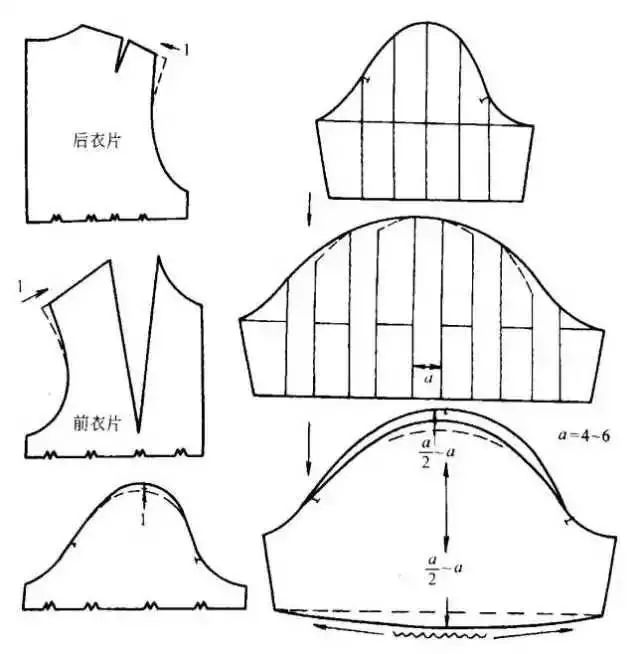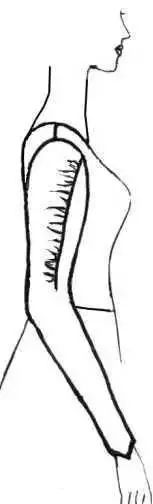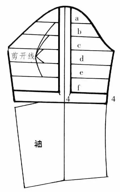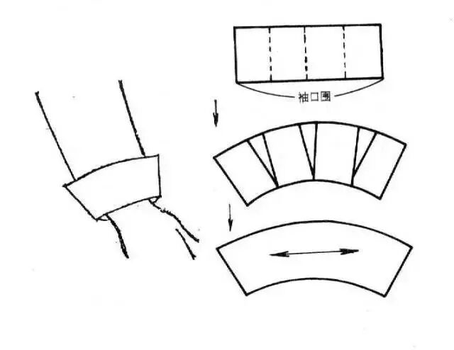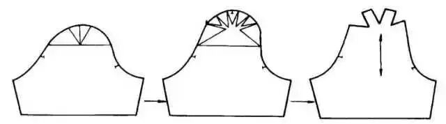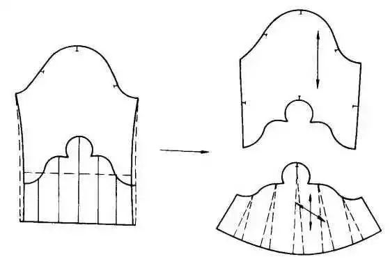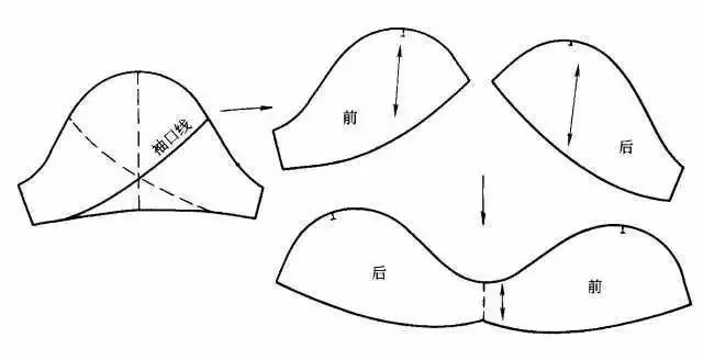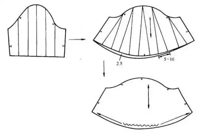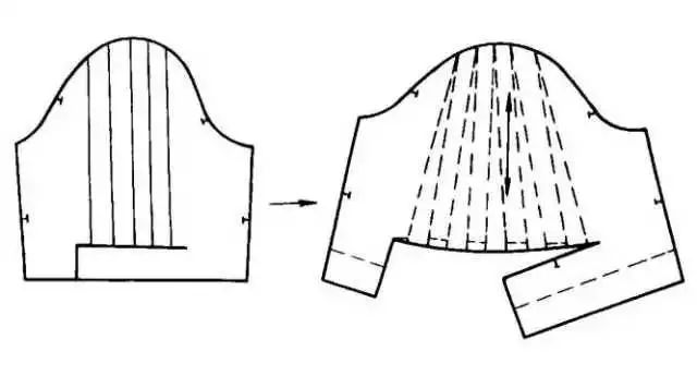 衣袖通过缩褶处理,可形成各式各样的款式,缩褶可设计在衣袖袖口、袖山或其他部位。③在袖山上部画分割线,剪开后向外张开,张开的大小看袖山缩褶份量而定,用曲线修顺袖山。如在袖山处做出三个省位,外形与上图款式相似。制作时按缝省的位置剪开并张开,将张开的位置作省,省端点可放在原衣袖的袖山弧线上。