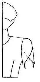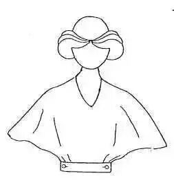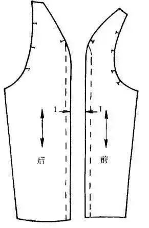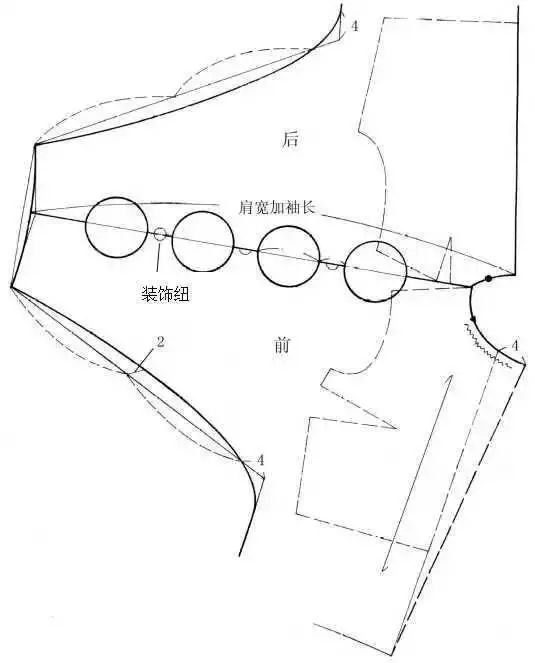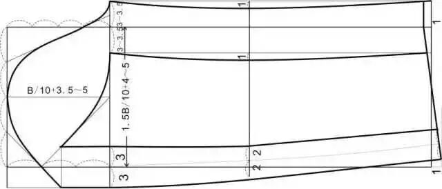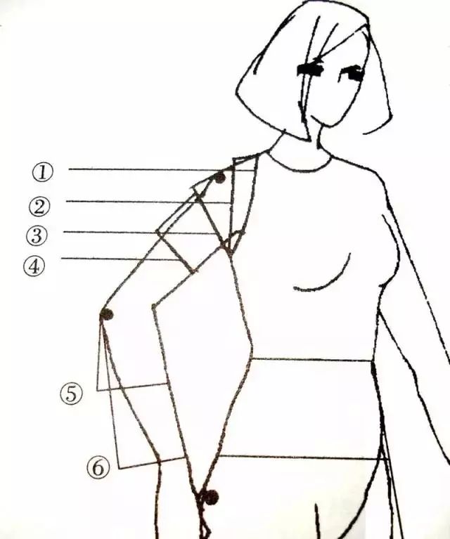 此款式是一种宽袖笼的蝙蝠袖,为了方便手臂活动,肩部不要太斜,也可做成水平状。普通的画法是将肩点提升约2cm,从肩线一直画出袖中线,腋下的肥度没有具体规定,可根据设计的构思而确定。
