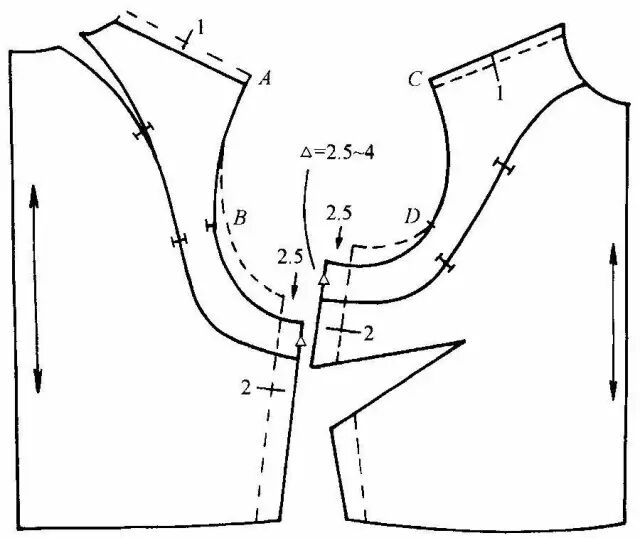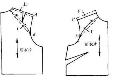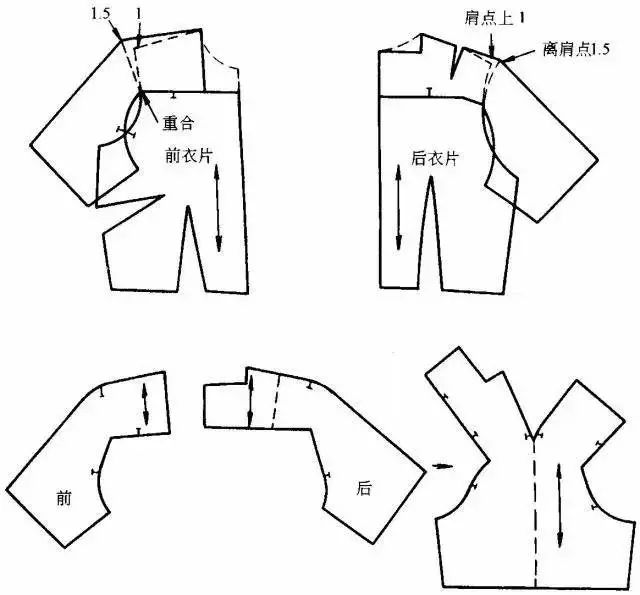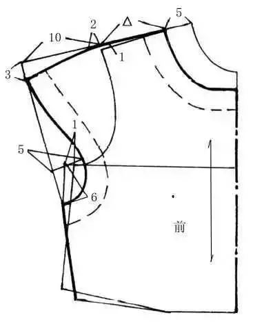 此款式是一种宽育克与衣袖相连的连肩袖。为了不影响服装的合体性,需将衣袖增加的部分,在对应的衣片上减去。此款式由于与袖相连的肩育克较宽,需分开袖中线和肩线。当将衣袖按袖中线分开放在对应的袖山位时,由于原衣袖袖山有缩褶量,一种处理方法可直接去掉容缩量1.5cm;另一种是不去掉缩量,而将肩点提高2cm与袖山对齐,再用线条修顺。