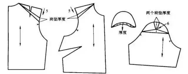 此款式是在肩部加肩垫的衣袖。由于有肩垫,则需要改变肩斜度,改变的大小取决于肩垫的厚度。其制作步骤如下:①根据肩垫的厚度改变衣身前后片的肩斜度,前后衣片从肩点下约5cm处画线至领围与肩线交点处。②剪开这两条线,固定颈侧点将剪开的纸样提高,张开的高度与肩垫的厚度相等,修顺张开后的袖窿线条。这样处理比直接从肩点上升肩垫的厚度要好,可以保持前后肩线缝合后其形成的角度不变。③衣袖从袖山顶点向下约6cm,按图示剪开纸样向两边张开,张开的距离要等于前后袖窿张开尺寸之和,即为两借于肩垫的厚度,从而保证了袖山弧线与袖窿缝合时曲线长度相等。