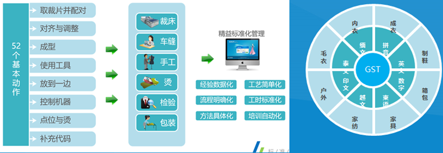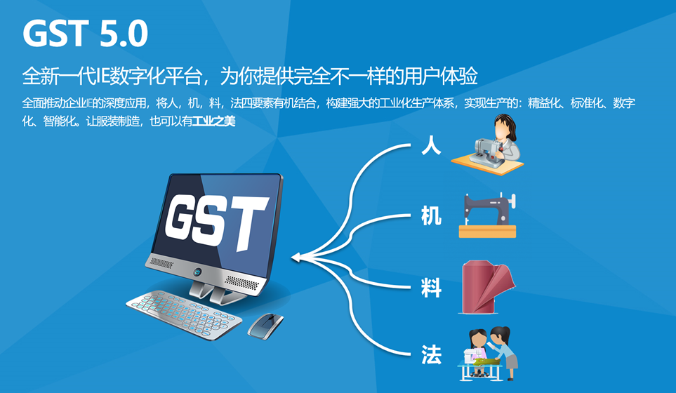 GST5.0作为全新一代IE智能化协同管理平台,不仅拥有先进的管理理念和思想,更是融合AI人工智能、图形识别、5G、大数据、模拟仿真技术、互联网、云计算、云存储等先进技术,可提供智能报价、智能工艺分析、智能派单、智能排位、动态平衡、智能设备调优、智能培训等丰富的的智能化应用工具,为服装企业的IE工程师和管理人员提供完全不一样的用户体验,让精益化、标准化理念轻松落地;