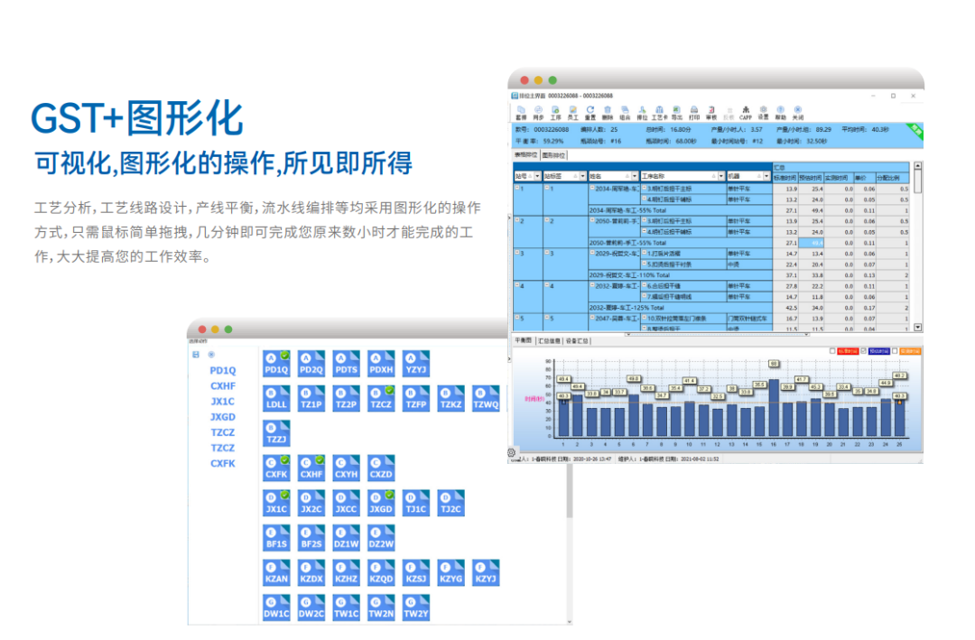 人机分配、车间调度、产线平衡这些工作直接影响着生产流水线的效率,但是又是普通现场管理人员很难掌握的能力,这个时候,我们的智能排位引擎,就可以彻底解决这一问题了。GST基于员工技能数据,工艺路线数据,采用AI人工智能算法,根据不同优先级对员人,机器,工序进行全自动排位,提供最佳排位布局方案和超高排位编程率,算法可自动拆解和组合工序,轻松实现一人多工序、多人一工序、多人多工序的复杂排位要求,在大大提升管理人员的排位的工作效率的同时,提高了车间的平衡率;对小单快反实现快速预排,瓶颈预警,降低排产排位的技术难度,提升了生产现场的快速反应能力。