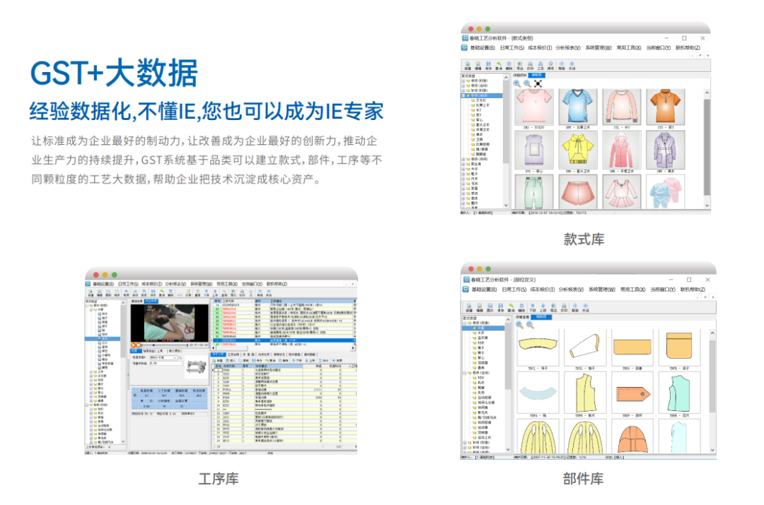 GST5.0是基于春晓十五年来服务的全球2000+家企业和20000+名专业IE工程师的实践经验,在GST3.0的基础上开发出的全新一代智能IE应用系统,从过去的标准数据的产生、管理和输出,延申到标准数据的全面应用,功能覆盖产前、产中、产后各个关键管理环节,通过数字化将人、机、料、法四要素有机结合,全面推动企业IE的深度应用,协助企业构建强大的工业化生产体系,实现生产的精益化、标准化、数字化、智能化,让服装制造,也可以有工业之美。