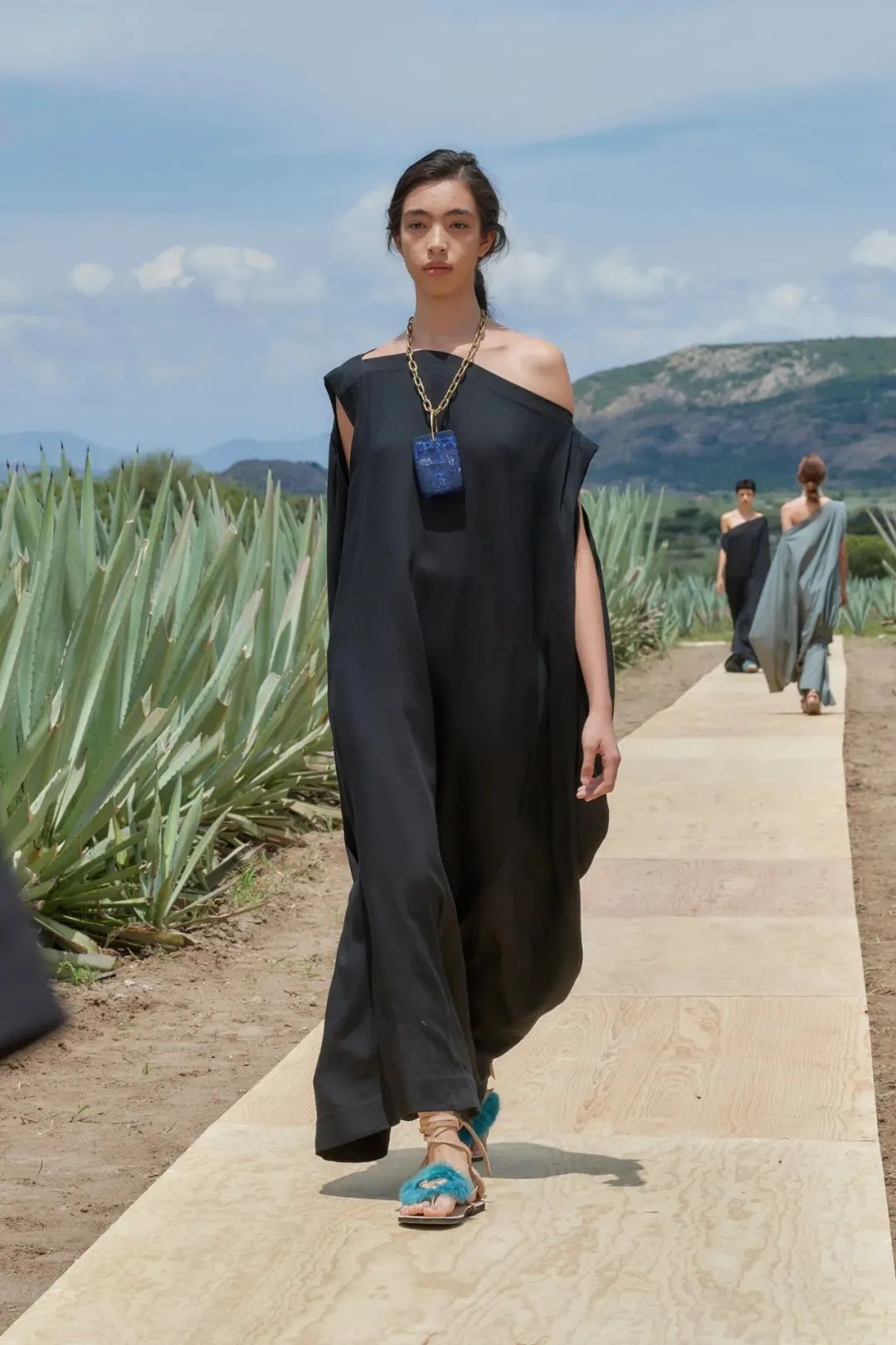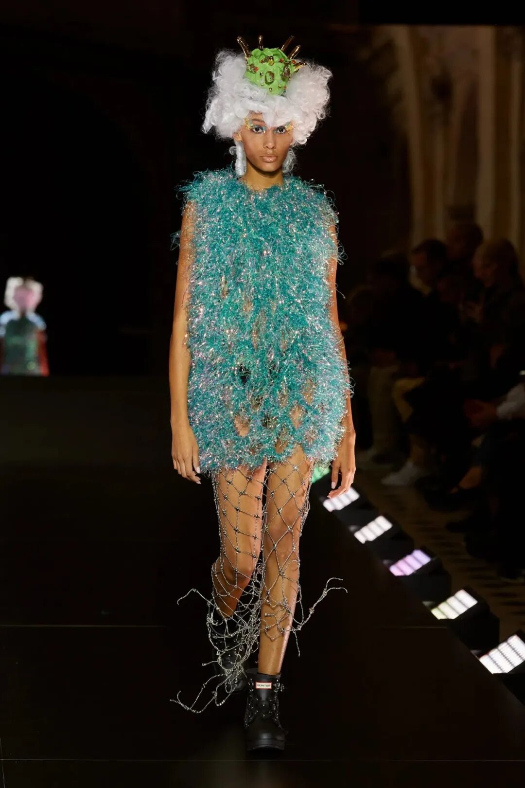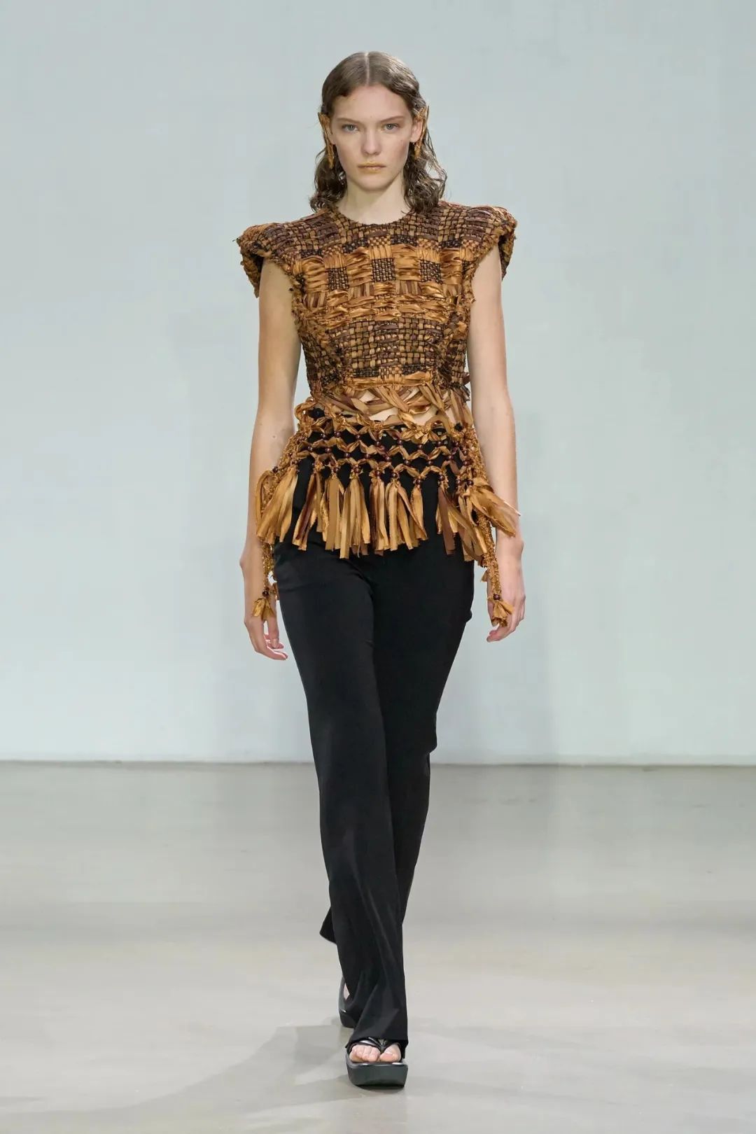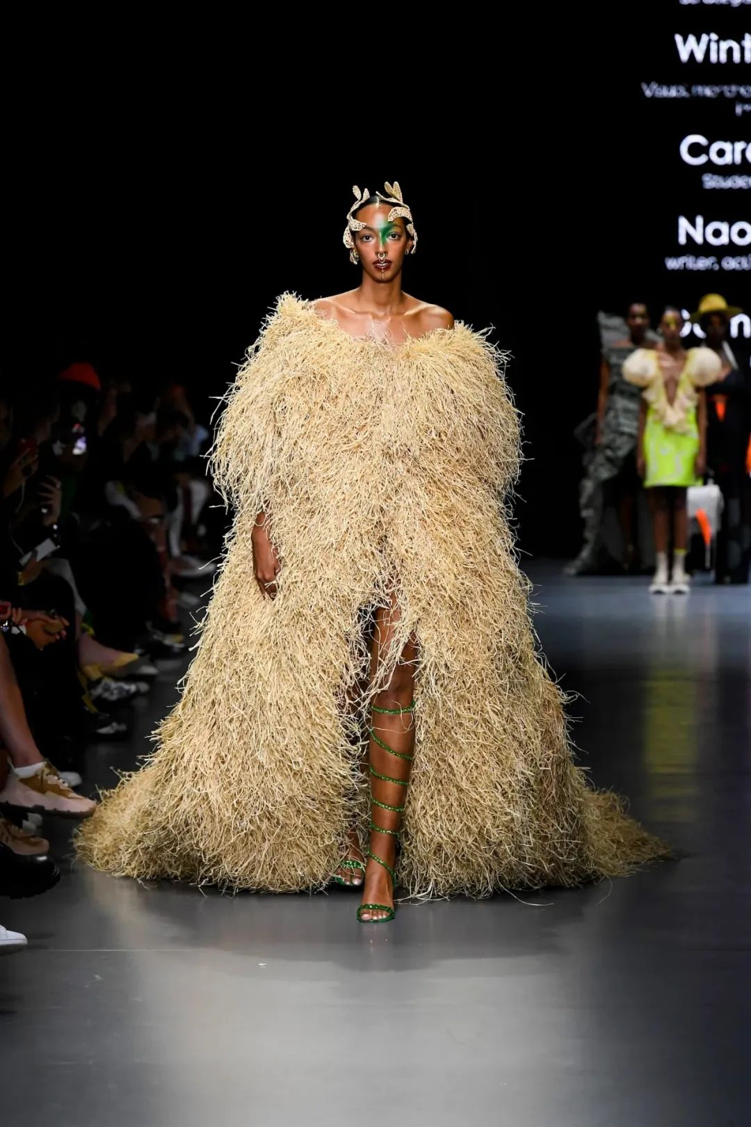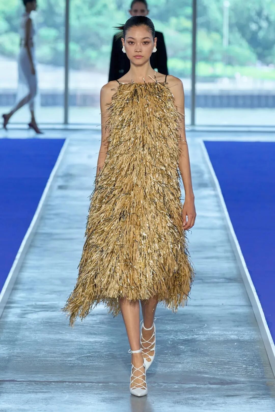 拉菲草、金属丝、羽毛和流苏增强了服装的触感。